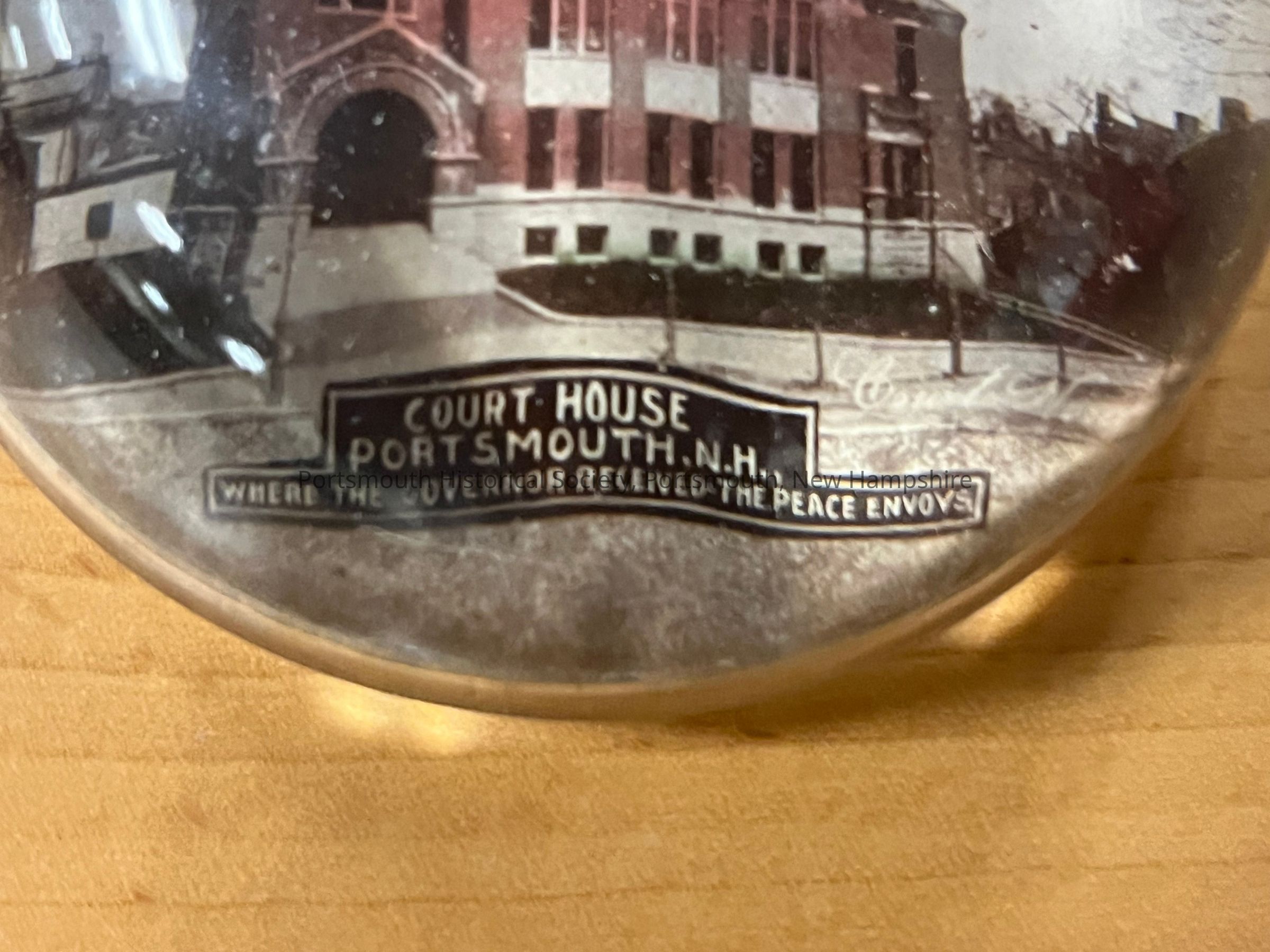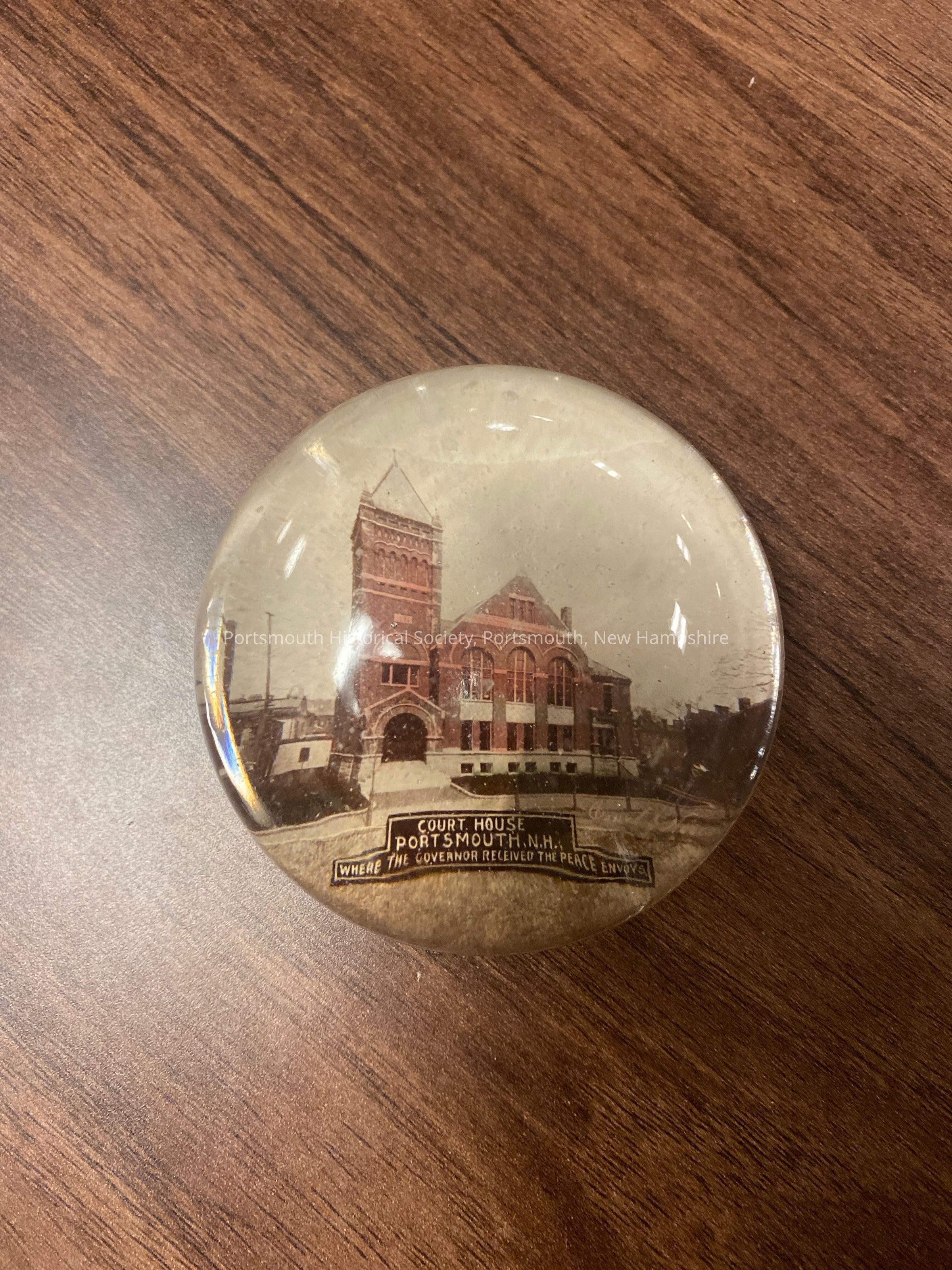 Small, round, paperweight with color photograph of the old Portsmouth Court House. Below the image is the legend: "COURT HOUSE / PORTSMOUTH, N.H. / WHERE THE GOVERNOR RECEIVED THE PEACE ENVOYS."
