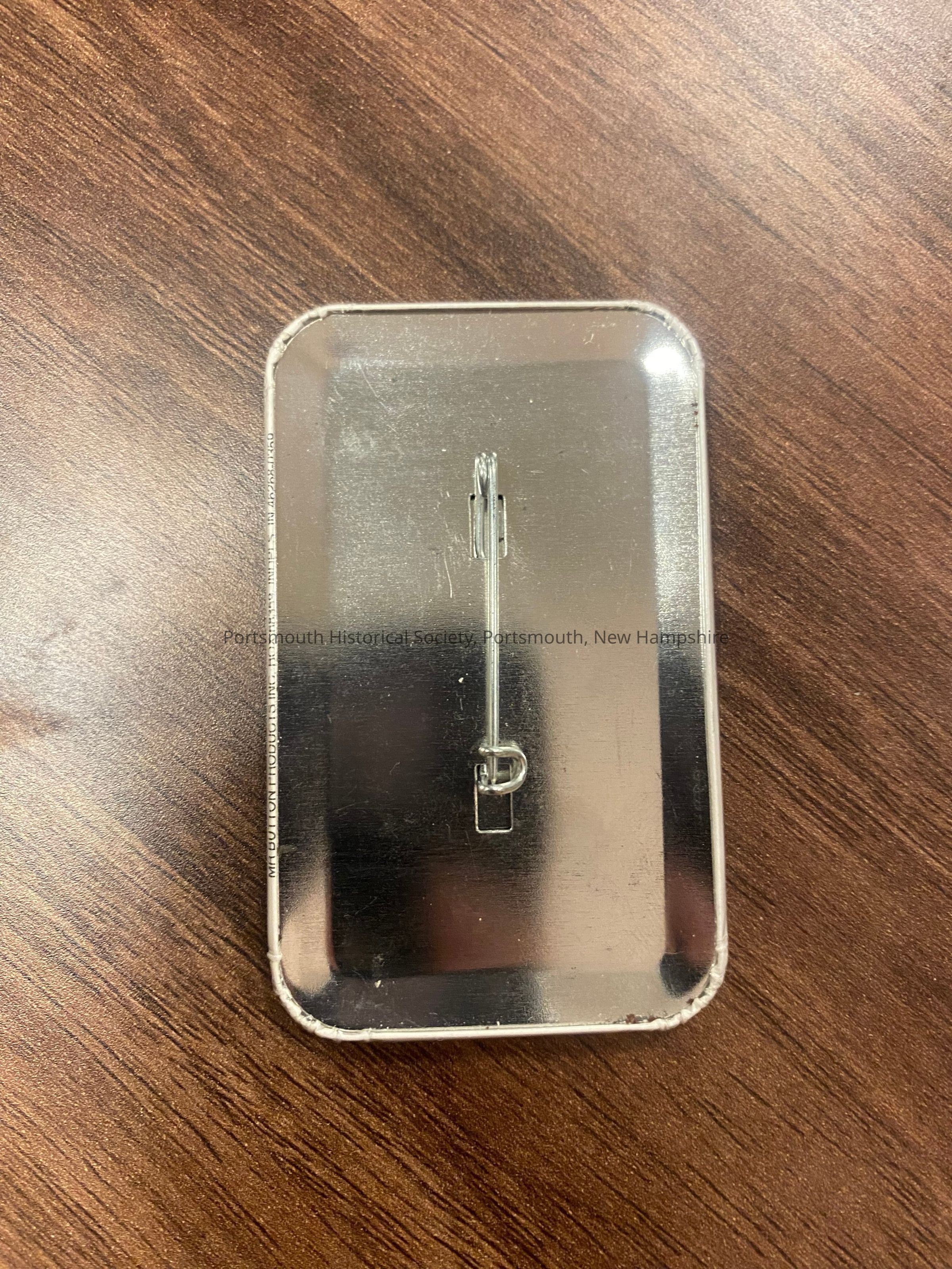 Rectangular pin with rounded corners, and with text on front and with mask, horn, and hands; pin clasp on back.