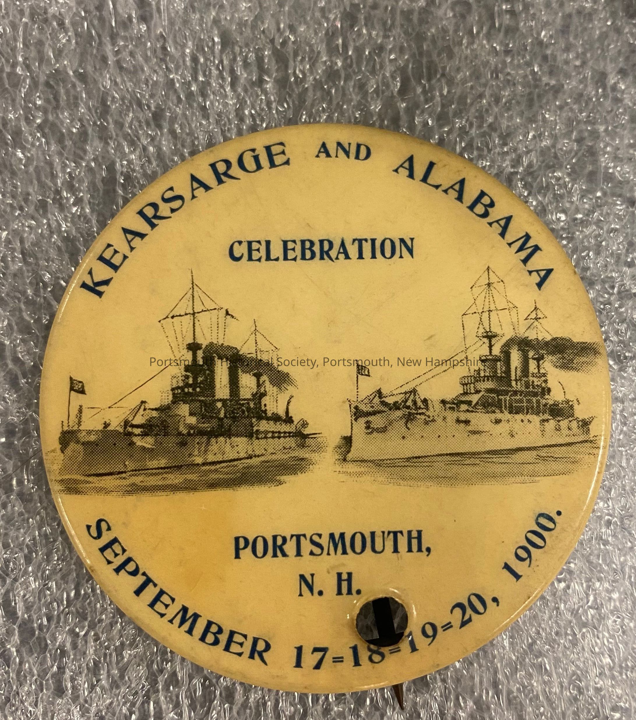 Round pin with blue text and black images against a beige background; "Kearsarge and Alabama / Celebration / [images of two ships] Portsmouth, N.H. / September 17 - 18 - 19 - 20, 1900."Acquisition