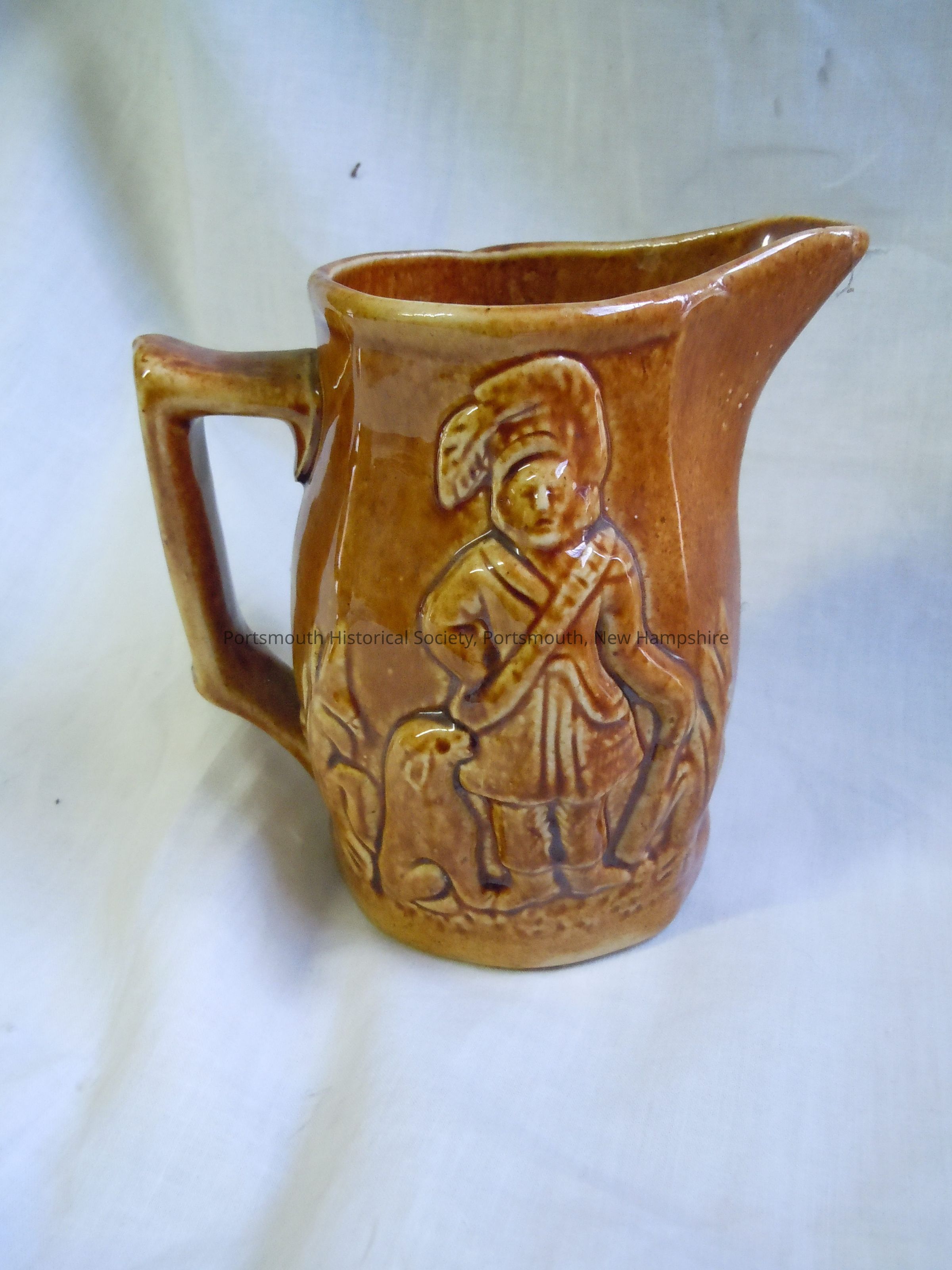 Brown pitcher with image of man and dog on one side, with "Rockingham" glaze.