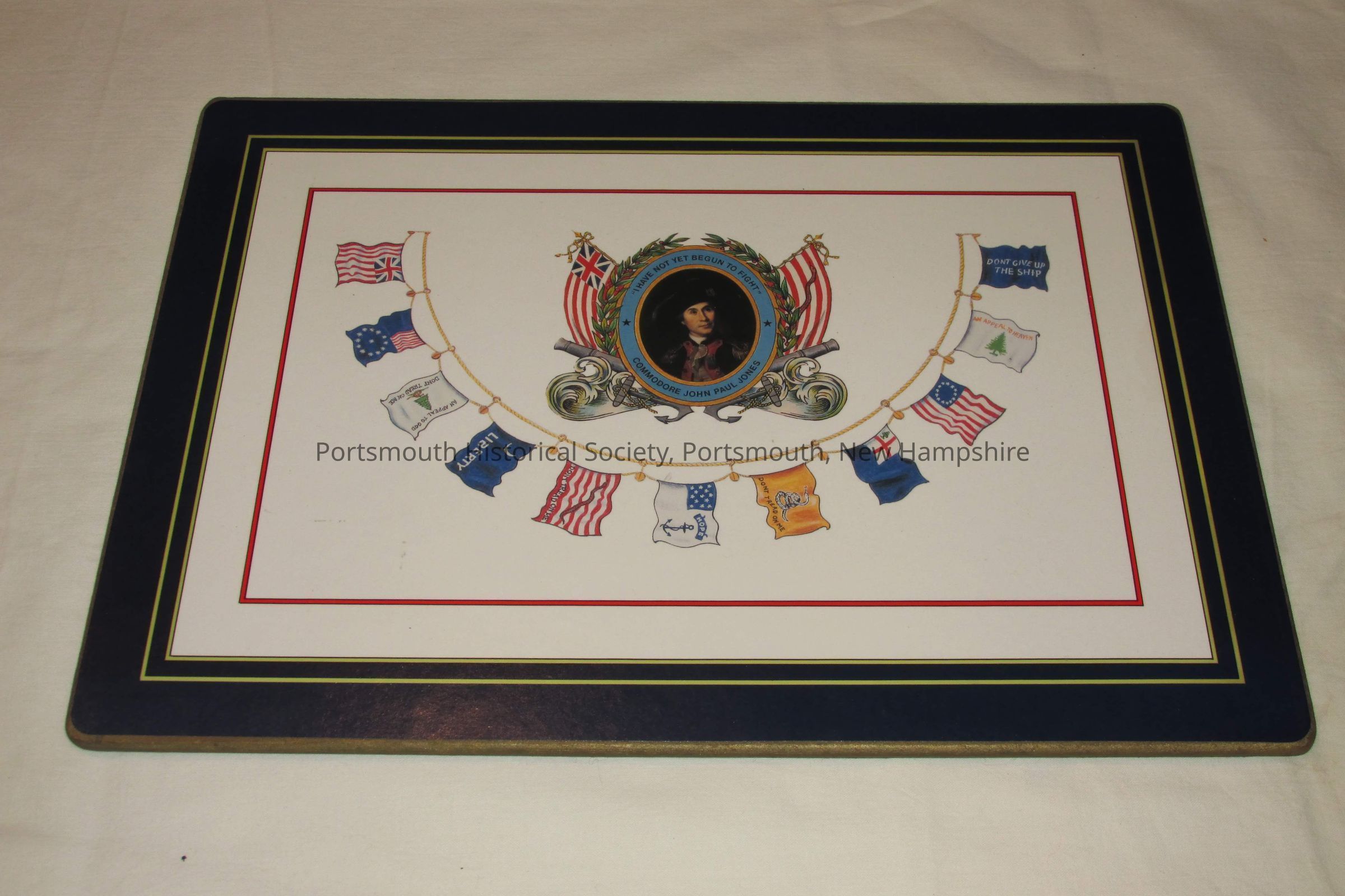Place mat. With image of Peale portrait of JPJ with name and slogan above semi-circular band of 11 flags. Felt back. H. 10 in., W. 14 in.Acquisition