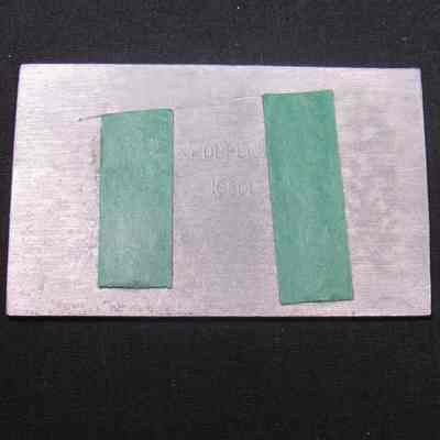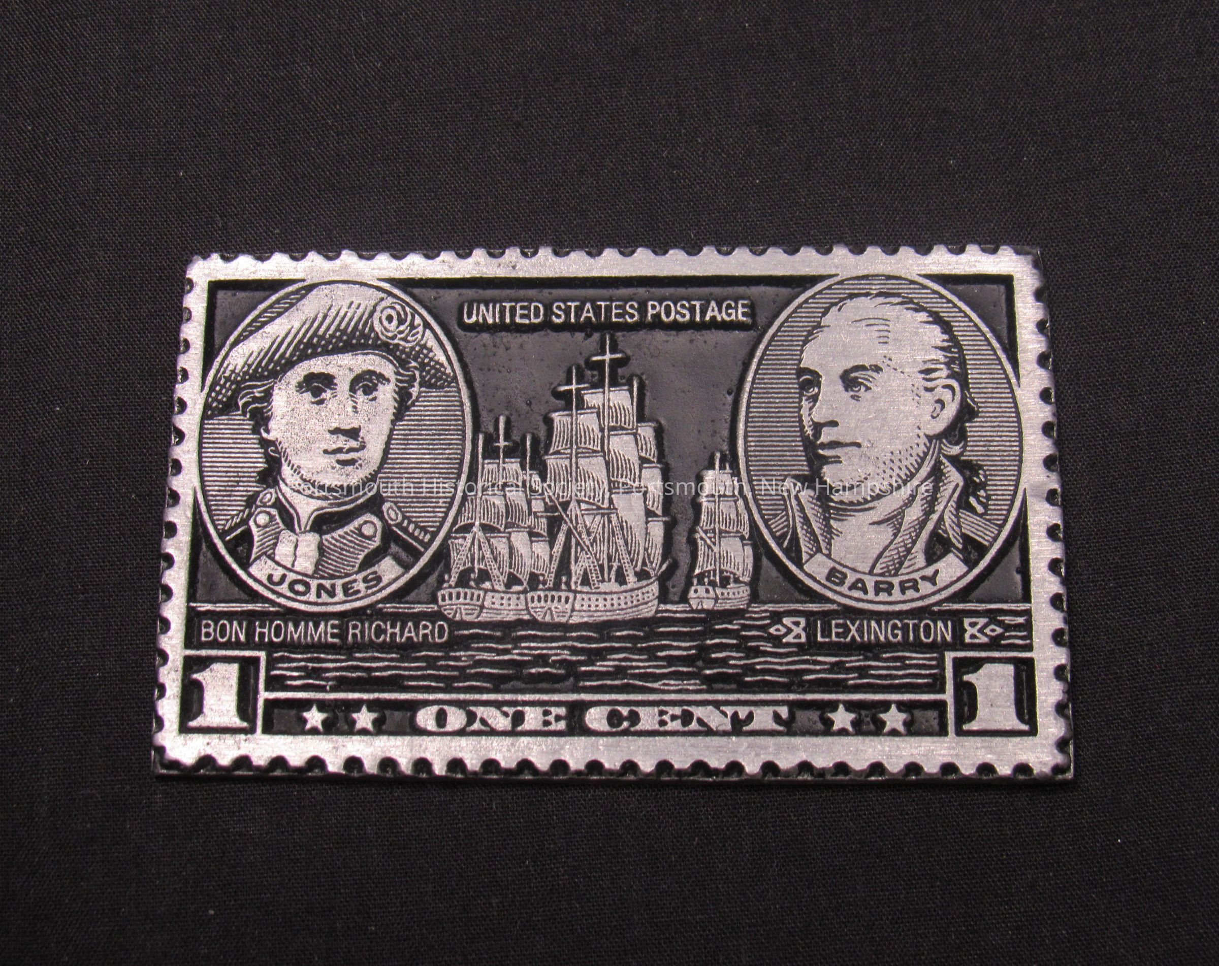 Metal plaque replicating a one-cent postage stamp with JPJ and John Barry issued in 1936. Mark on back obscured by tape.Acquisition