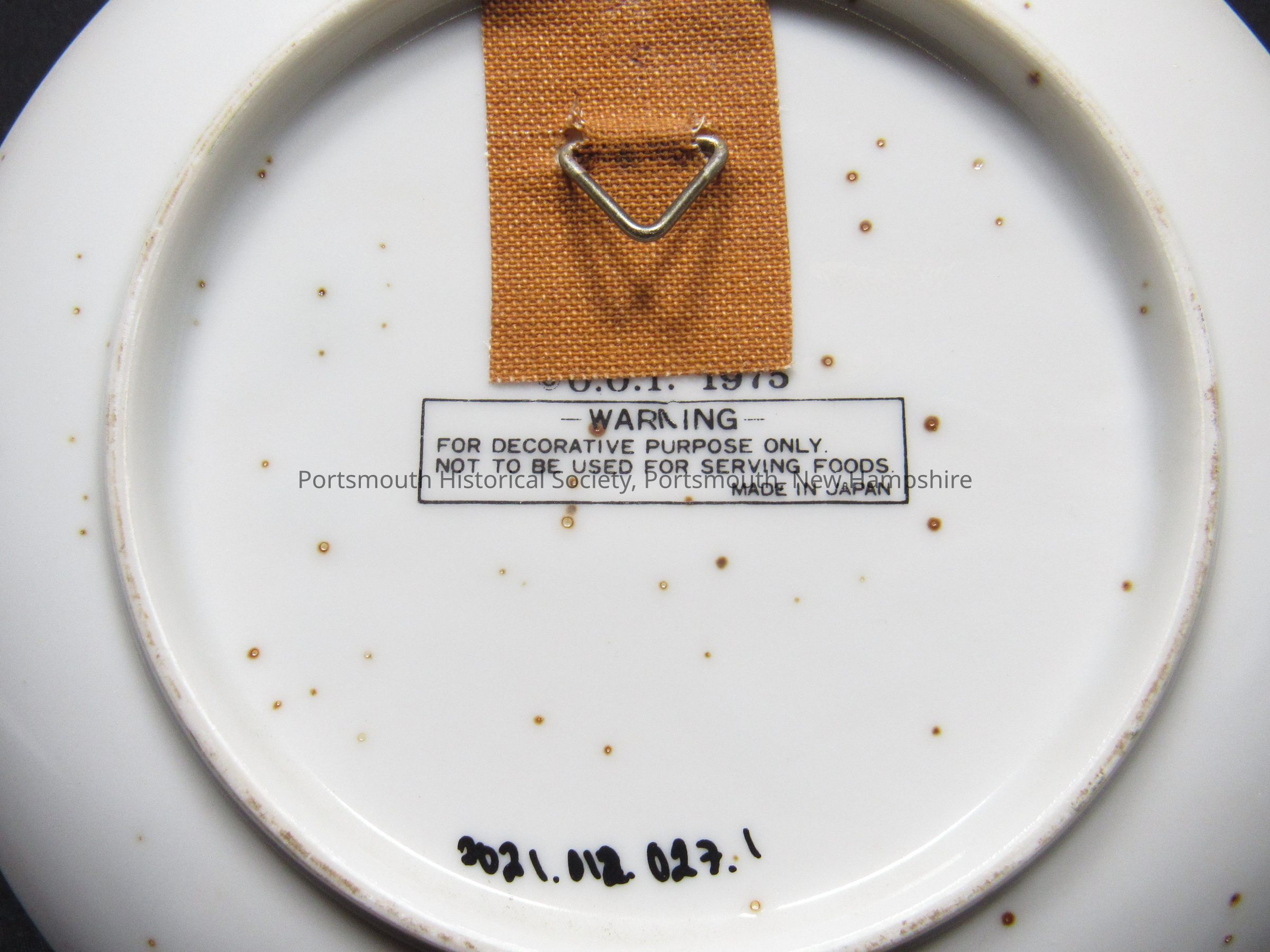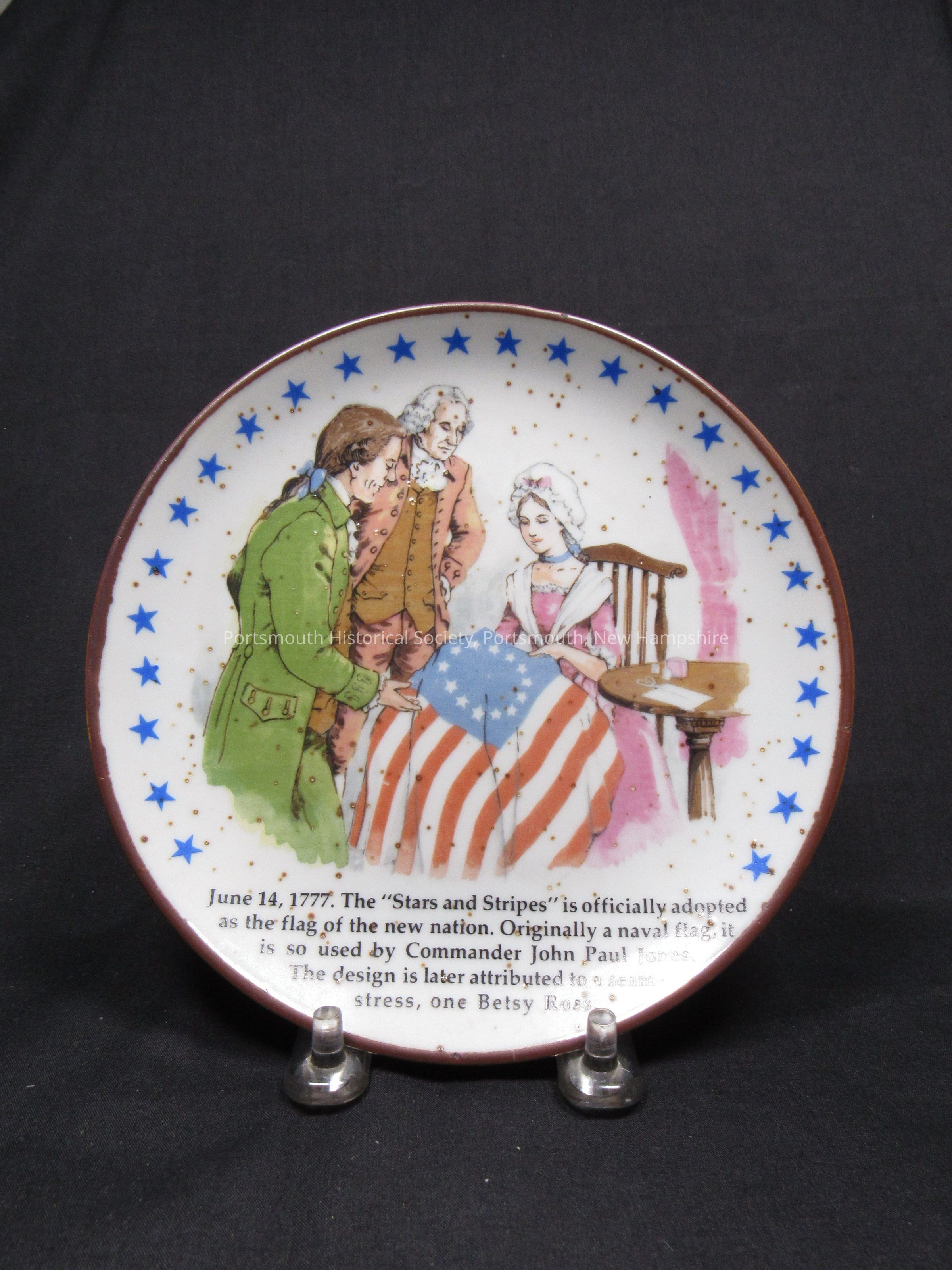 One of six small ceramic plates with polychrome images of colonial revival Revolutionary themes, with brown rim and edging of blue stars, with text. One references JPJ and Betsy Ross; has text: “June 14, 1777. The ‘Stars and Stripes’ is officially adopted / as the flag of the new nation. Originally a naval flag, it / is so used by Commander John Paul Jones. / The design is later attributed to a seam- / stress, one Betsy Ross.” Each marked on back “Made in Japan” and “[copyright] 0.0.1. 1975.” Diam. 6 1/8 in. NB: low quality ceramics, most fitted with added hanger. Additional text: “WARNING / FOR DECORATIVE PURPOSES ONLY. NOT TO BE USED FOR SERVING FOODS.”Acquisition
