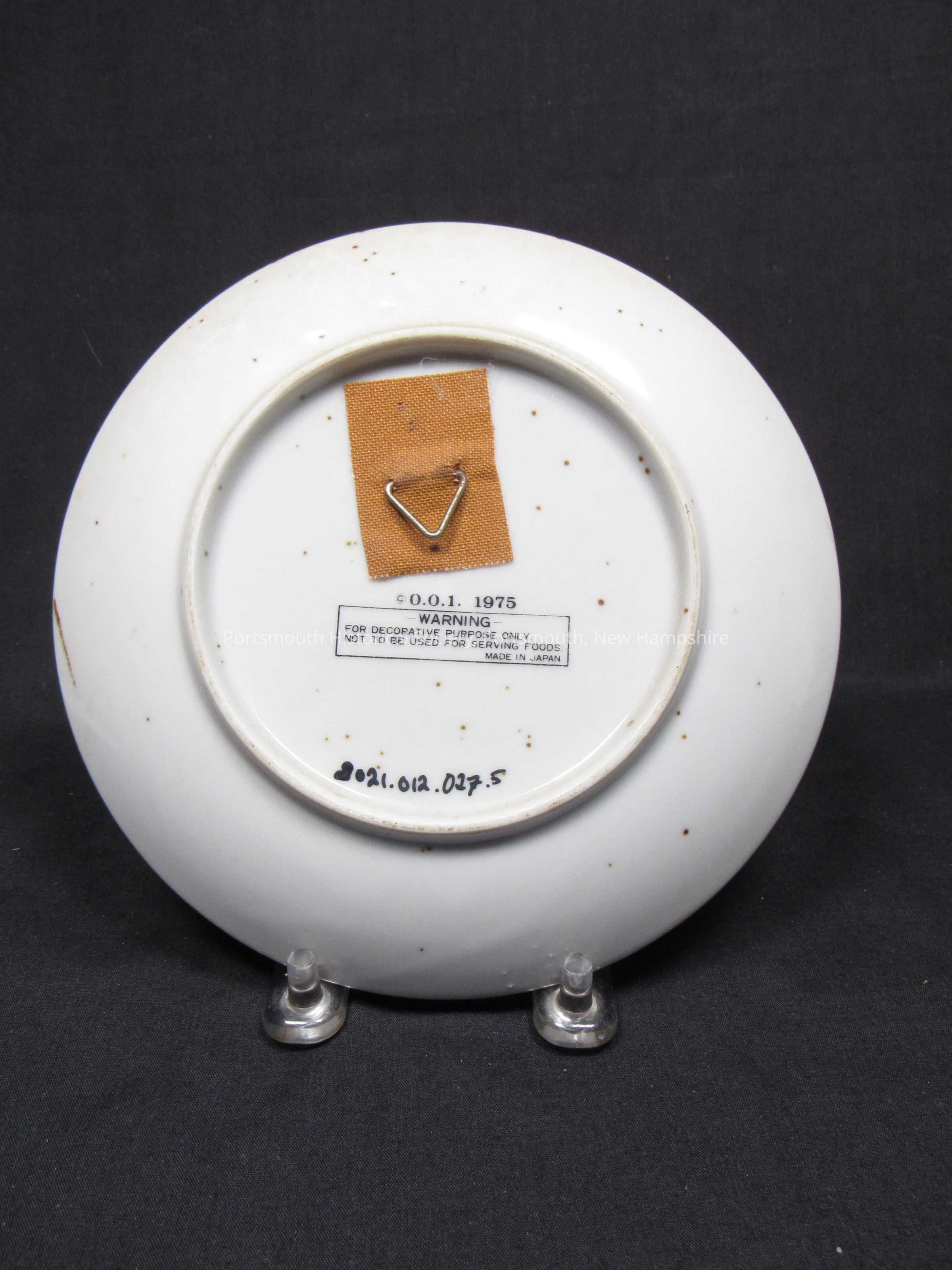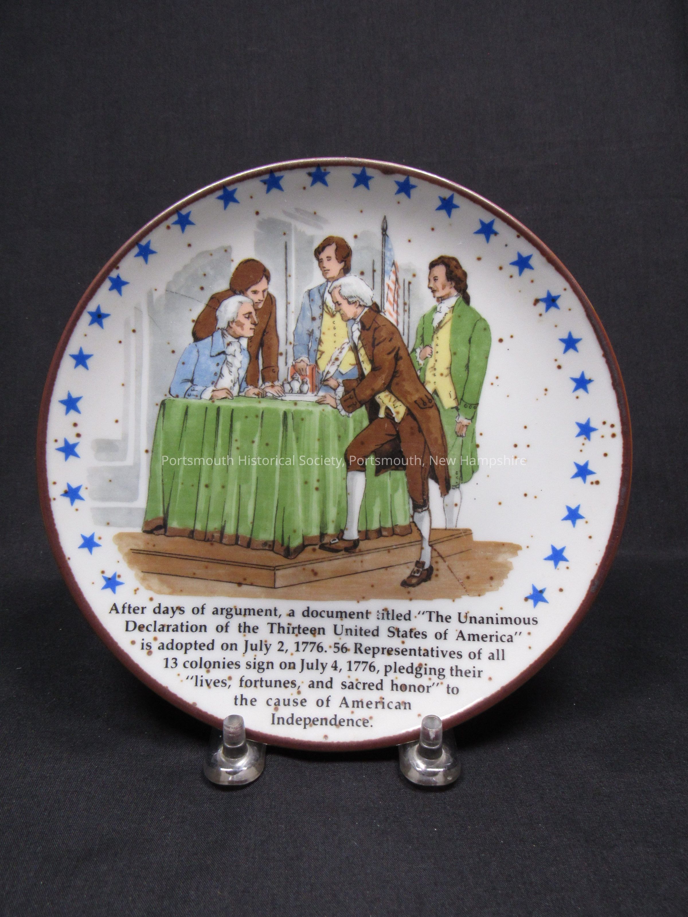 One of six small ceramic plates with polychrome images of colonial revival Revolutionary themes, with brown rim and edging of blue stars, with text. This one depicts the signing of the Declaration of Independence and says;" After days of argument, a document titled "The Unanimous Declaration of the Thirteen United States of America" is adopted on July 2, 1776. 56 Representatives of all 13 colonies sign on July 4, 1776, pledging their 'lives, fortunes, and sacred honor' to the cause of American Independence." Each marked on back “Made in Japan” and “[copyright] 0.0.1. 1975.” Diam. 6 1/8 in. NB: low quality ceramics, most fitted with added hanger. Additional text: “WARNING / FOR DECORATIVE PURPOSES ONLY. NOT TO BE USED FOR SERVING FOODS.”Acquisition