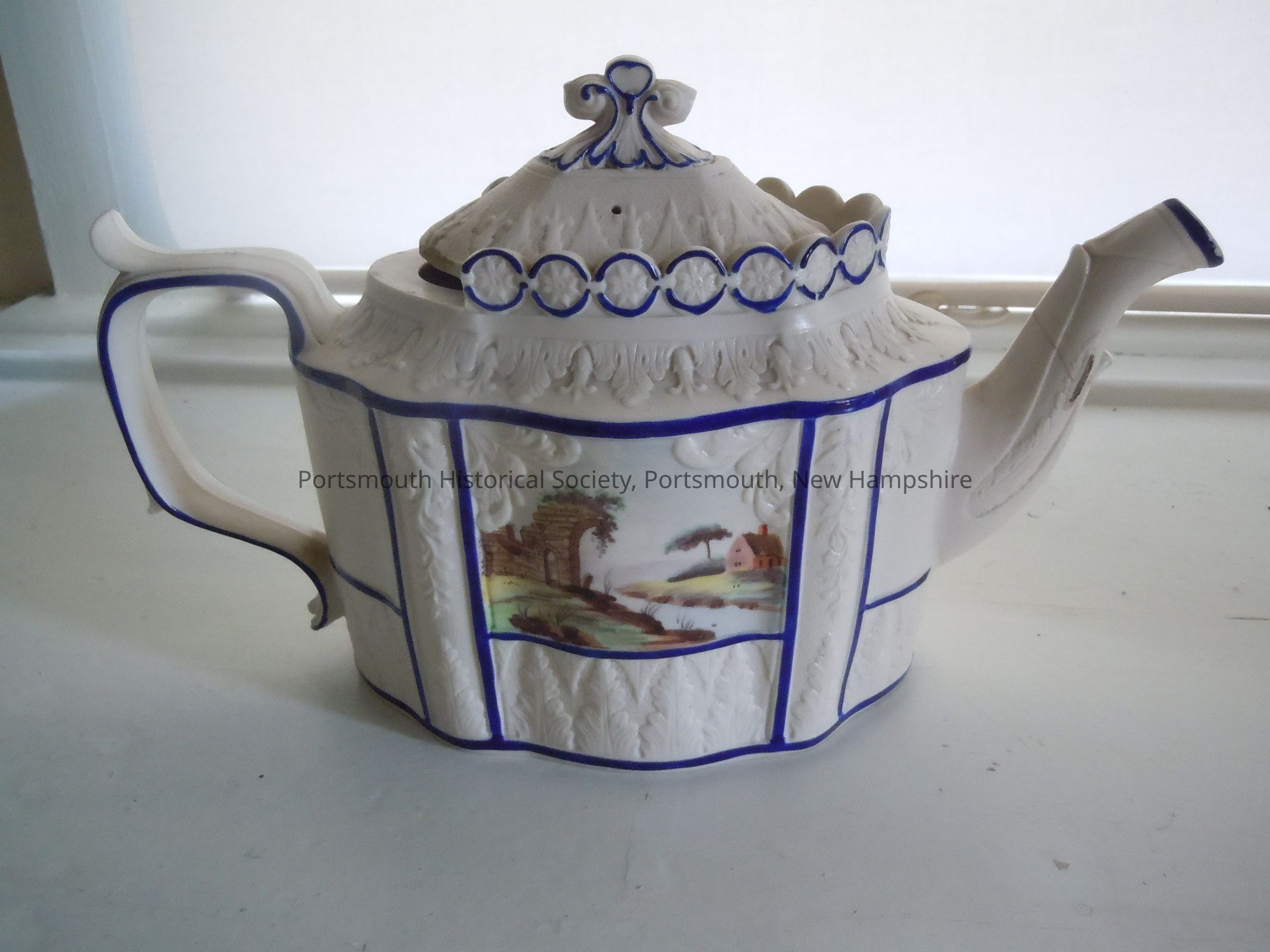 Castleford-style teapot with lid. White feldspathic stoneware with molded body and applied relief decoration, with designs outlined in blue. Landscape painted and outlined in blue; glazed interior.
