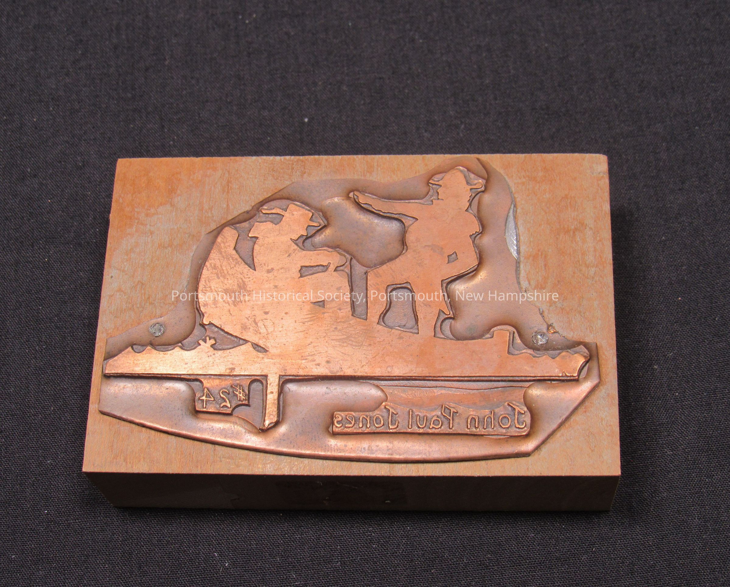 Printing block featuring JPJ standing and pointing, with a sailor, and with "#24" (in reverse). Copper on wood block.Acquisition