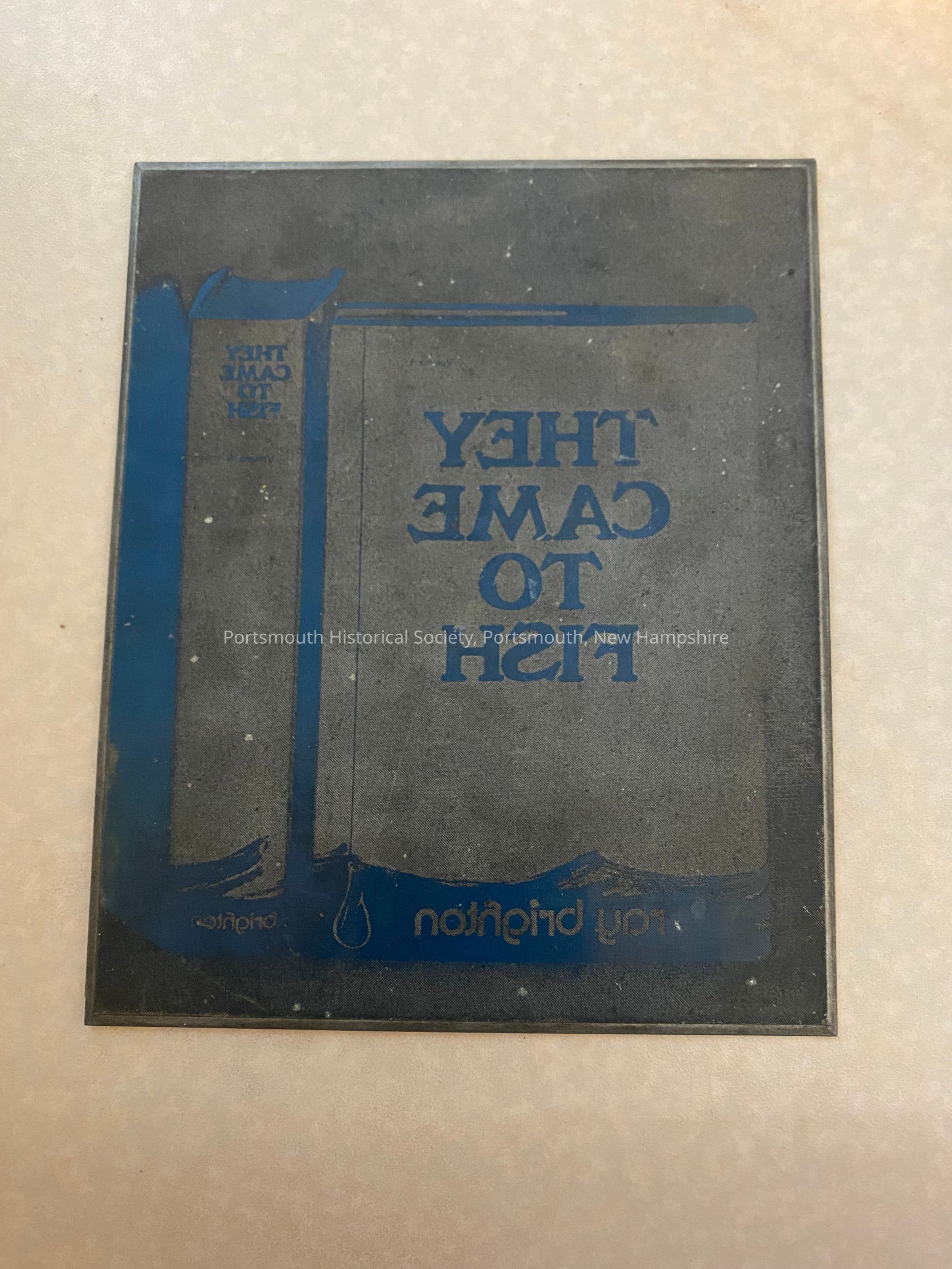 Metal plate for "ThEY CAME TO FISH" by "ray brighton"; first published in 1973; design same as front and spine of book jacket, may have been used in advertisements. On back reads "Micro-Metal" above "Ball" trademark in shield, with "MADE IN USA" twice (one inverted) and the number " 3 22" with an indistinct smudge at end.Dimensions