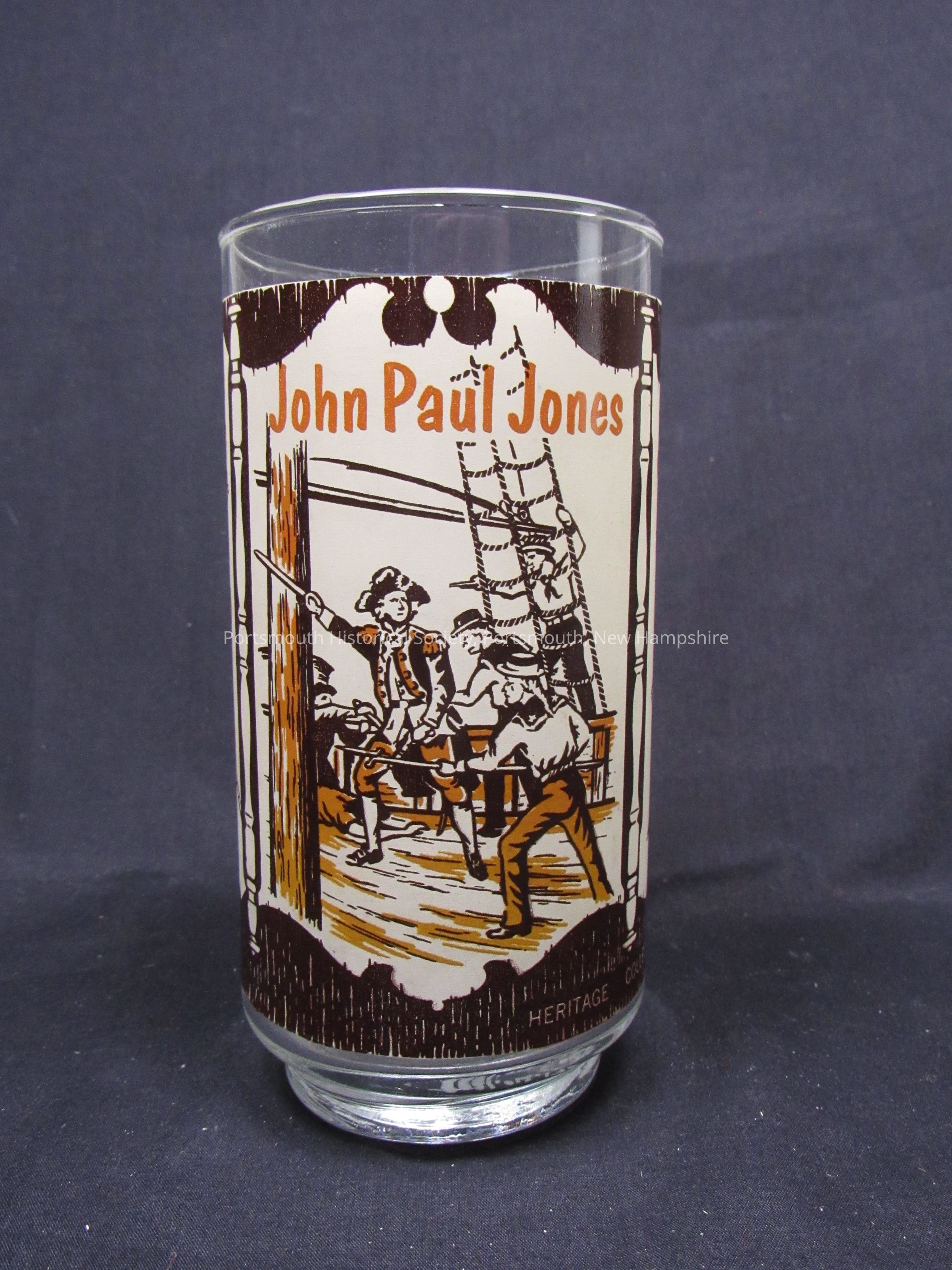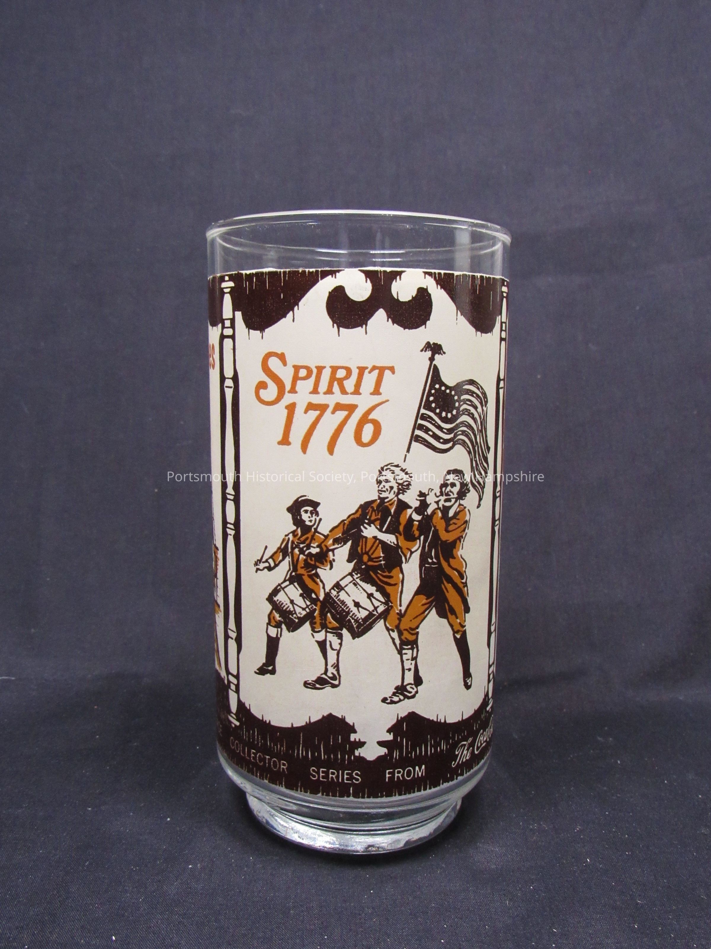 Drinking glass featuring John Paul Jones, Spirit of ’76, and Nathan Hale, Coca-Cola Heritage Collectors Series, ca. 1976. Clear glass with applied decoration. (Same as 2021.012.170)Acquisition