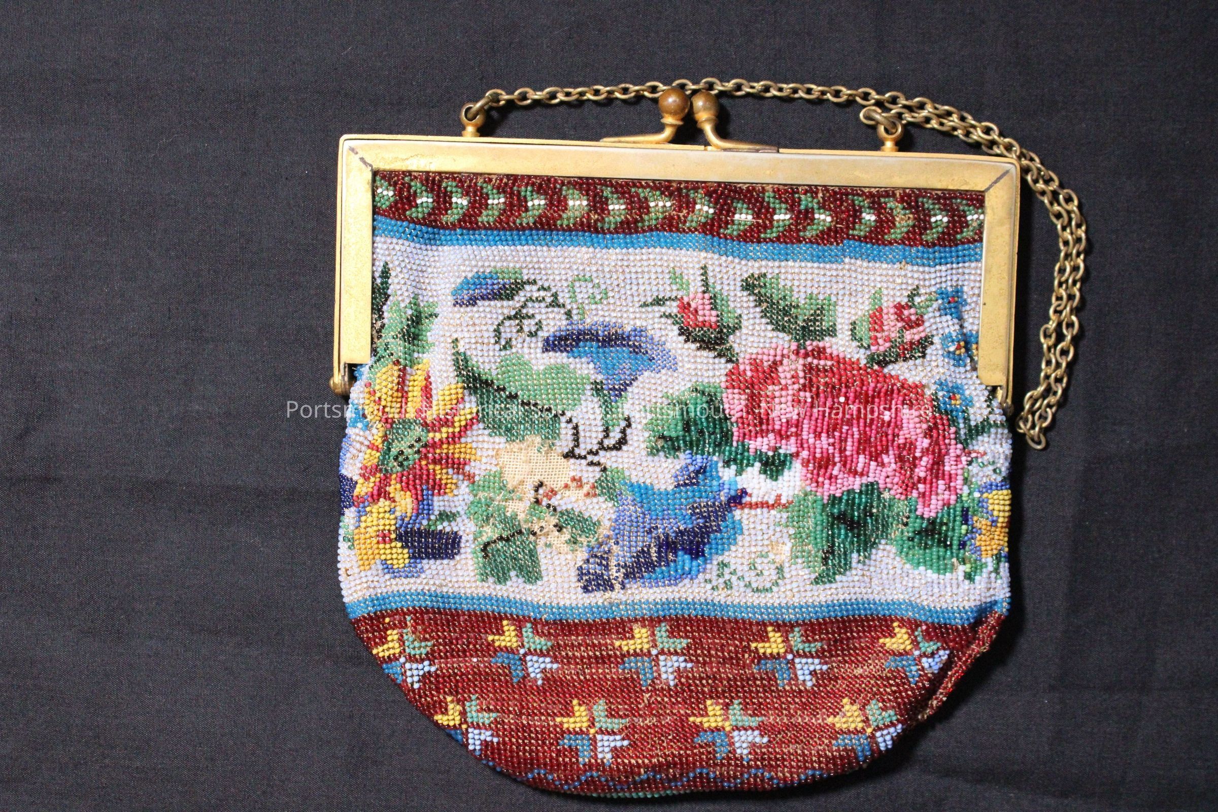 Beaded purse on a metal clasp frame with metal chain strap. Beads form a floral pattern. Label inside says Bradford 9a. Early 19th C. with later frame.