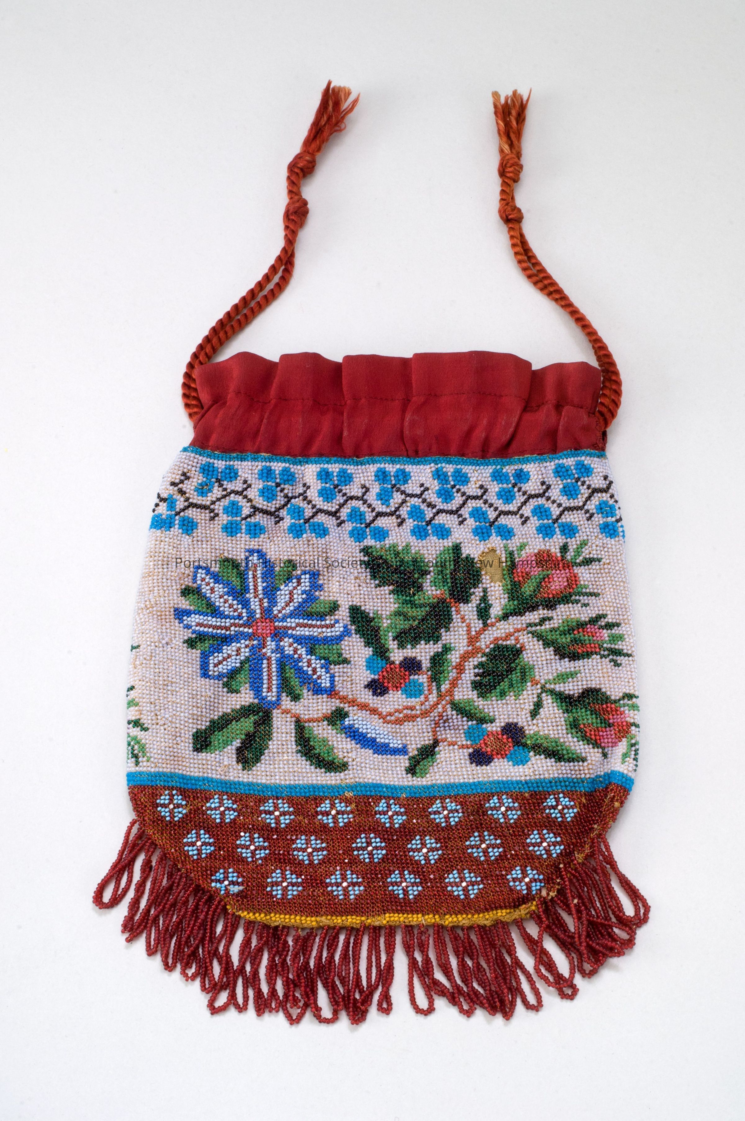 Beaded purse, multicolored floral pattern and drawstring. Red base fabric and red bead loop fringe at bottom. Label in ink inside purse: "S. Jewett." Early 19th C. Miss Susan JewettAcquisition