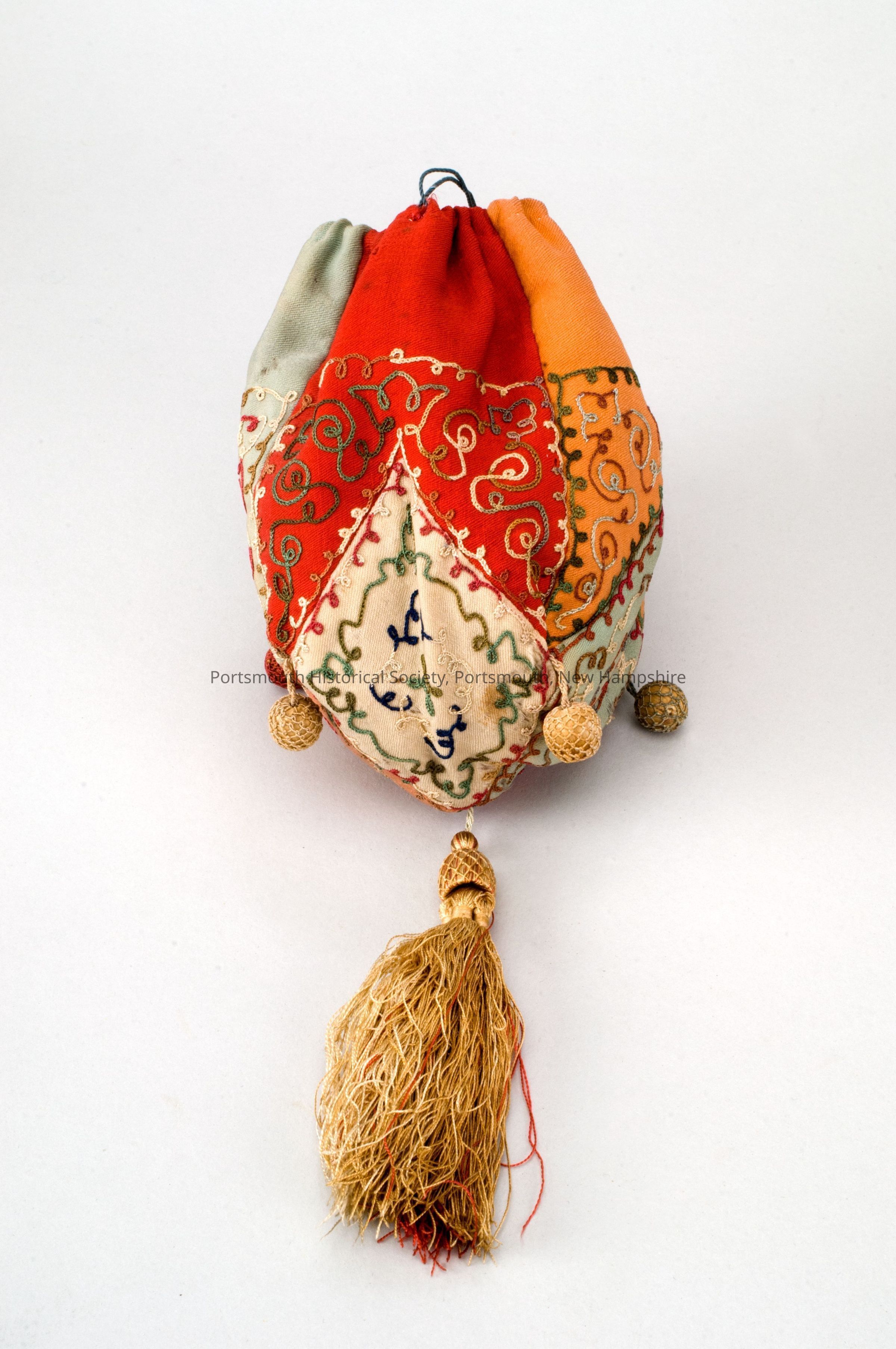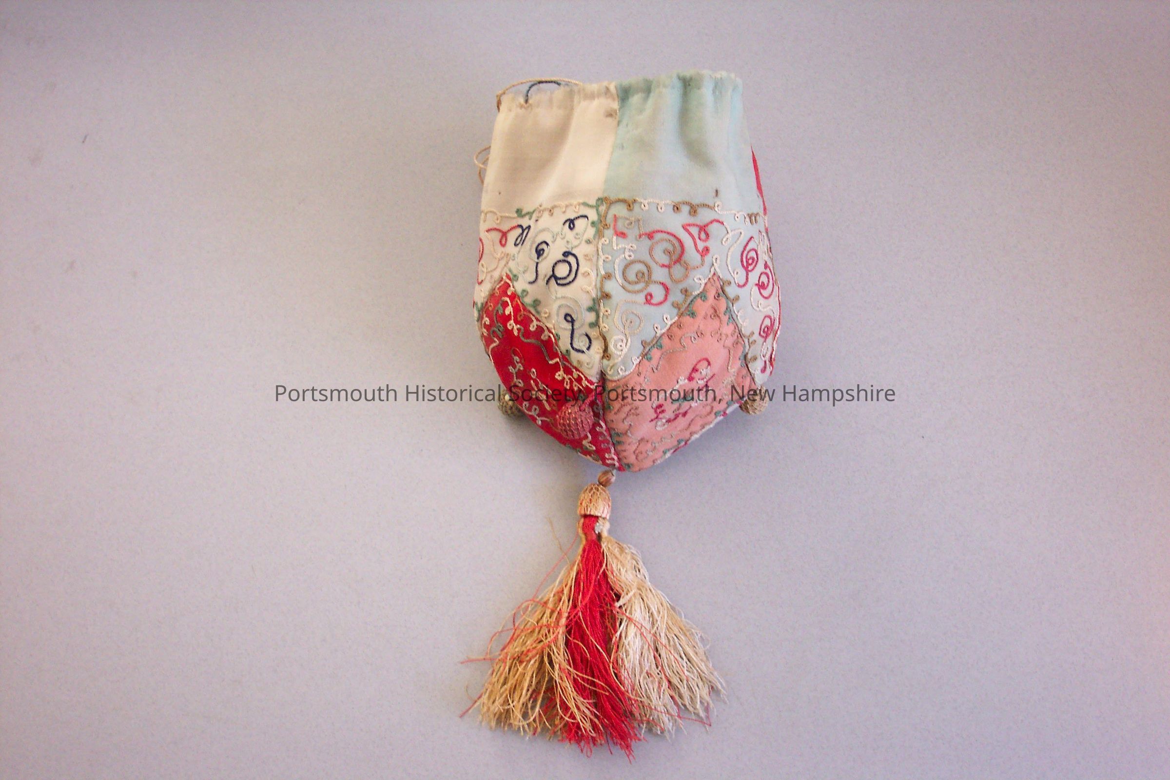 Patchwork (green, red and pink) purse with embroidery in green, navy, red, and cream. Purse has a tassel fringe at bottom and four other colored ball tassels on sides. Tag with red border attached to inside of the purse. The tag says "S.Jewett" on it.