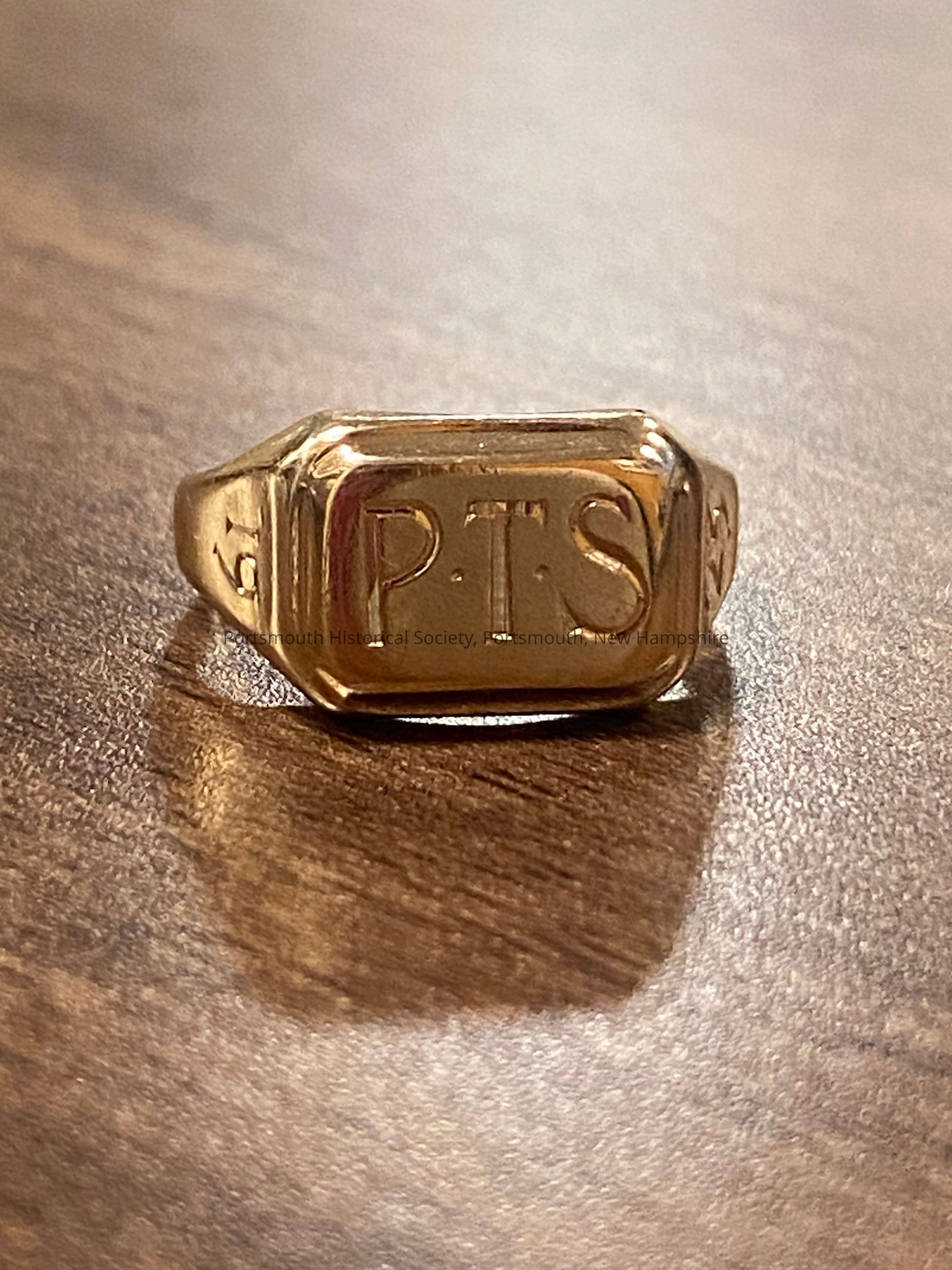 Small gold ring from the Portsmouth Training School. The flat top surface is engraved with "P.T.S" in the rectangle and "19" on the proper left and "23" on the proper right. On the inside band is a quality mark reading "XI0K".Acquisition