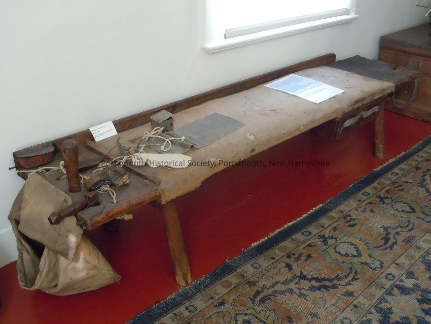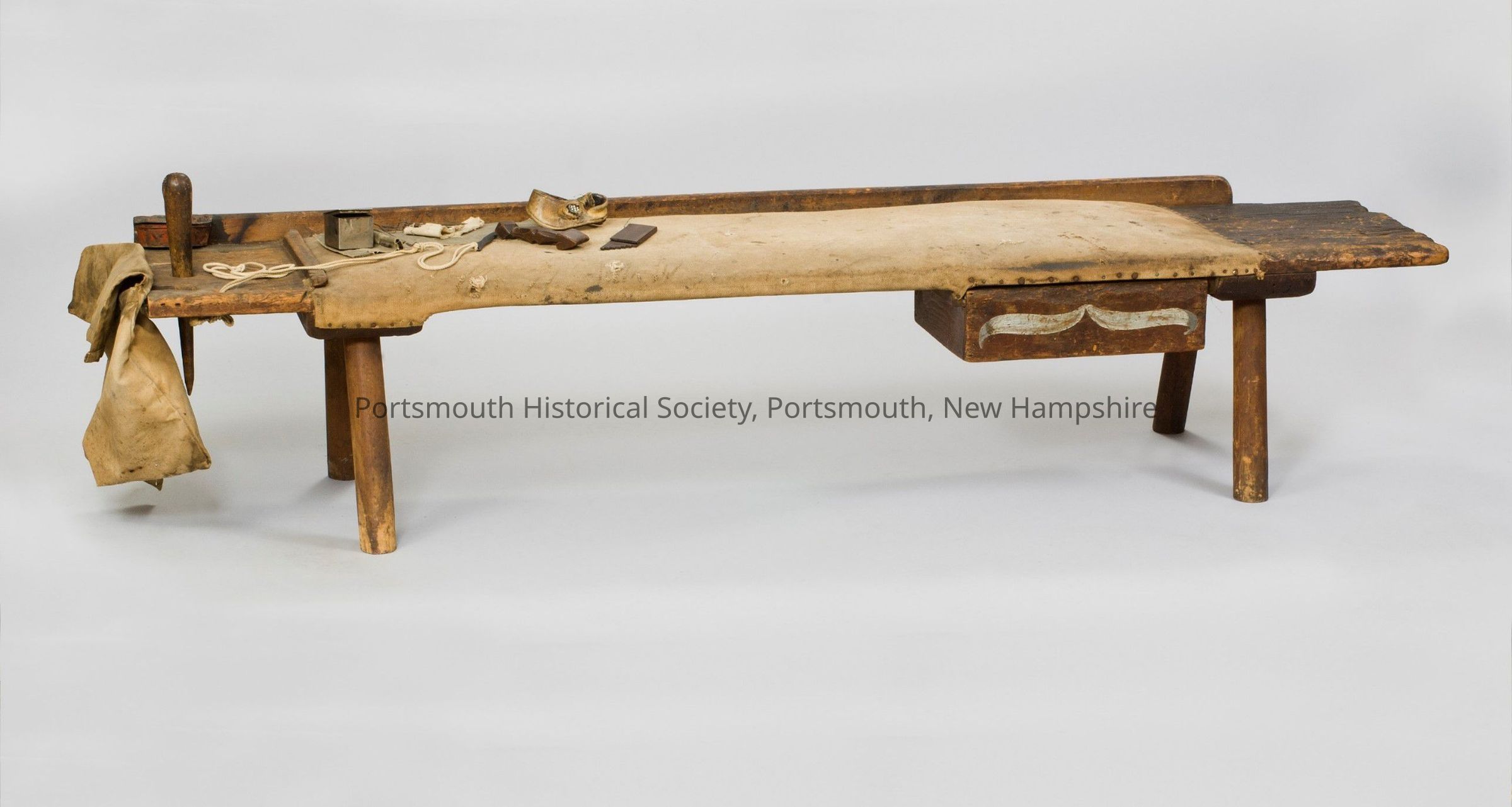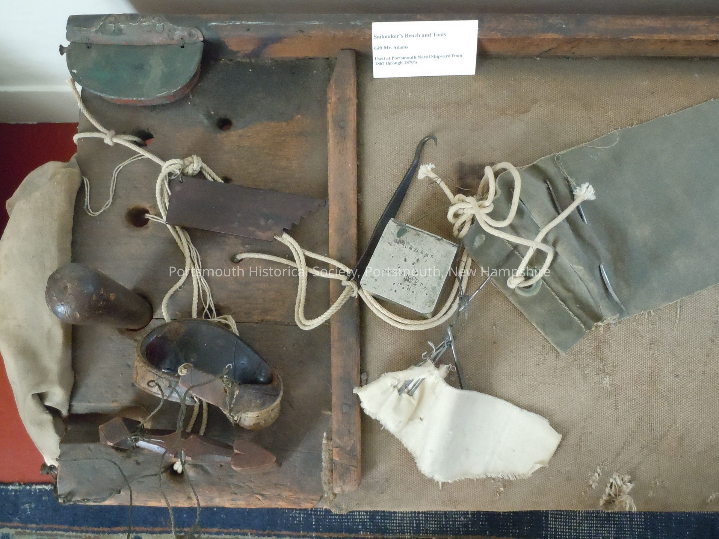 Sailmaker's bench and accessories: wooden fid, needles (curved and straight three-cornered ones), canvas, silver box, 2 leather palms, 2 wooden seam and measuring devices, metal box (says J.W. Adams Portsmouth) attached to bench. Also a canvas bag attached to bench, a sample of thread used by sailmaker, and a metal hook to hold the canvas sail down as it was being sewed.Acquisition