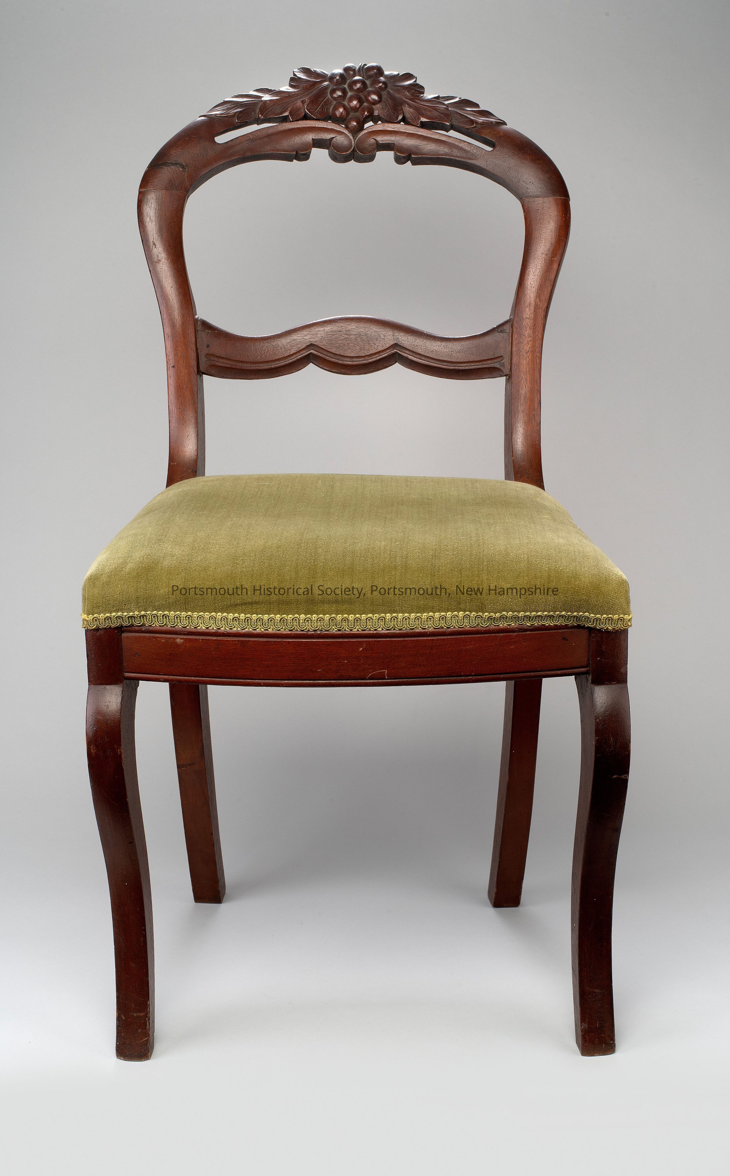 Side chair, mahogany wood, velvet chartreuse upholstery (replaced). The crest rail has a grape bunch at the center with leaves extending out at either side towards the shoulders.Acquisition