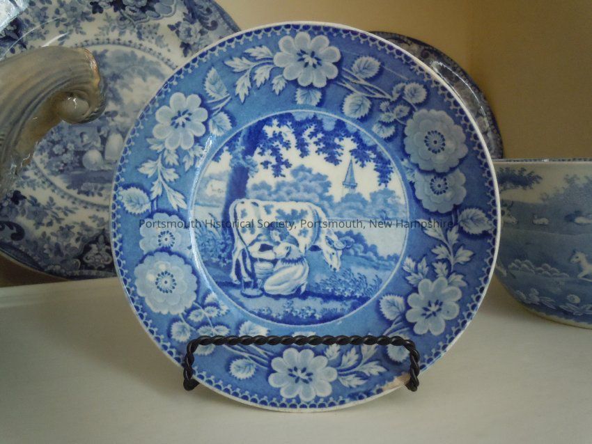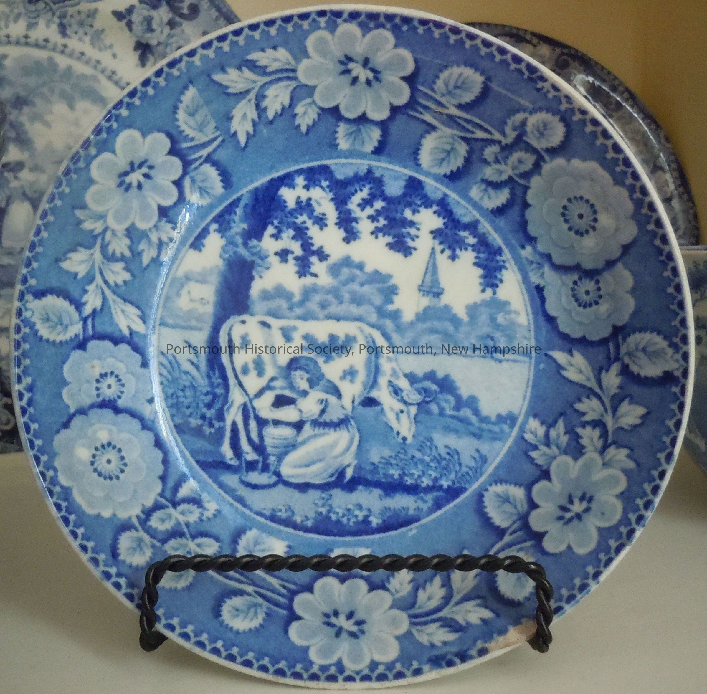 Deep blue and white saucer with transfer-printed milkmaid scene depicting cow and milkmaid with steeple in the background. Probably Staffordshire, ca. 1825