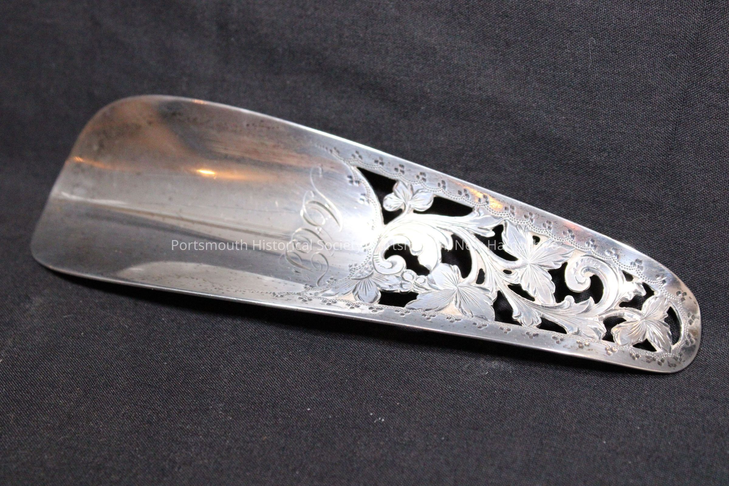 Silver shoe horn with open work top and chased.