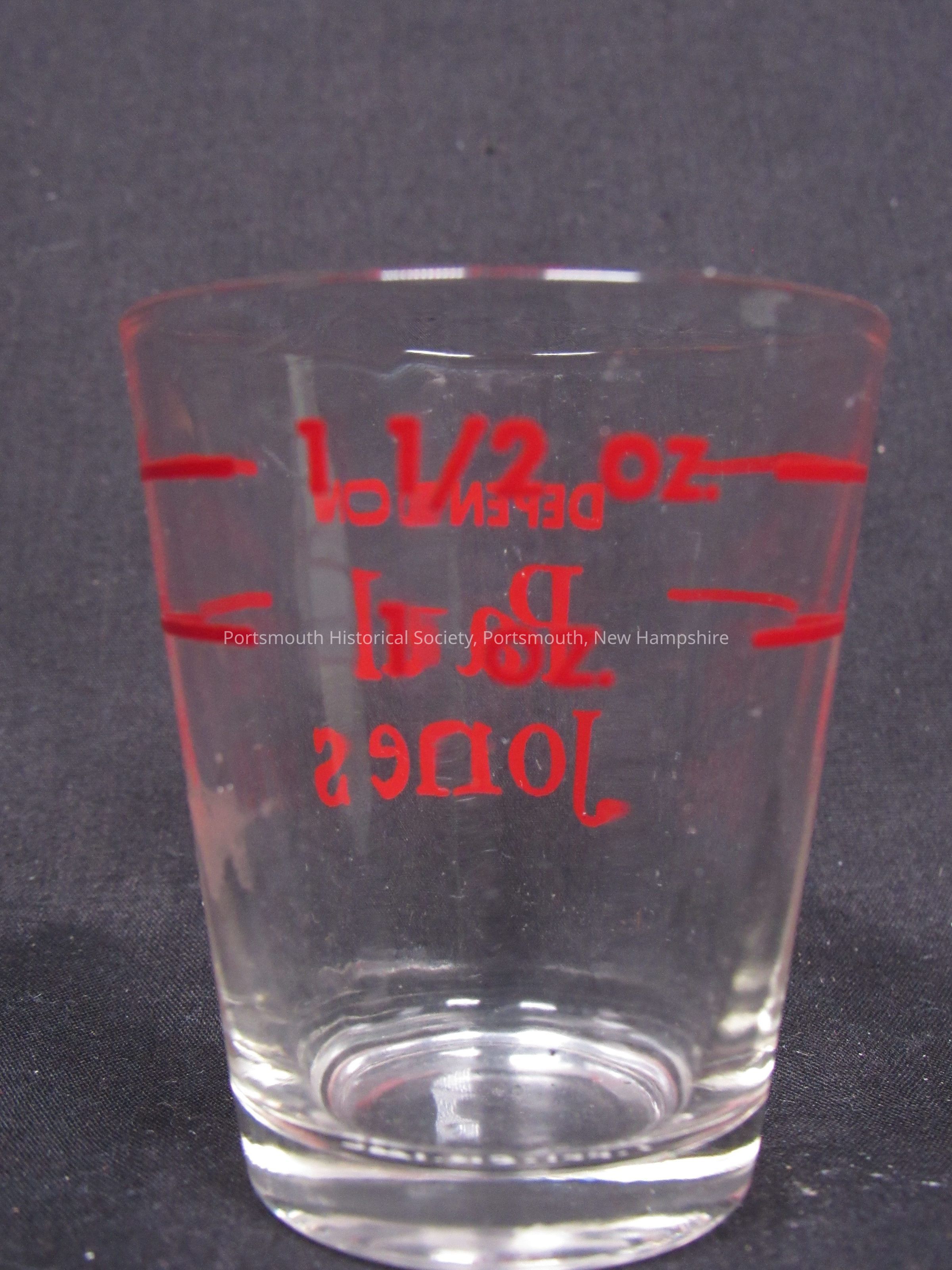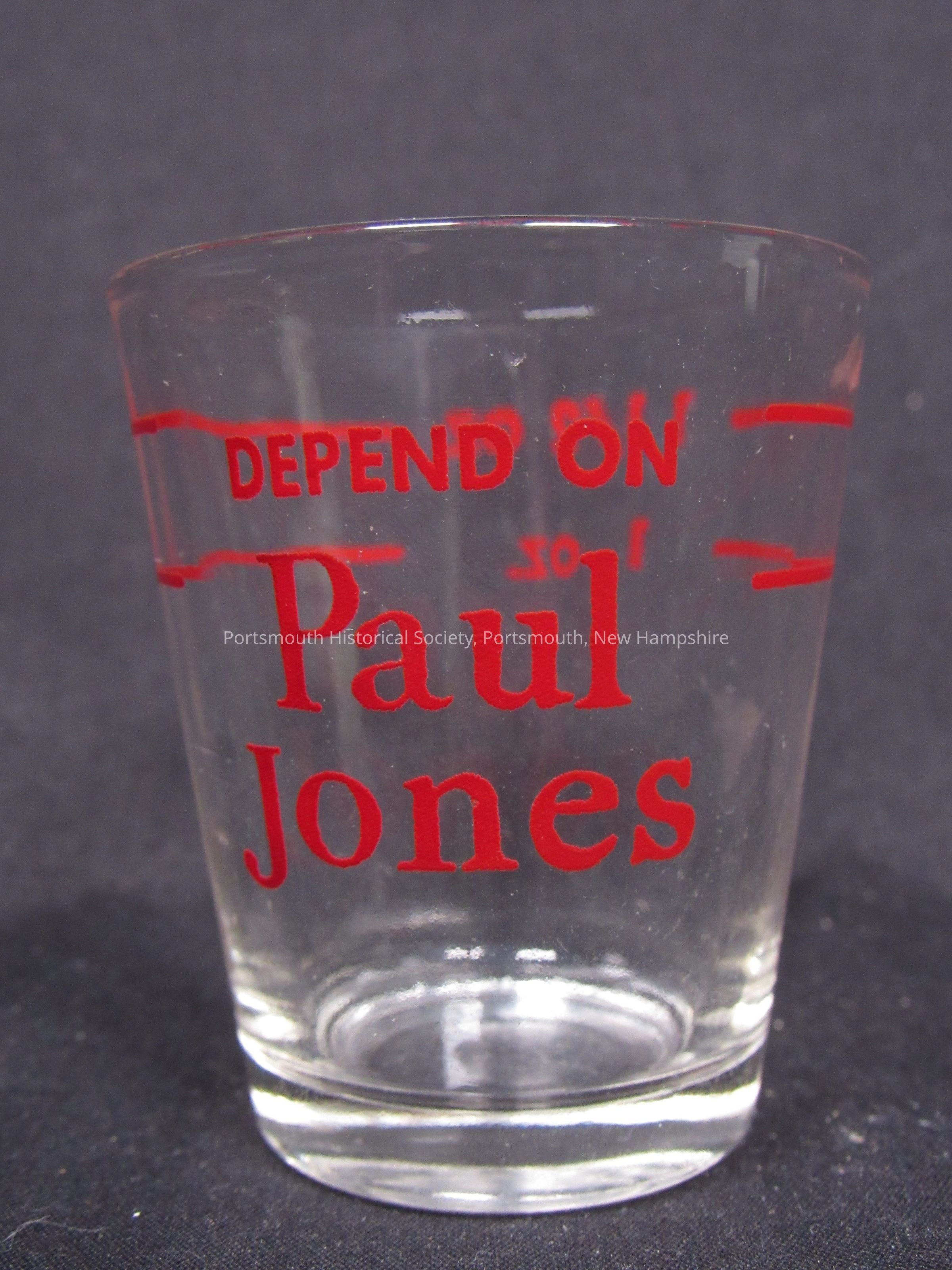 Four of five shot glasses, “Depend on Paul Jones,” twentieth century. Clear glass with red markings;Acquisition