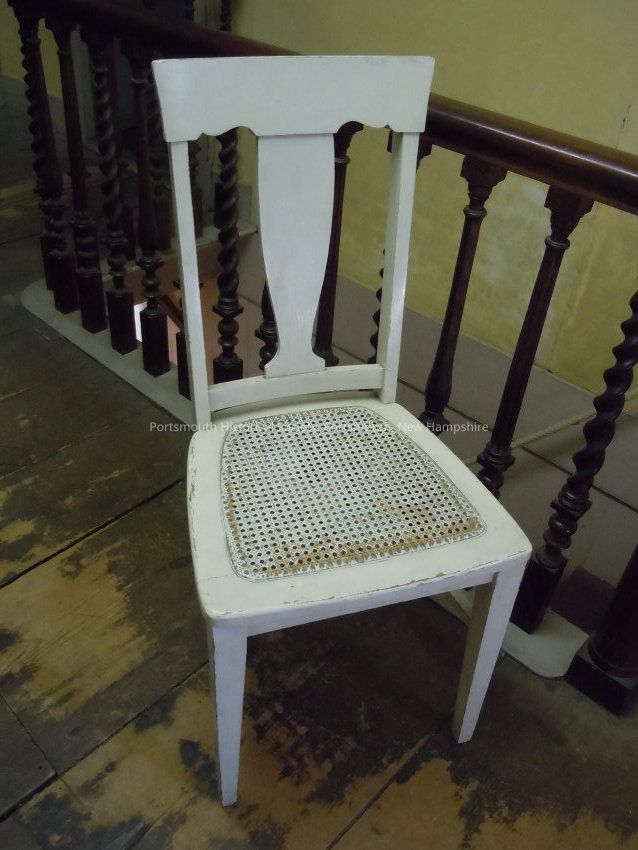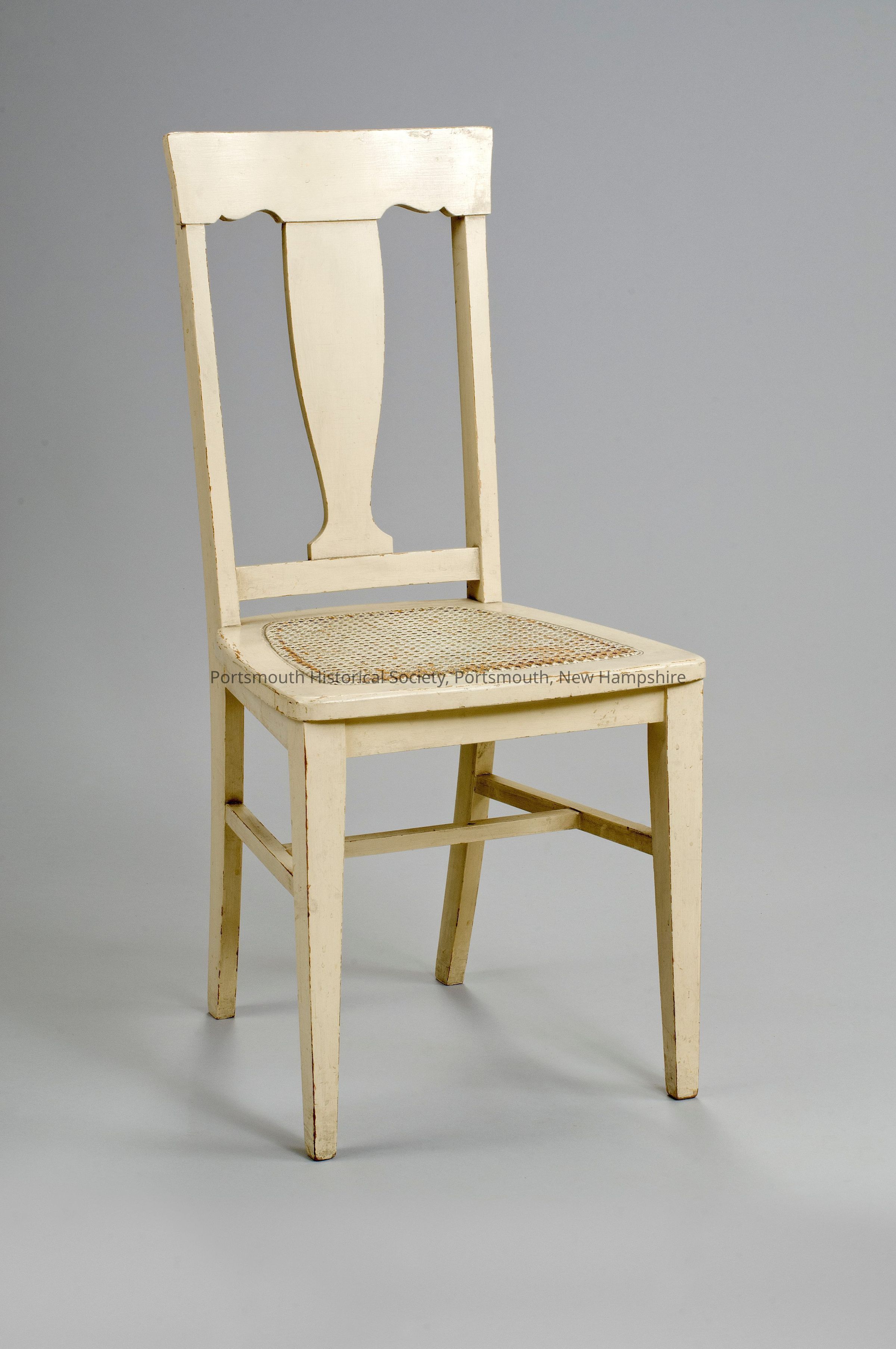 Side chair with straight tapered front legs, raked rear legs, side stretchers with central medial stretchers, trapezoidal seat with caning, solid vase-shaped splat, straight styles, rectangular solid crest rail with scalloped lower edge, retains fragment of printed paper label on inside of rear seat rail. Sold by Margeson Bros., Portsmouth furniture retailer.