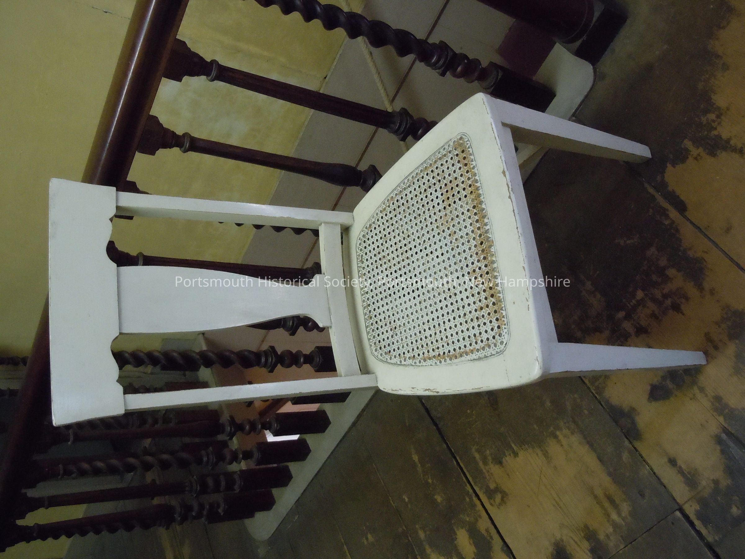 In the 1720s and 1730s, Portsmouth's consumers could turn to local chairmakers to acquire seating furniture. Two centuries later, the same need was fulfilled by factory chairs made elsewhere and sold locally through retail stores. Inexpensive kitchen chairs were important furnishings in middle-class Portsmouth homes, such as those in the are known as Puddle Dock during the mid-twentieth century. This chair was sold by Margeson Brothers, the prominent local furniture store operated for many years by Richman Stanley Margeson (1902–1972) and Ralph Clyde Margeson (1905–1994). They maintained a retail store on Vaughn St. and a warehouse on Albany St. These chairs were often sold en suite with a large oval dining table, all playing a significant role in the everyday life of many consumers.