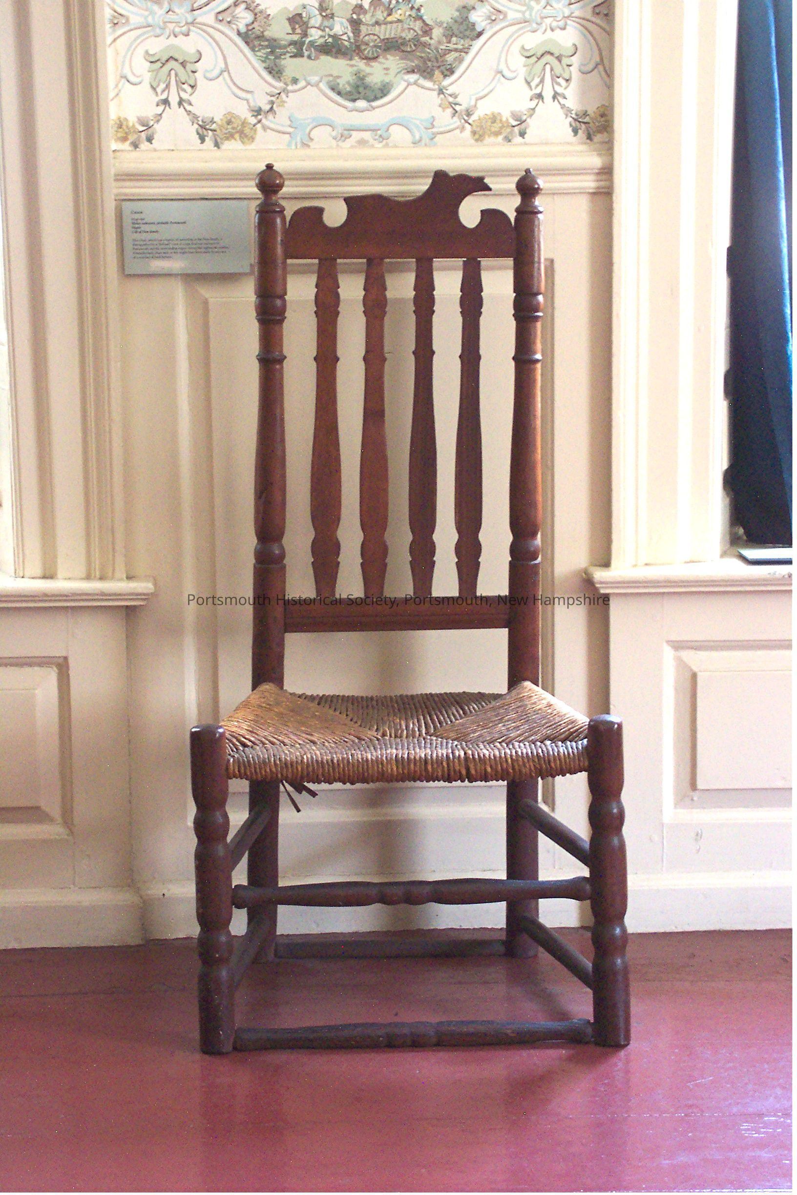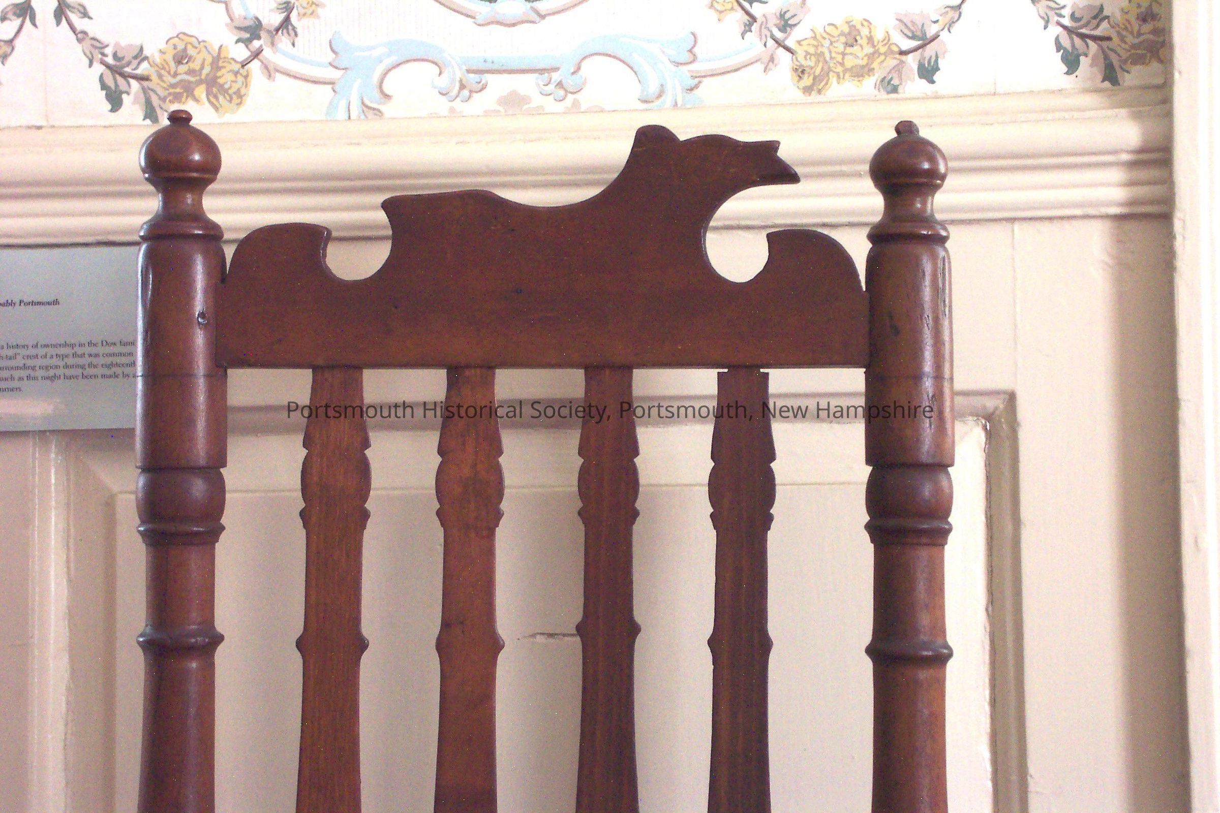 "This chair, which has a history of ownership with the Dow family, is distinguished by a "fish tail" crest type that is common to Portsmouth surrounding region during the eighteenth century. A banister-back chair such as this might have been made by any one of local turners.