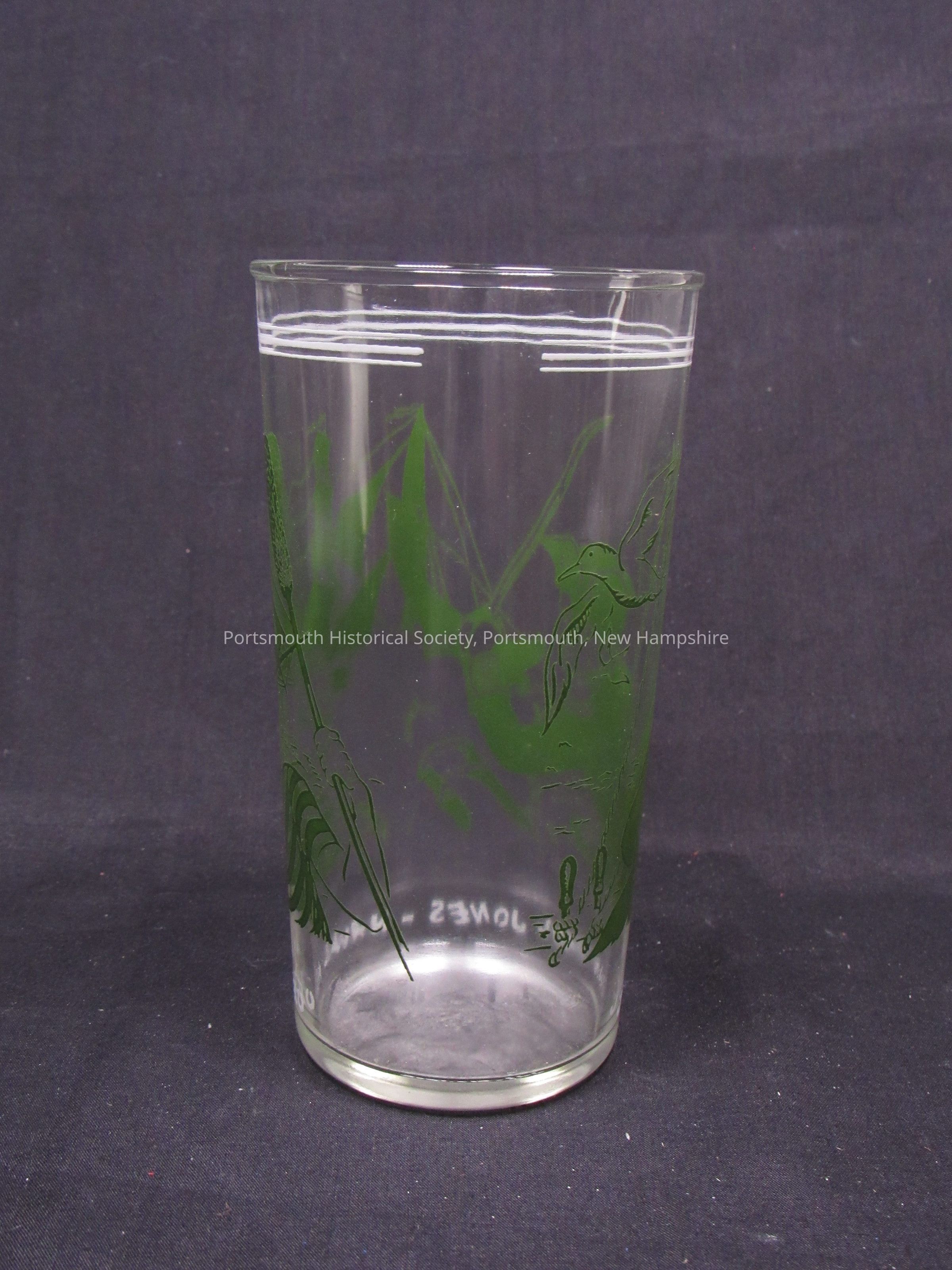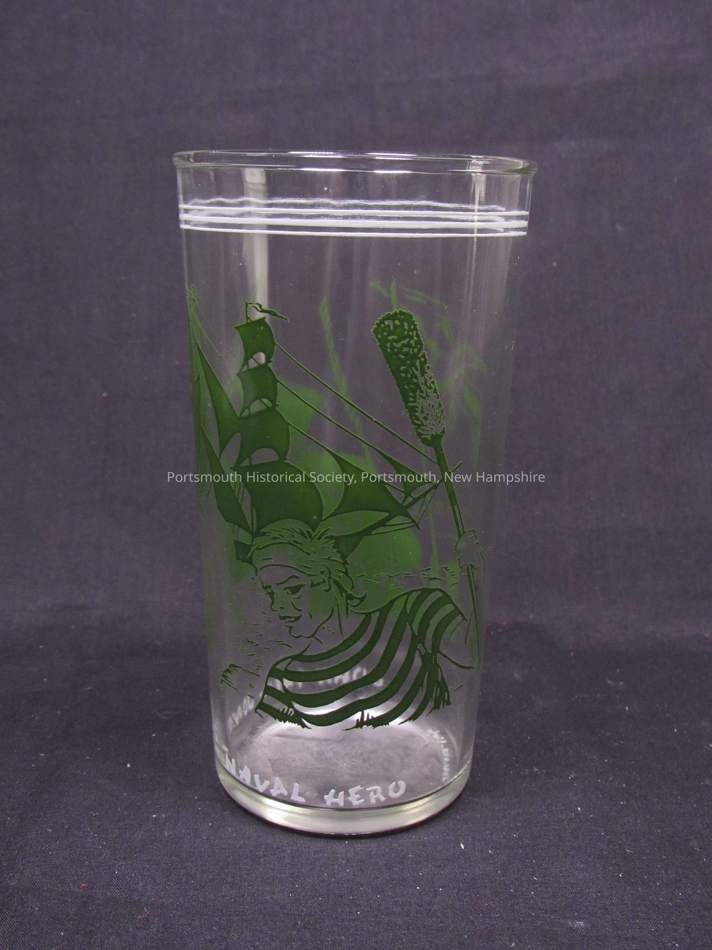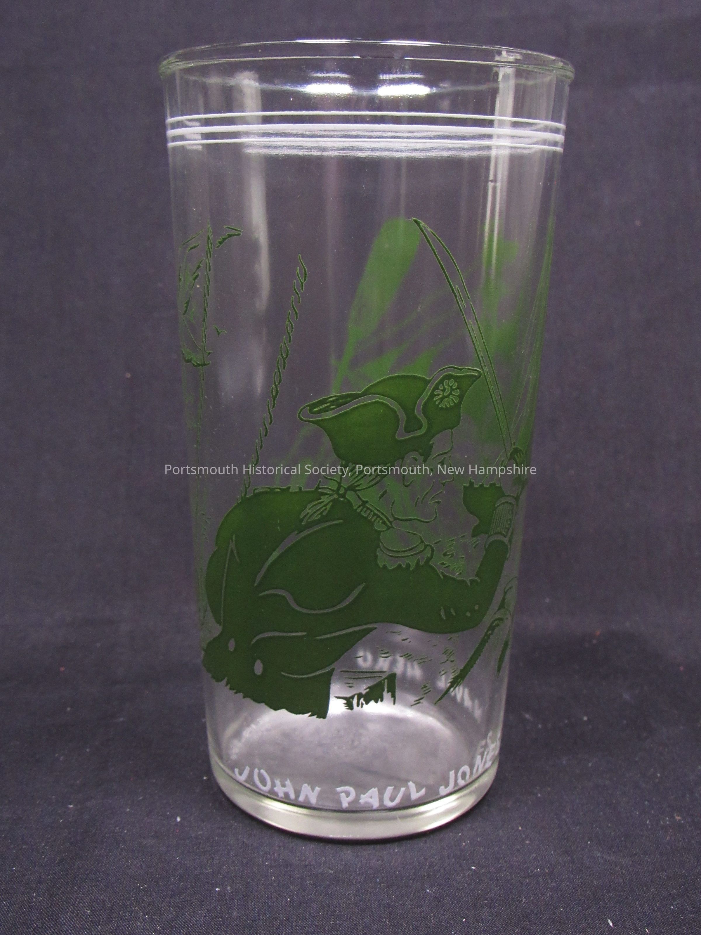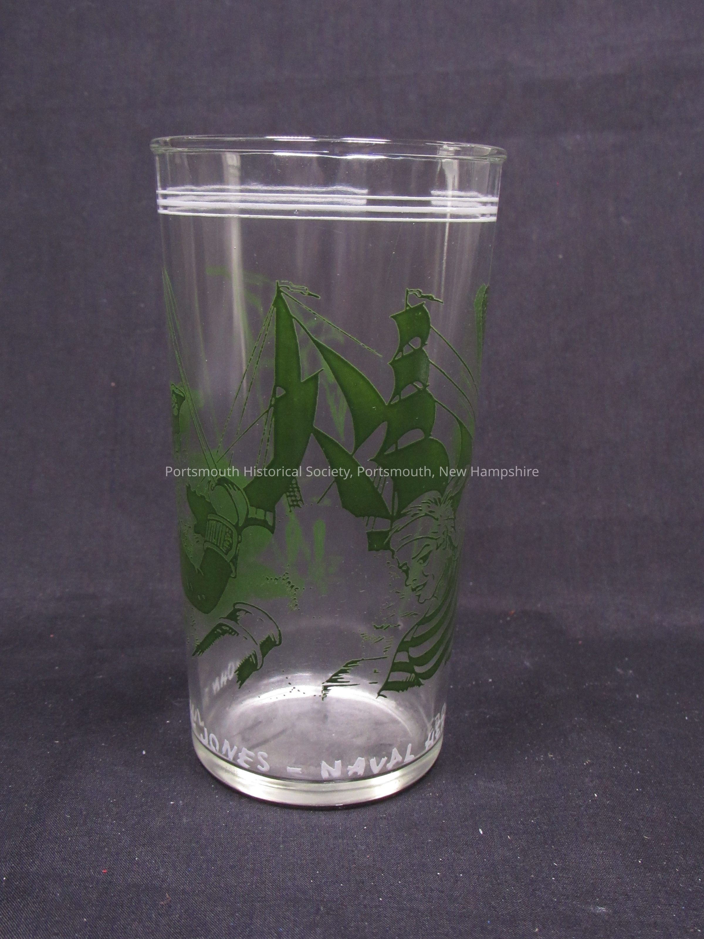 Drinking glass featuring sailors and ship in green, with “JOHN PAUL JONES NAVAL HERO” in white lettering around the base, and three white rings near the top, modern. Clear glass with overlay decoration.Acquisition