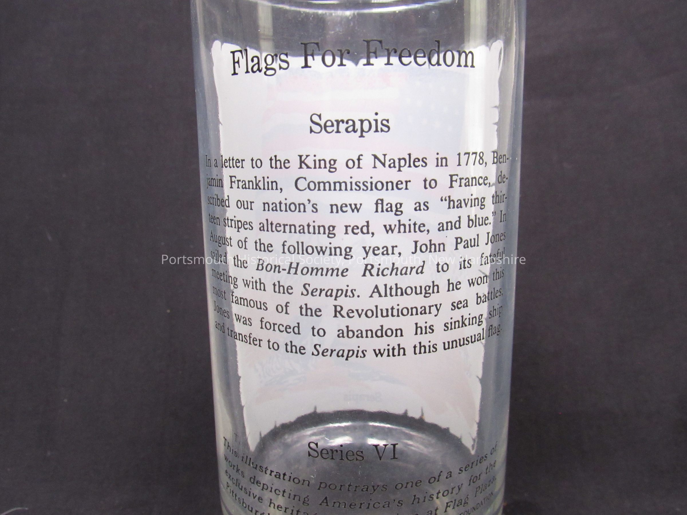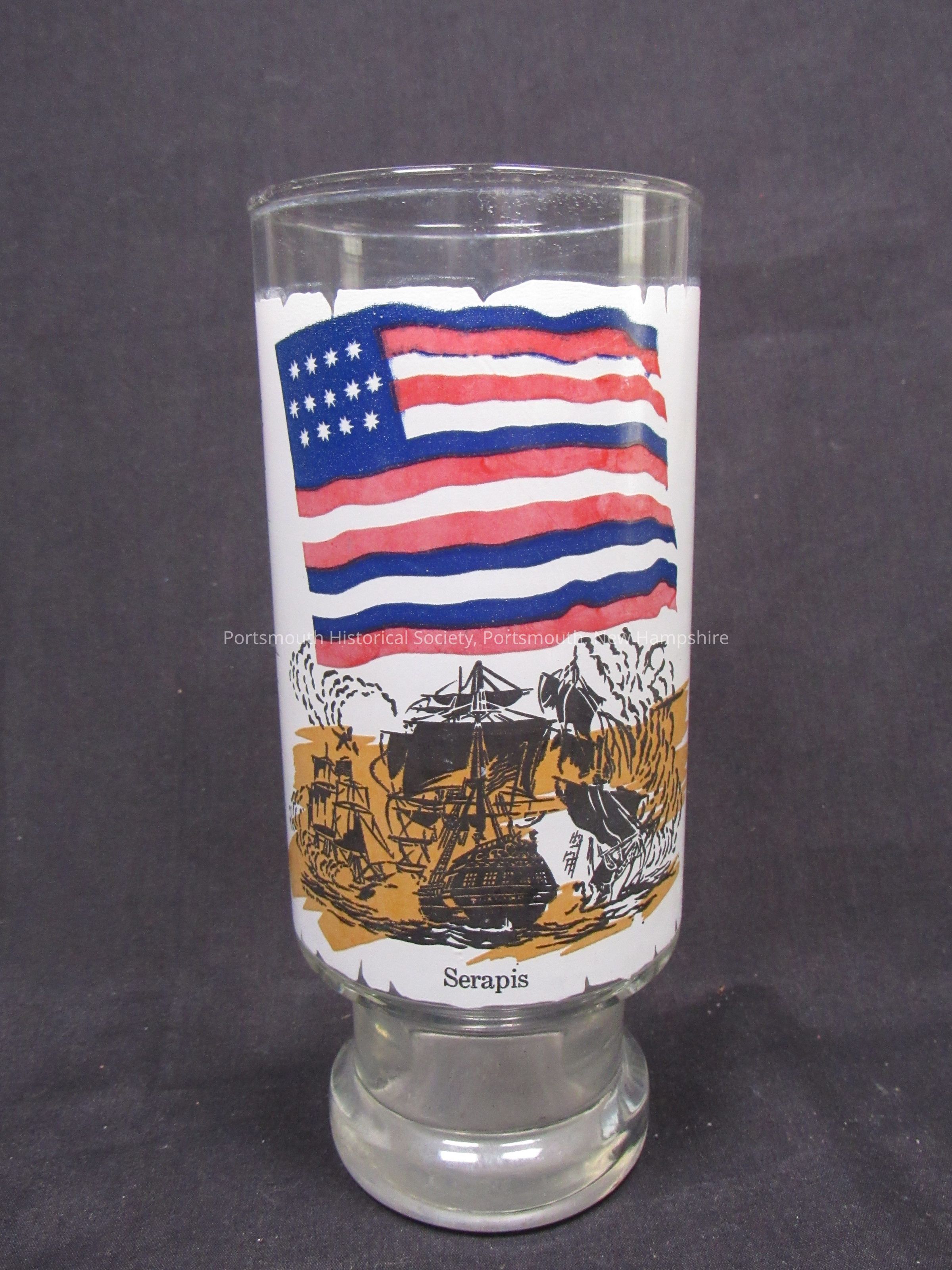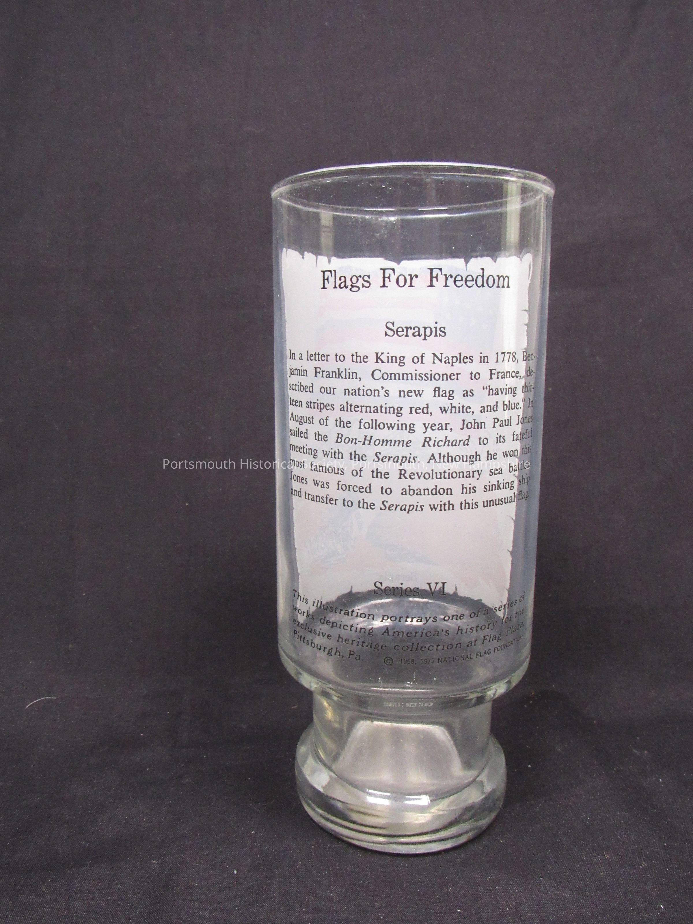 Drinking glass featuring Serapis flag, ca. 1976. Clear glass with text and flag image; H. 6 ½ in., diam rim 2 11/16 in. Text includes: “This illustration portrays one of a series of works depicting America’s history for the exclusive heritage collection at Flag Plaza, Pittsburgh, Pa. © 1968, 1975 NATIONAL FLAG FOUNDATION.” Series VI.Acquisition