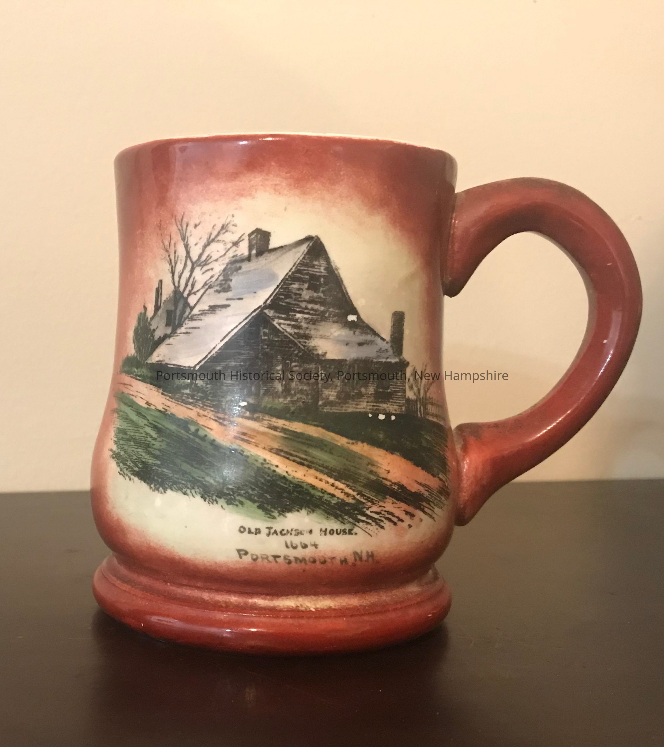 Mug with pear-shaped body applied loop handle, red exterior glaze; depicts seal of New Hampshire on one side, with ship at center, surrounded by inscription: 'SIGILLUM REPUBLICAE NEO HANTONIENSIS"; on other side, image of Jackson House with legend below: "OLD JACKSON HOUSE / 1664 / PORTSMOUTH, N.H." Apparently unmarked.Acquisition