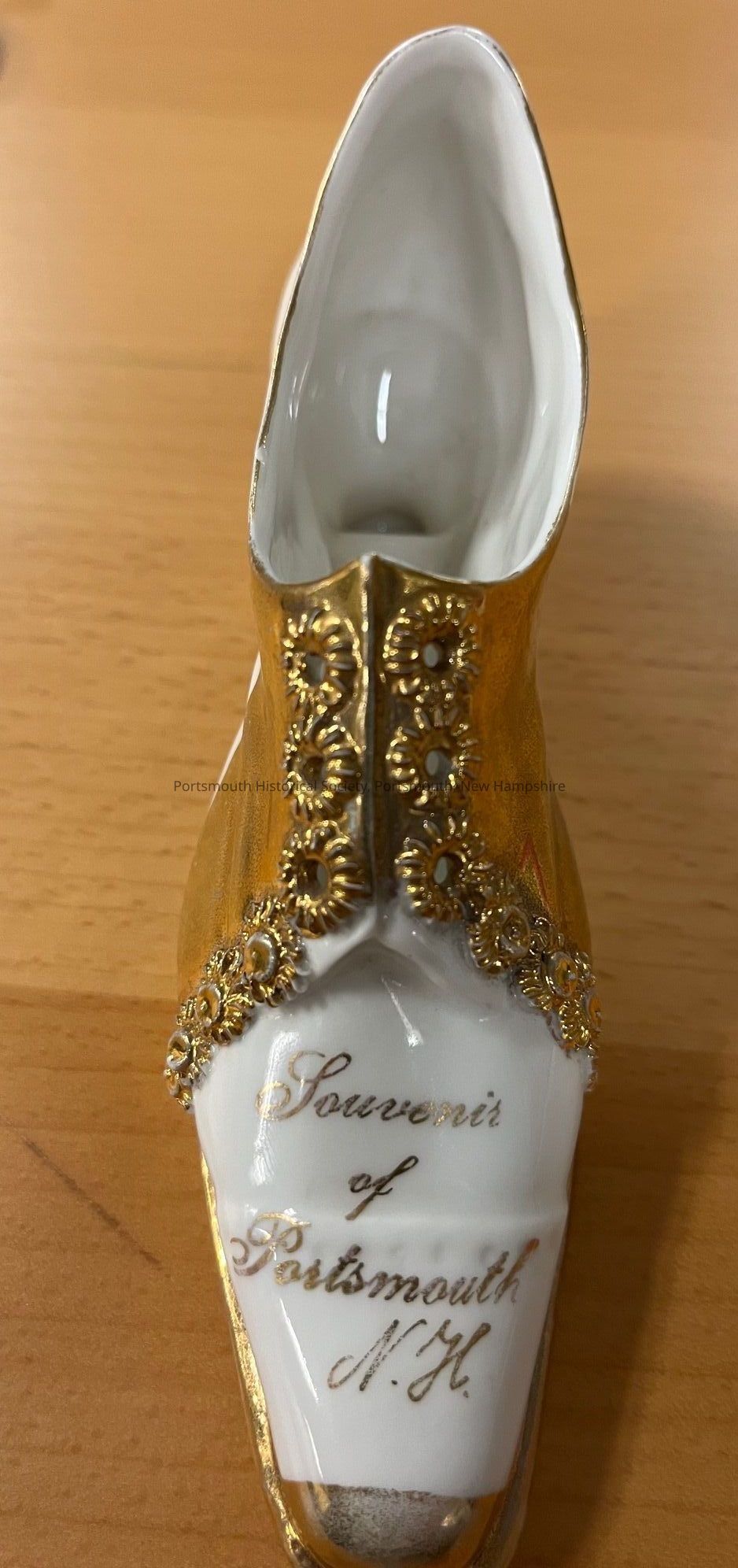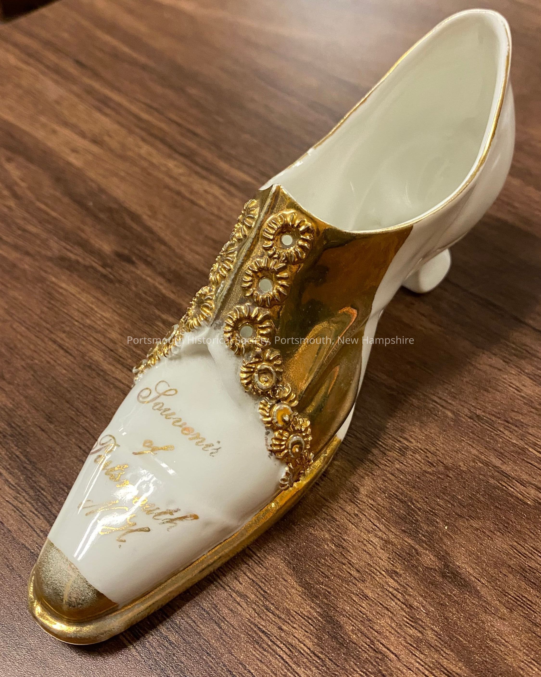 Small ceramic souvenir shoe, white with gold detailing. There is an indistinct mark in black on the sole including "GER" and "69" and possibly a crown. On top of the toe in gold script that reads, "Souvenir / of / Portsmouth / N.H."Acquisition