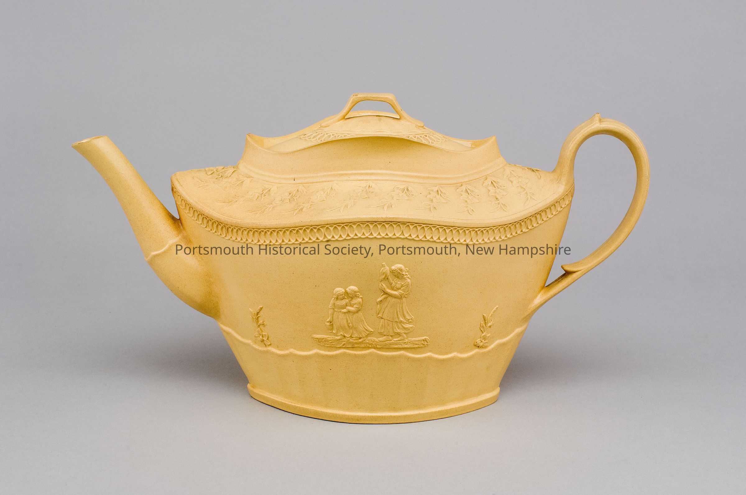Caneware, buff-colored teapot with lid, with image of woman and two children on side and loop handle.Acquisition