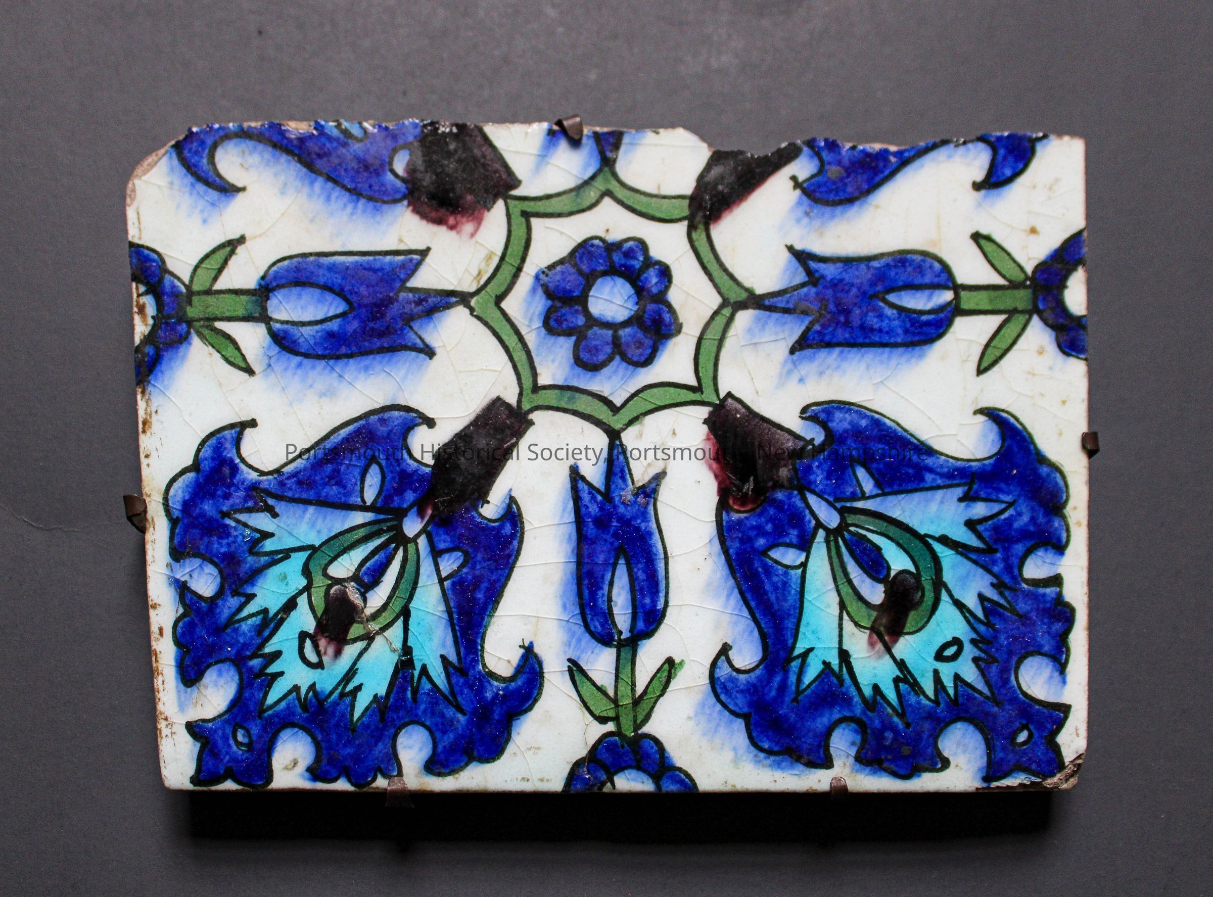 Old label: "This tile is supposed to be over 600 yrs. old. It illustrates the old Phoenician blue and purple so famous in history. Purchased at Damascus in 1872. Loaned by Miss Pauline Bradford."