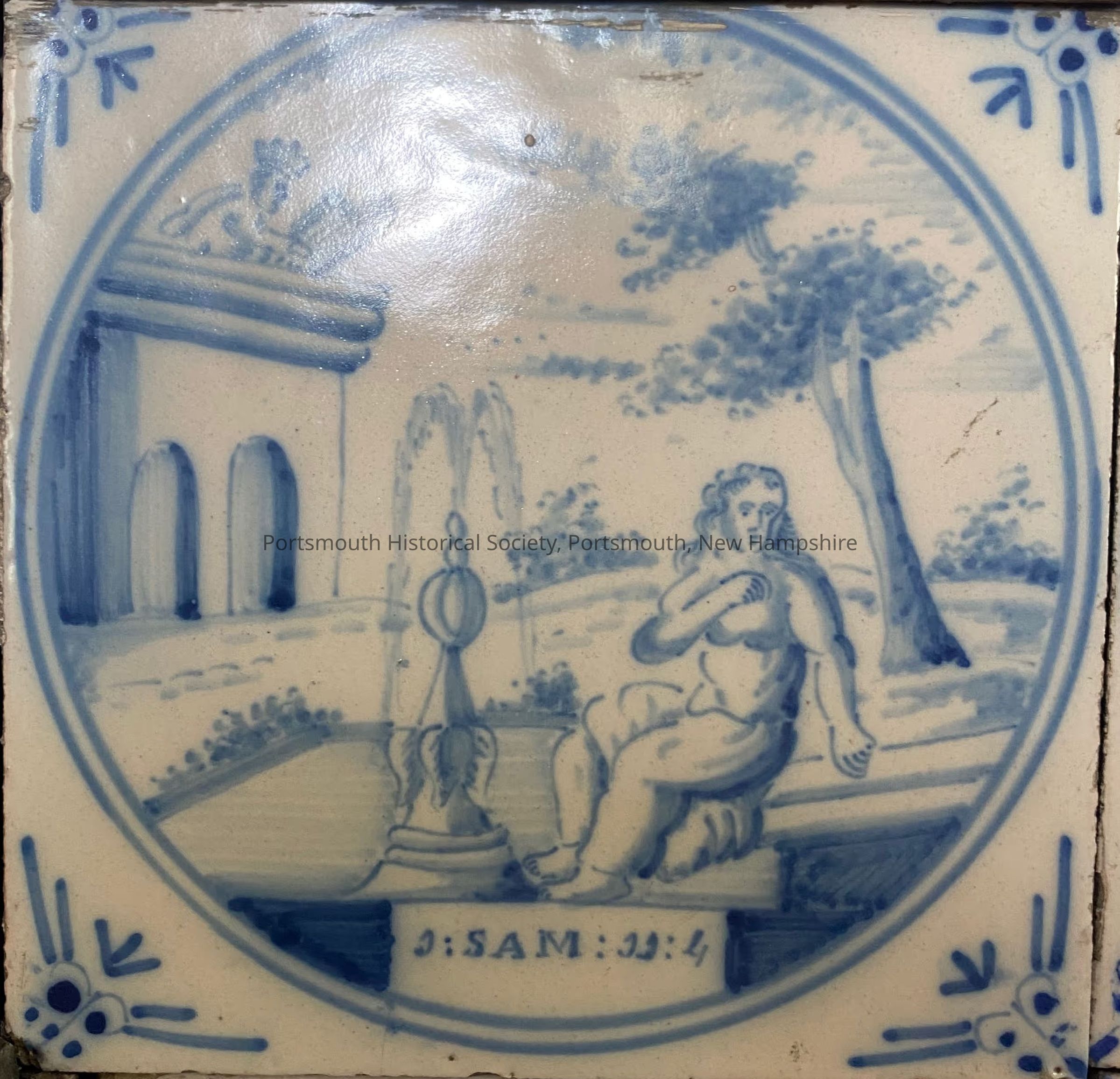 Blue and white Delft ceramic tile with ox-head border. Image is of a women next to a fountain with a man on a rooftop. Underneath is "2:SAM:22:4" referencing the Second Book of Samuel chapter 22 verse 4. However, the image is more related to 11:4, and may be a misprint.Acquisition