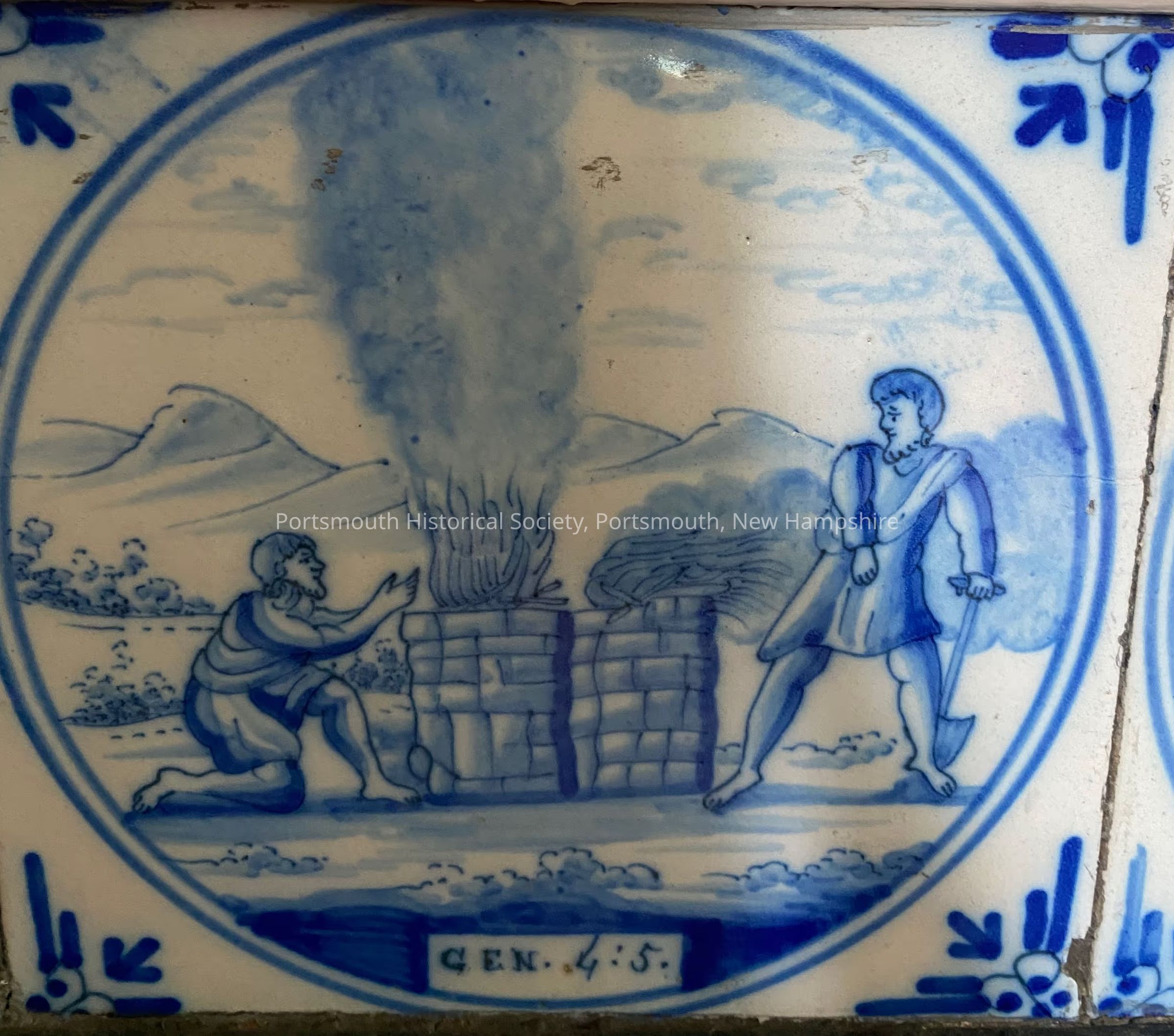 Blue and white delft tile with ox-head border. Image is of two men next to pillars, one on fire. Underneath is "GEN. 4:5." referencing the Book of Genesis chapter 4 verse 5.Acquisition