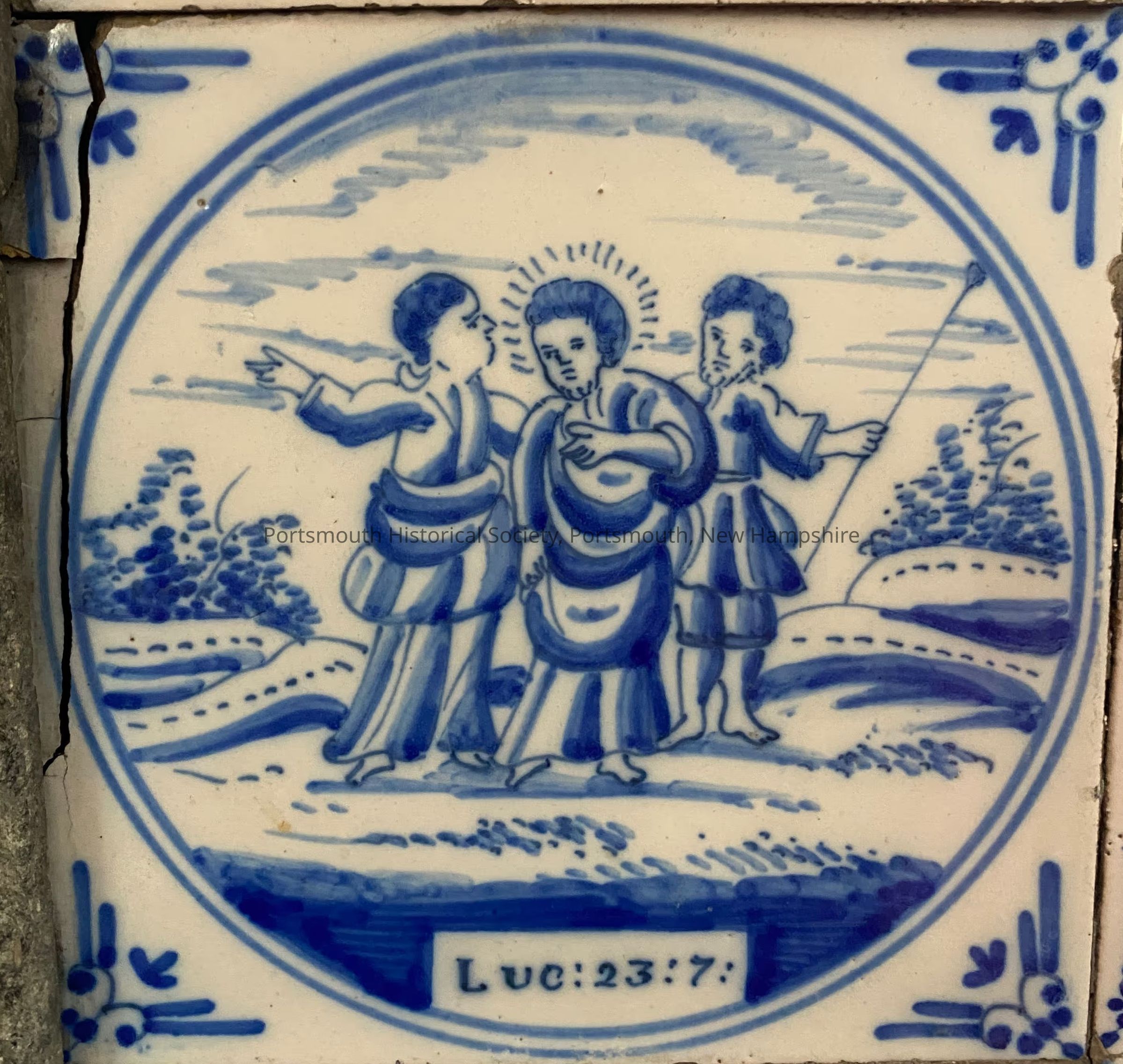 Blue and white Delft ceramic tile with ox-head border. Image is of three men standing together. One is holding what looks like a spear, one is gesturing to the side and the other is drawn illuminated. Underneath is "LUC:23:7:" referencing Luke chapter 23 verse 7.
