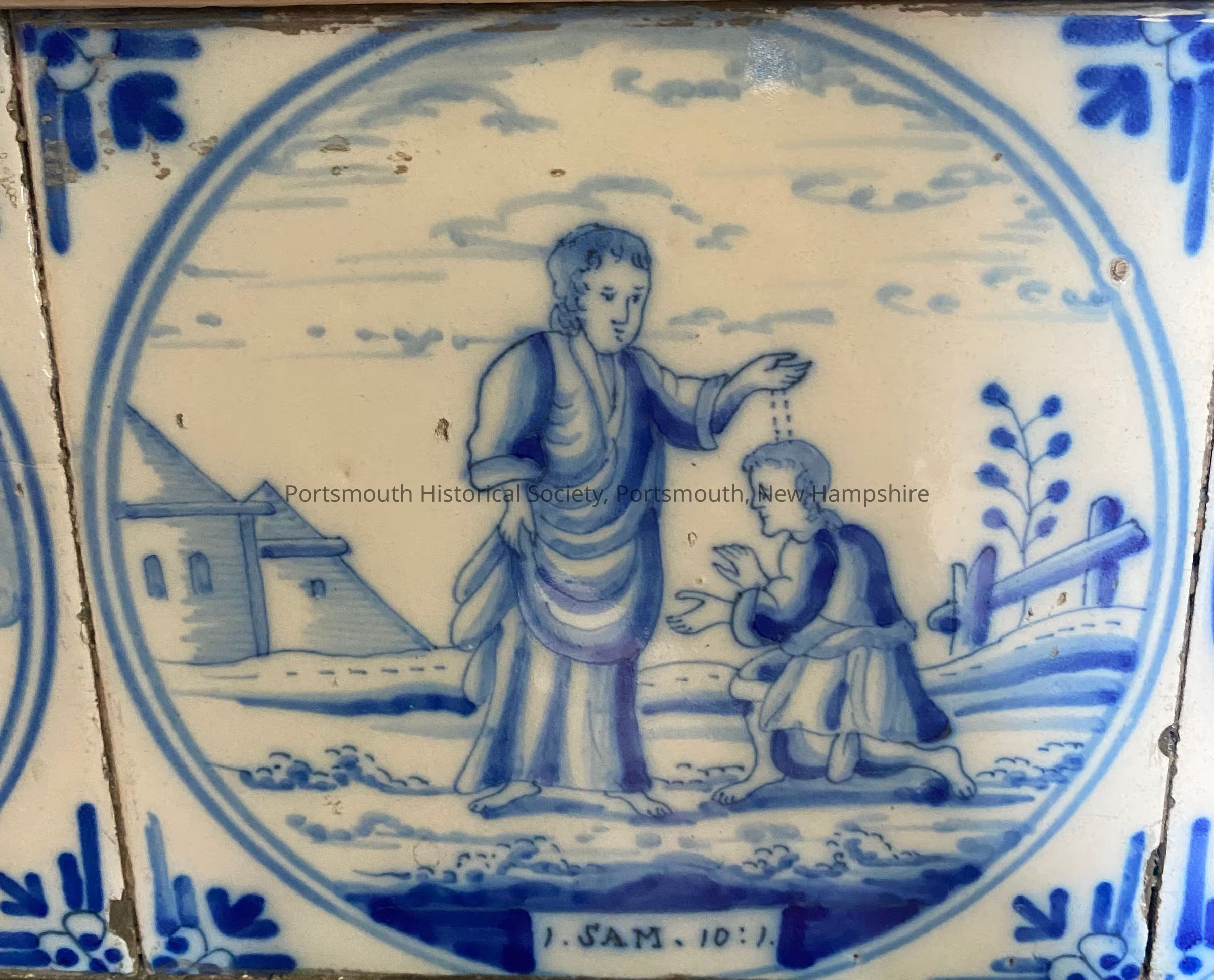 Blue and white Delft ceramic tile with ox-head borders. Image is of a man standing in front of another who is kneeling. Underneath is "1.SAM.10:1" referencing the First Book of Samuel chapter 10 verse 1.Acquisition