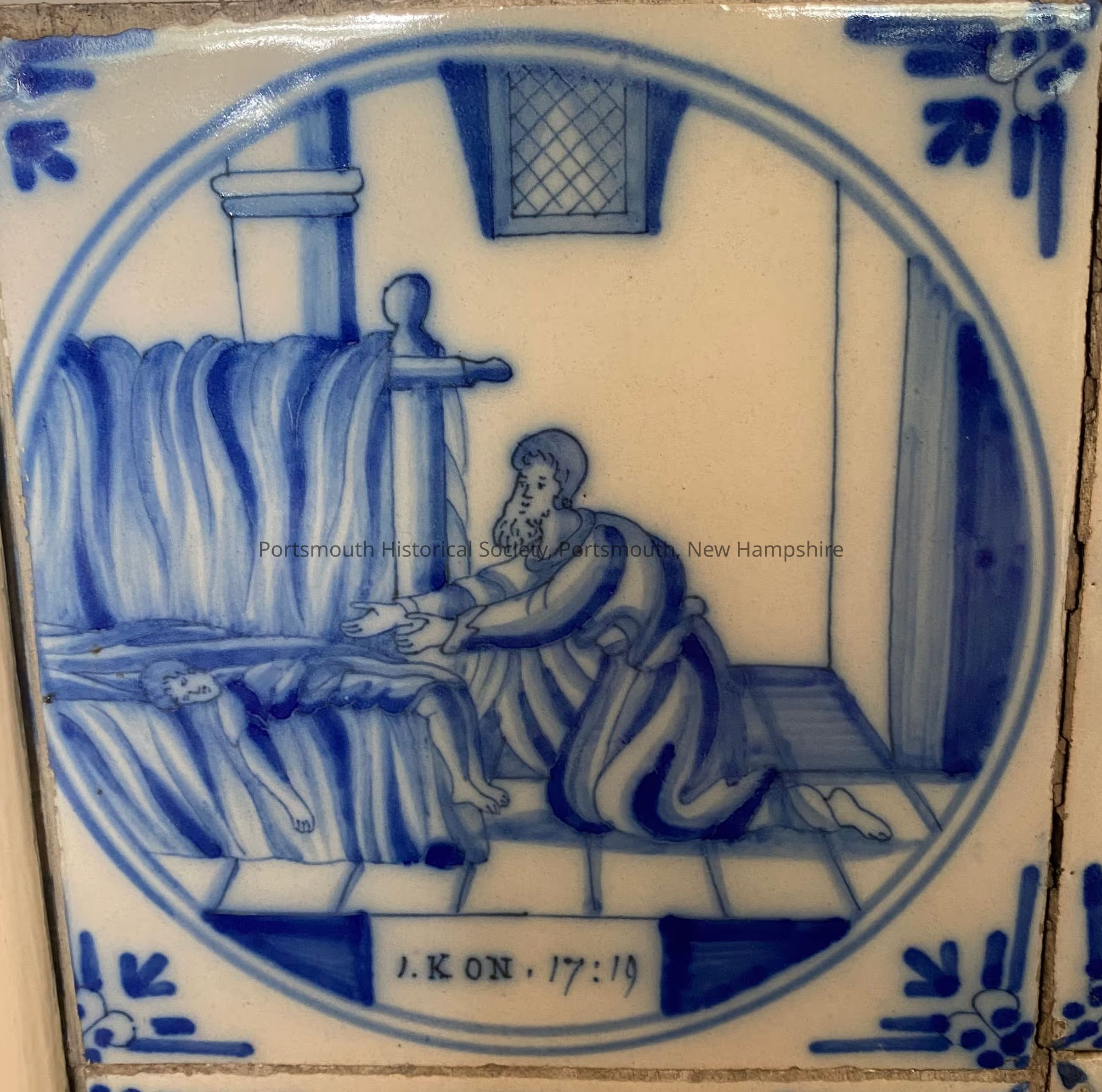 Blue and white Delft ceramic tile with ox-head borders. Image of a man kneeling in front a child lying on a bed. Underneath is "1. KON. 17:19" referencing First Corinthians chapter 17 verse 19.Acquisition