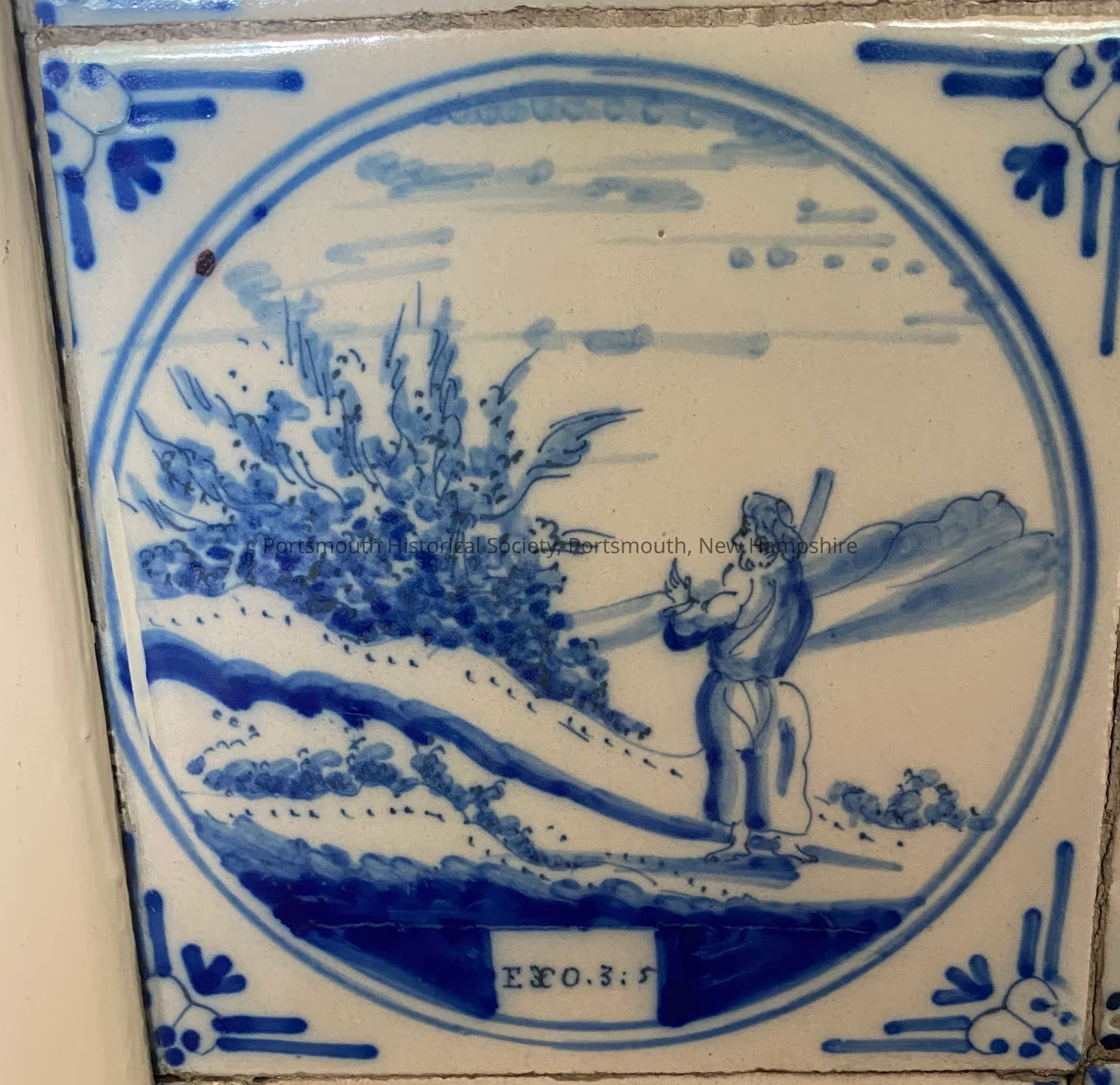 Blue and white Delft ceramic tile with ox-head borders. Image is of a man standing in front of a bush on a hill. Underneath is "EXO. 3:5" referencing the book of Exodus chapter 3 verse 5.Acquisition