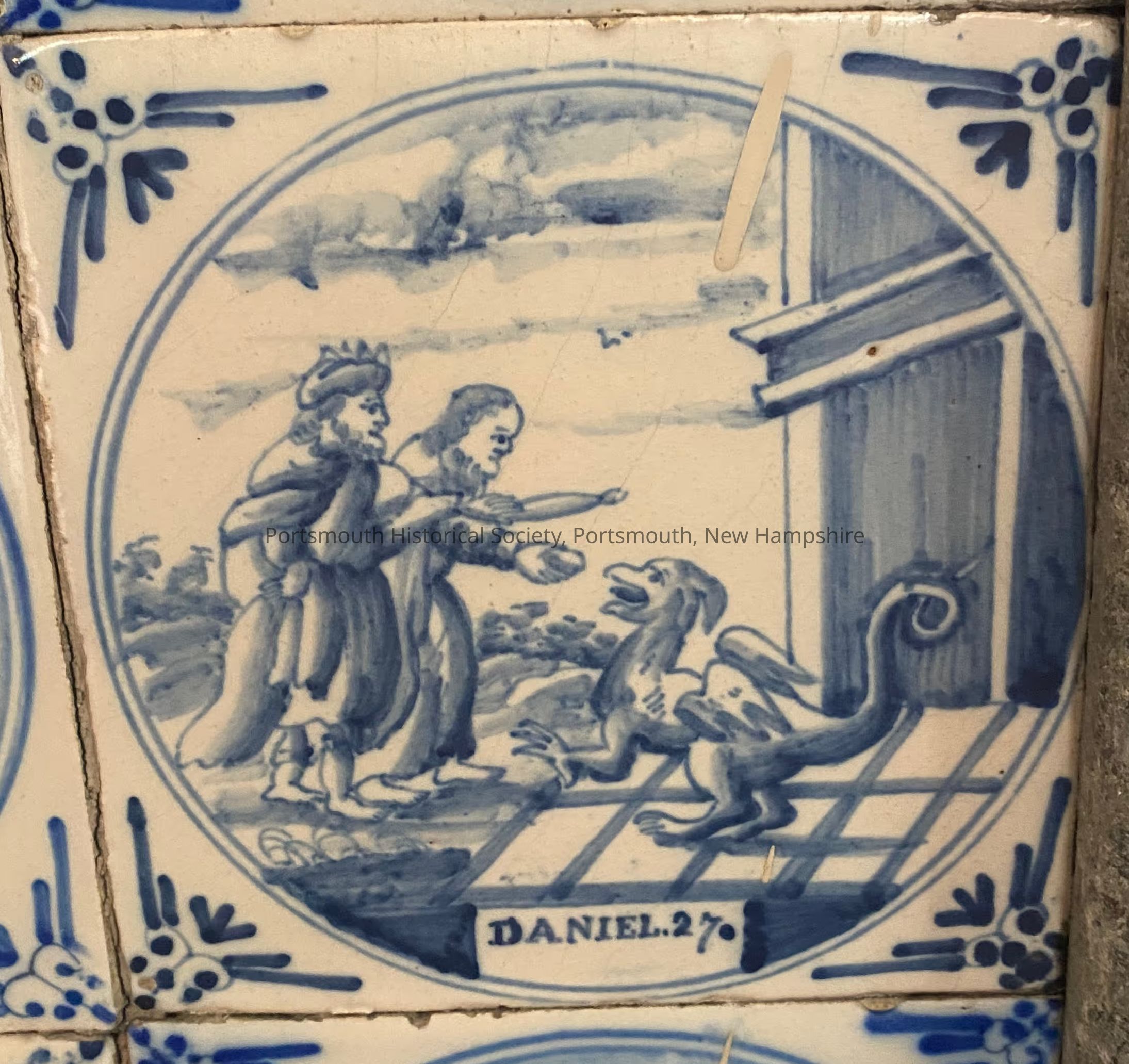 Blue and white Delft ceramic tile with ox-head borders. Image is of two people confronting a dragon. Underneath is "DANIEL.270" referencing the added episode of Bel and the Dragon. This story is only found in the Greek version.Acquisition
