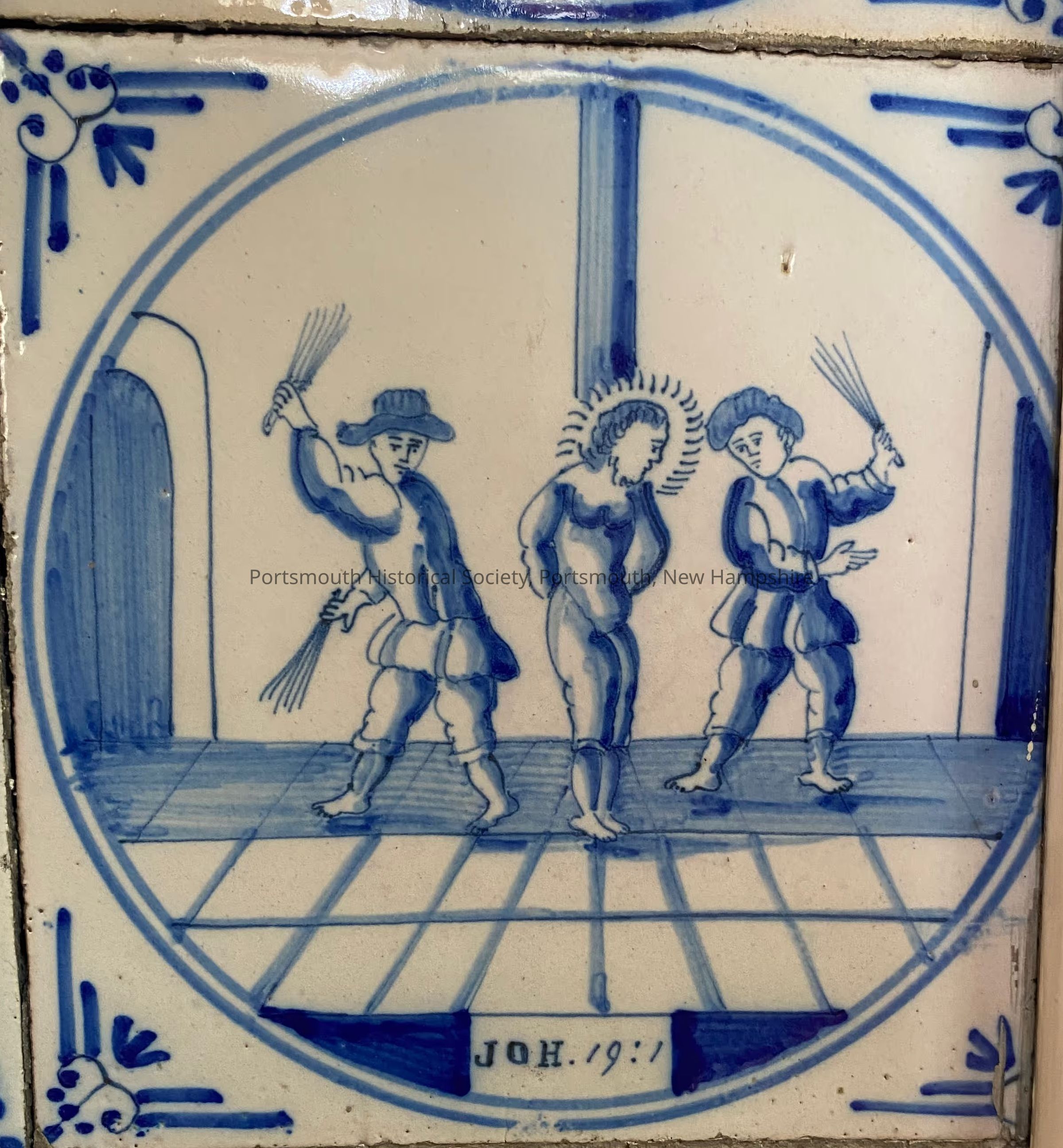 Blue and white Delft ceramic tile with ox-head borders. Image is of a person tied to a pole with two people on either side whipping them. Underneath is "JON. 19:1" referencing John chapter 19 verse 1.Acquisition