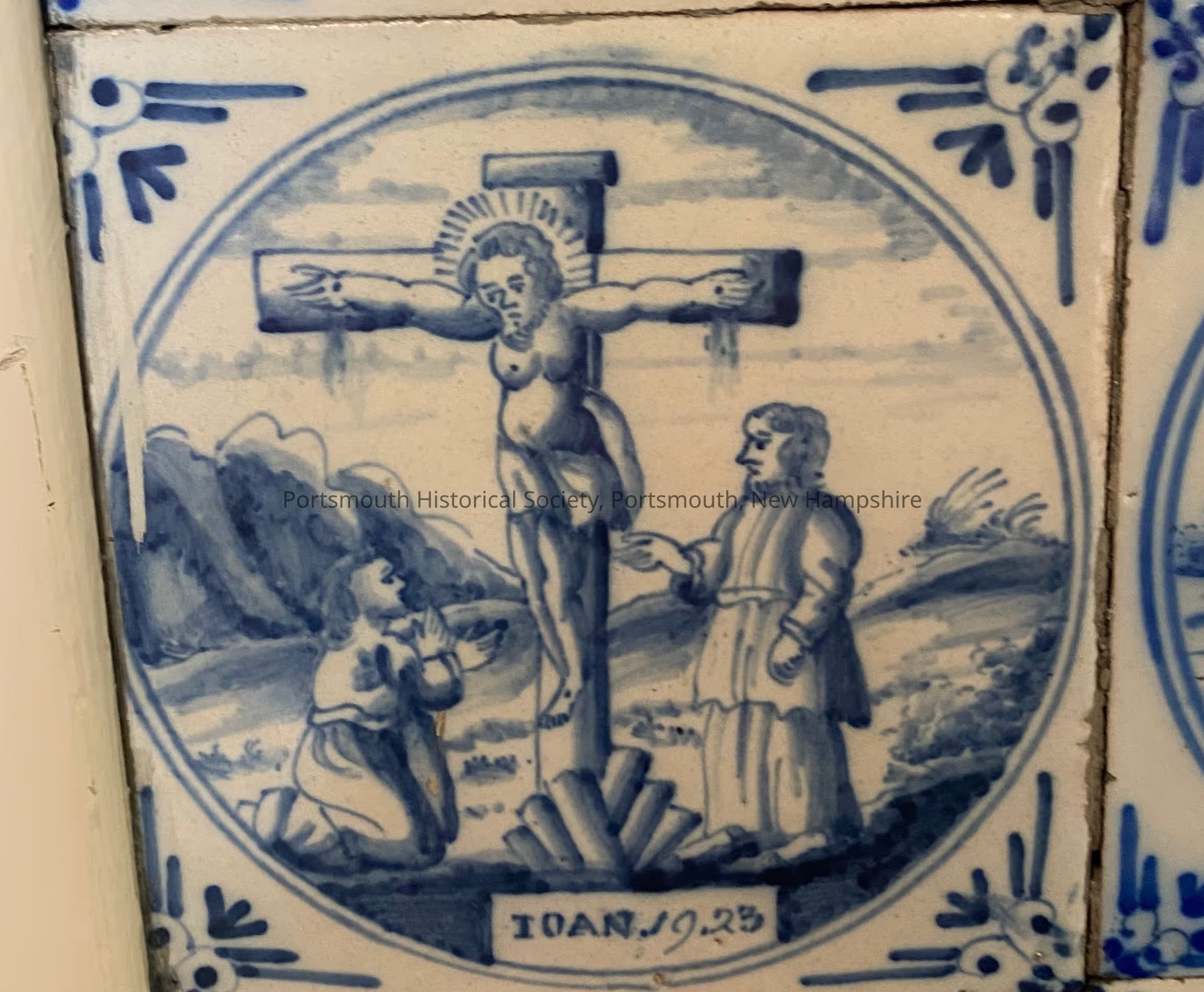 Blue and white Delft ceramic tile with ox-head borders. Image is of Jesus on the cross with two people standing on either side of him. Underneath is "IOAN 19:25" referencing the book of John chapter 19 verse 25.Acquisition
