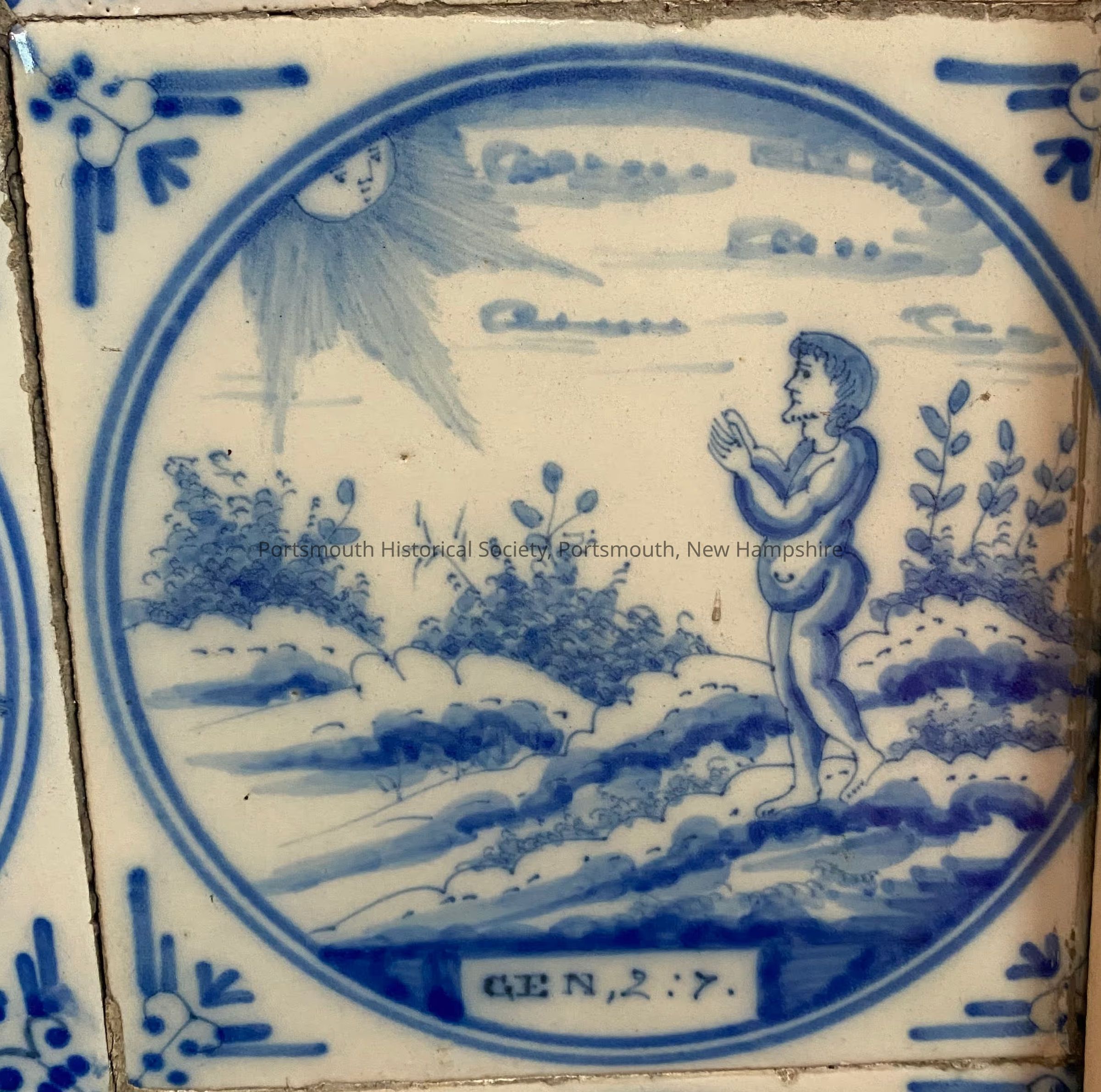 Blue and white Delft ceramic tile with ox-head borders. The image is of a naked man in a field with the sun shining down. Underneath is "GEN.2:7." referencing the Book of Genesis chapter 2 verse 7.Acquisition