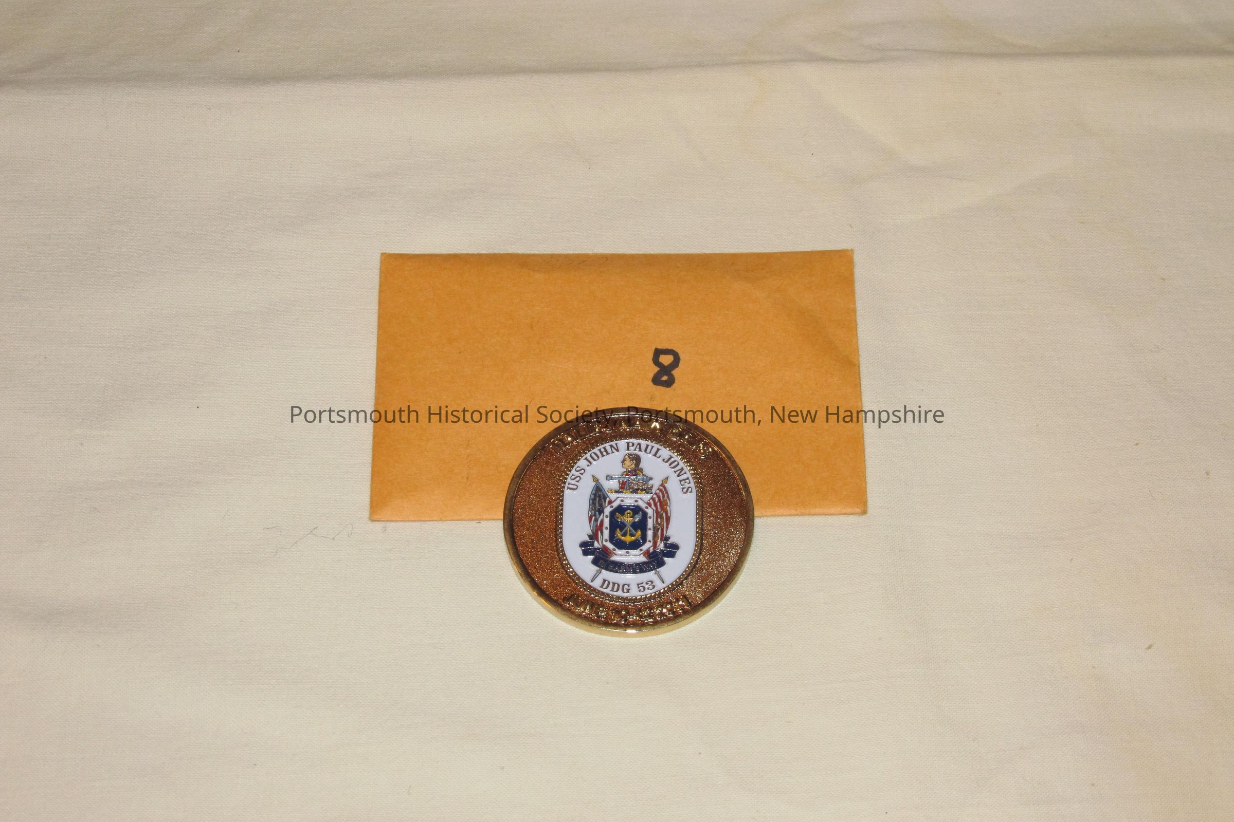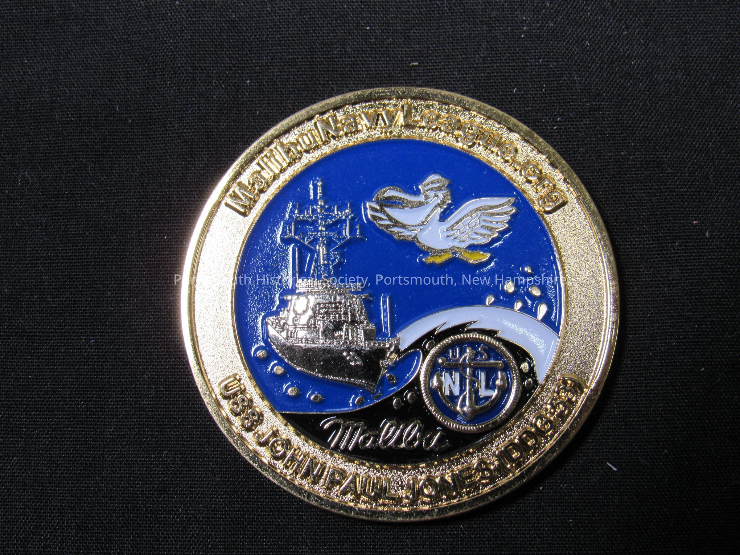 Coin/token: “MALIBU NAVY DAYS / USS JOHN PAUL JONES / IN HARM’S WAY / DDG 53 / JUNE 10-12 2011” on one side; “MalibuNavyLeague.org / USS JOHN PAUL JONES DDG 530” on reverse. Base metal; blue and white enamel. Diam. 1 ¾ in.Acquisition