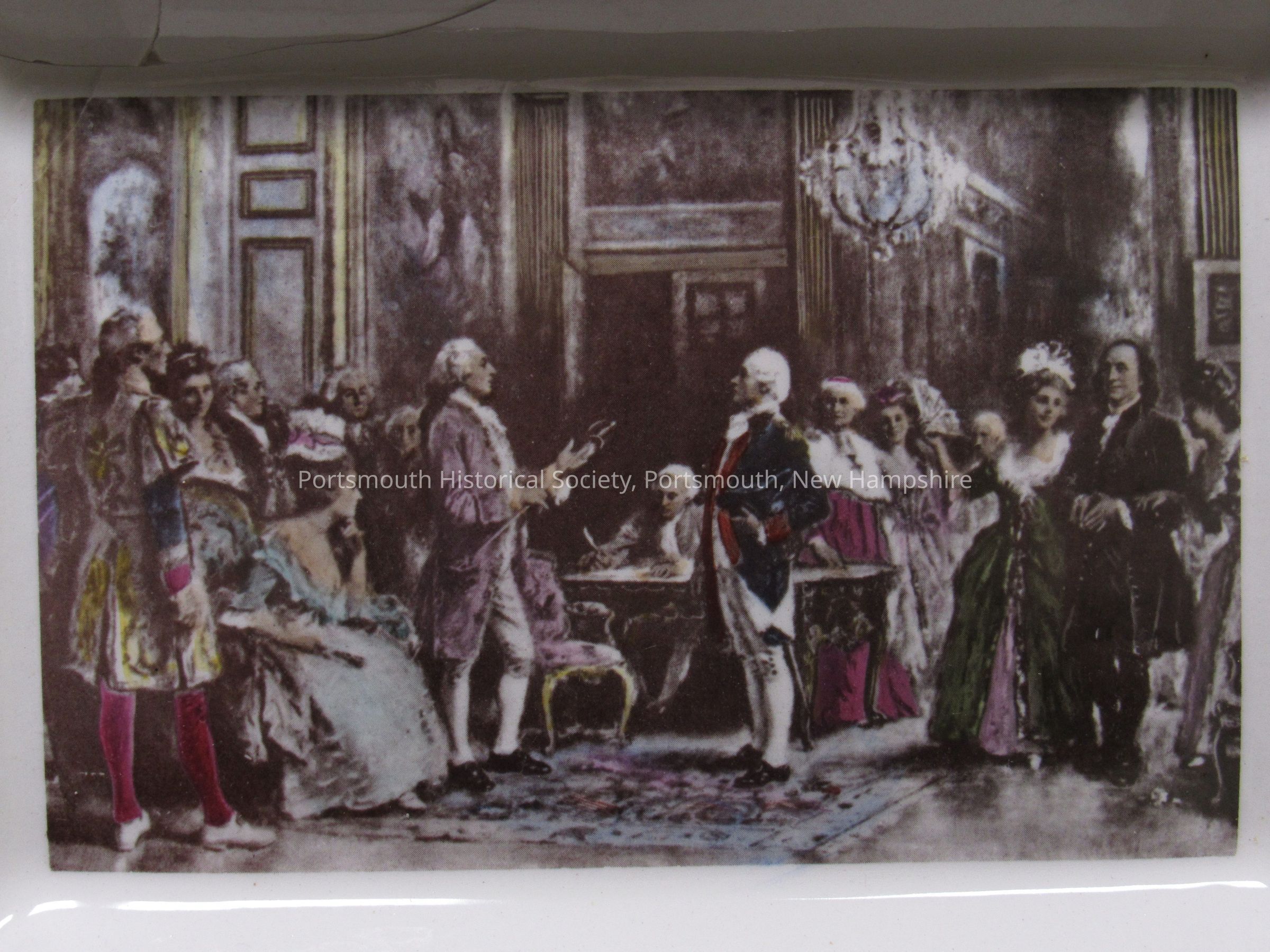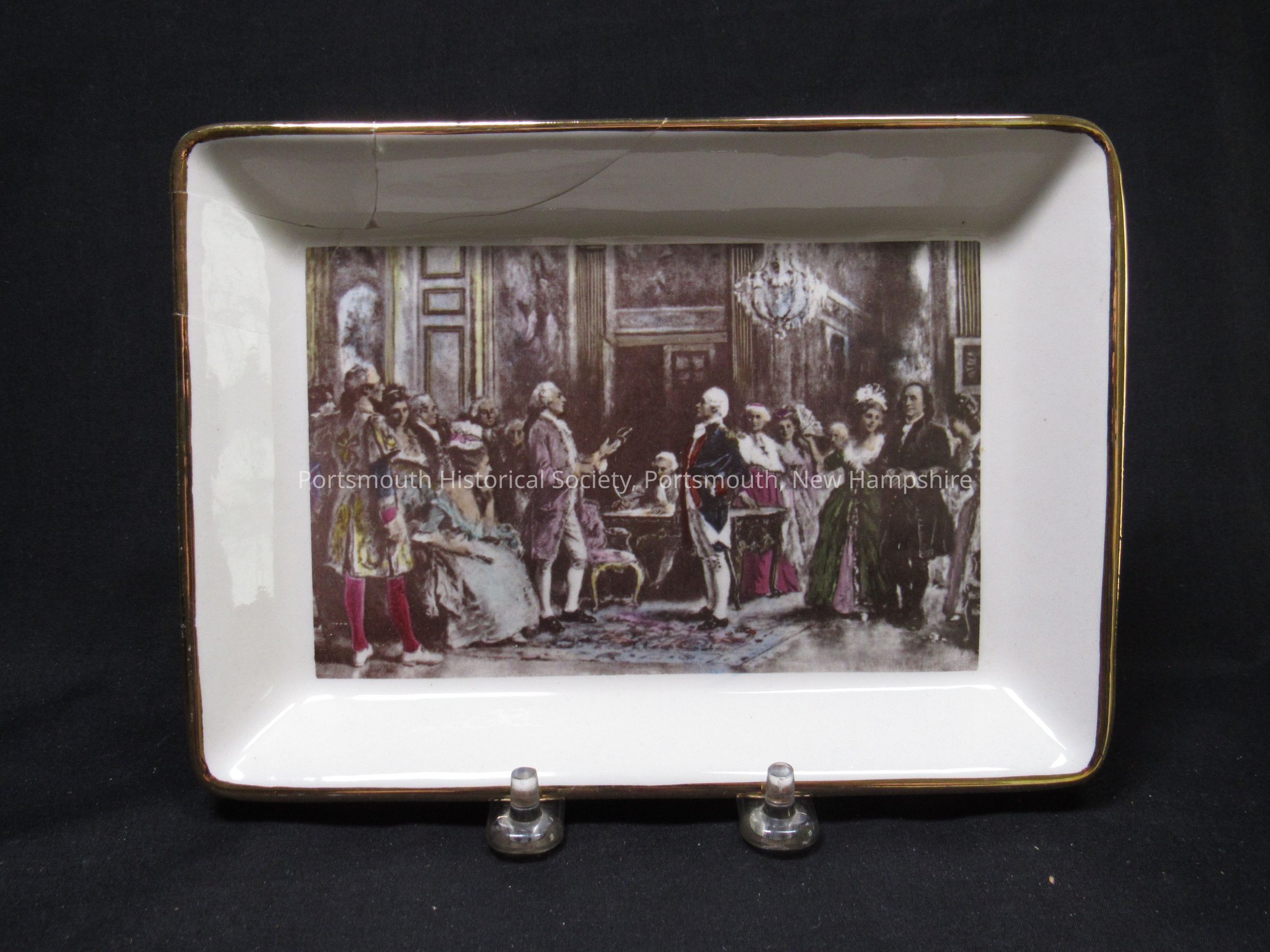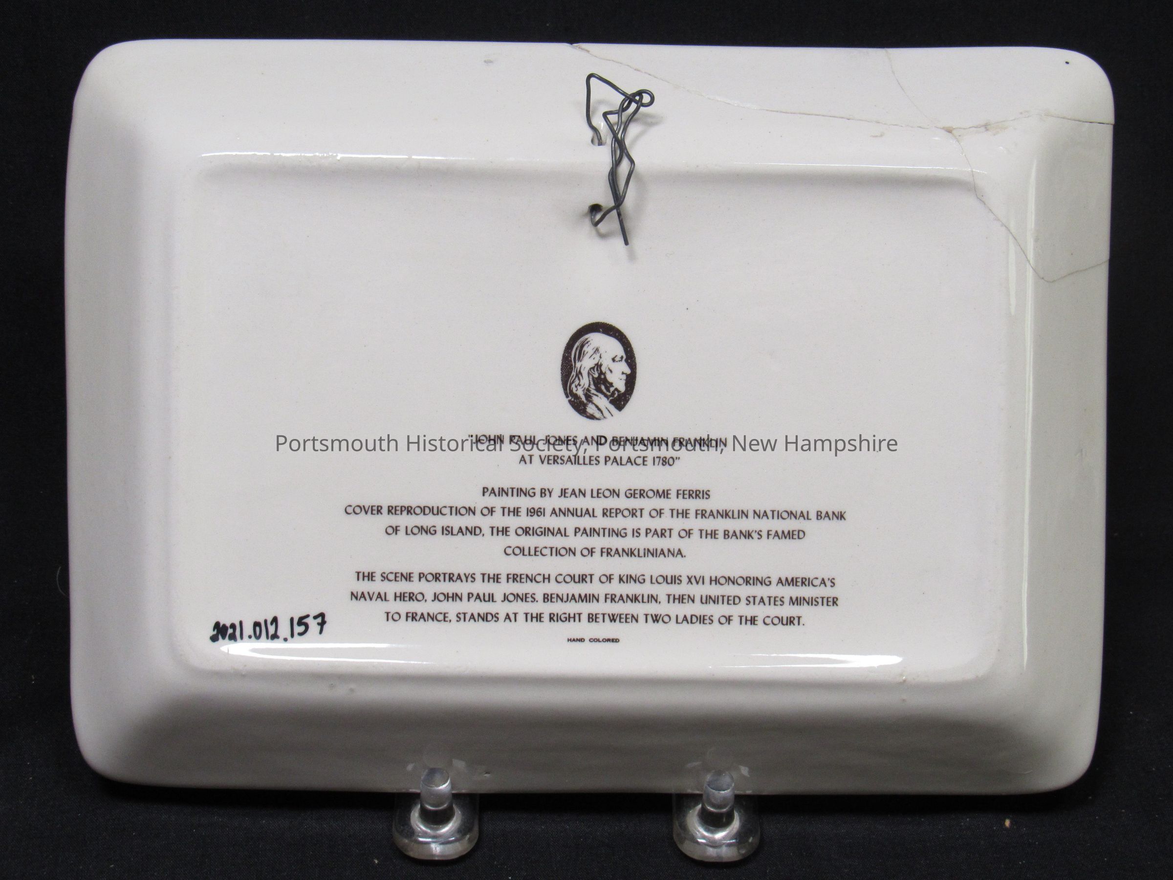 Tray, “John Paul Jones and Benjamin Franklin at Versailles Palace 1780,” 1960s. Ceramic; h. 1 in., w. 7 ½ in., d.5 ¼ in. Additional text on back: “Painting by Jean Leon Gerome Ferris, Cover Reproduction of the 1961 Annual Report of the Franklin National Bank of Long Island. The original painting is part of the Bank’s famed collection of Frankliniana. The Scene portrays the French court of King Louis XVI honoring America’s naval hero, John Paul Jones. Benjamin Franklin, then United States minister to France, stands at the right between two ladies of the court.”Acquisition
