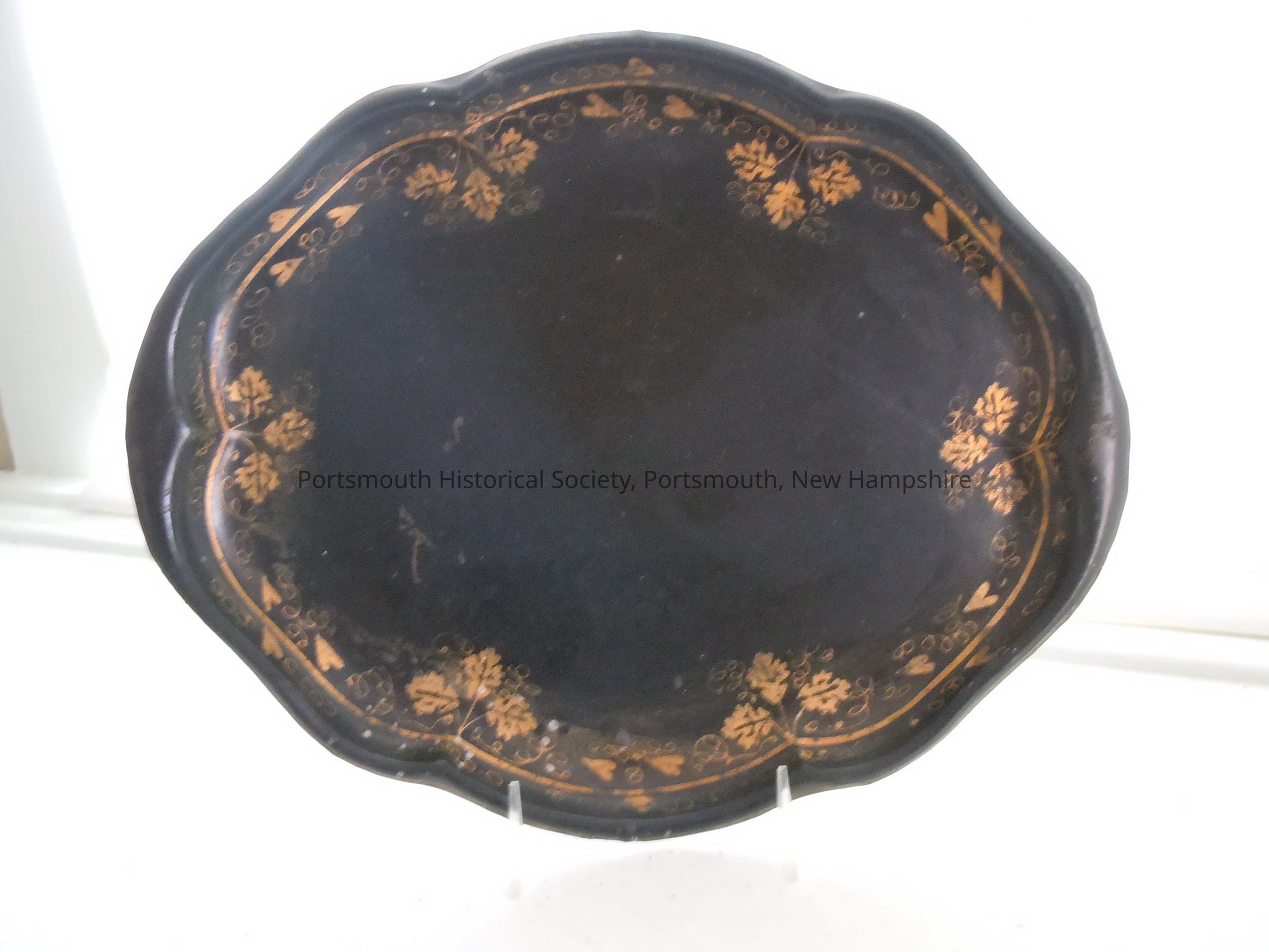 Small black painted tray with gold leaf and heart design.Acquisition