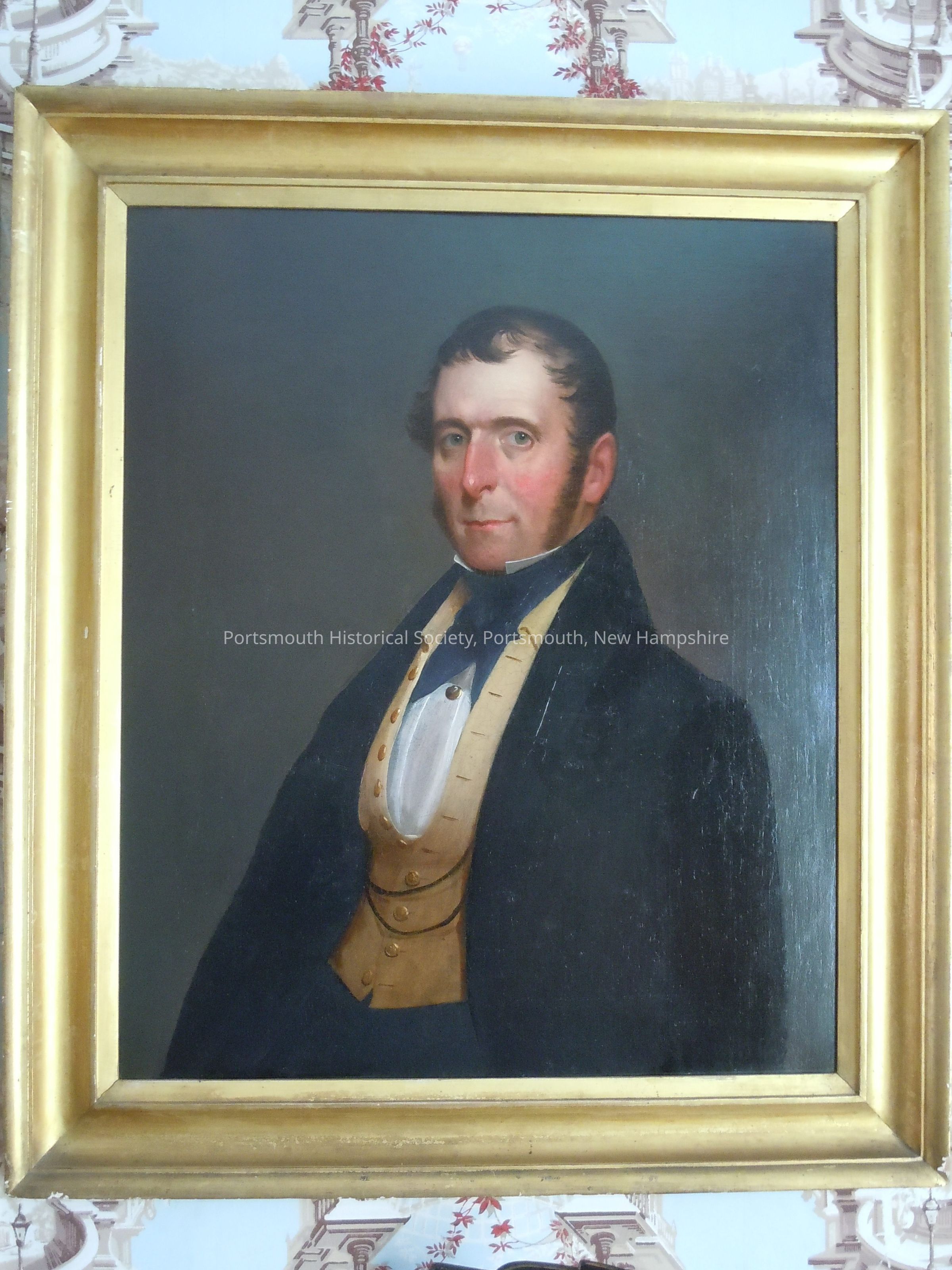 Oil painting of portrait of Captain Caleb Currier. Subject is wearing a dark colored suit with a gold vest and white shirt. Caleb Currier (1794-1851) was a captain in the United States Navy. Other objects related to the Currier family are in the collection.Acquisition