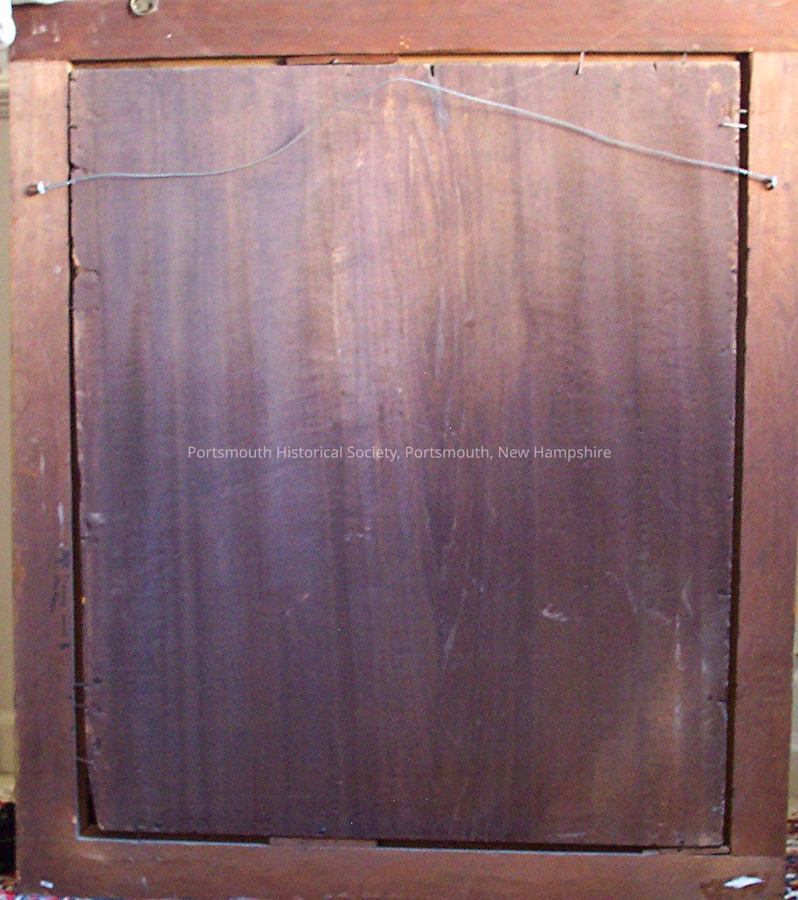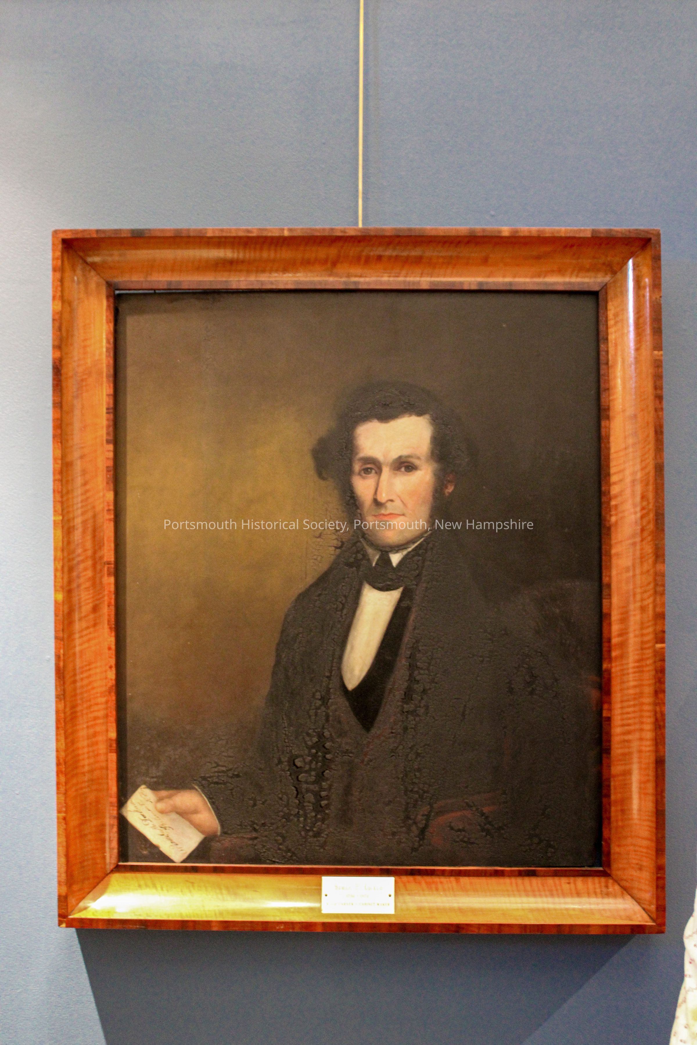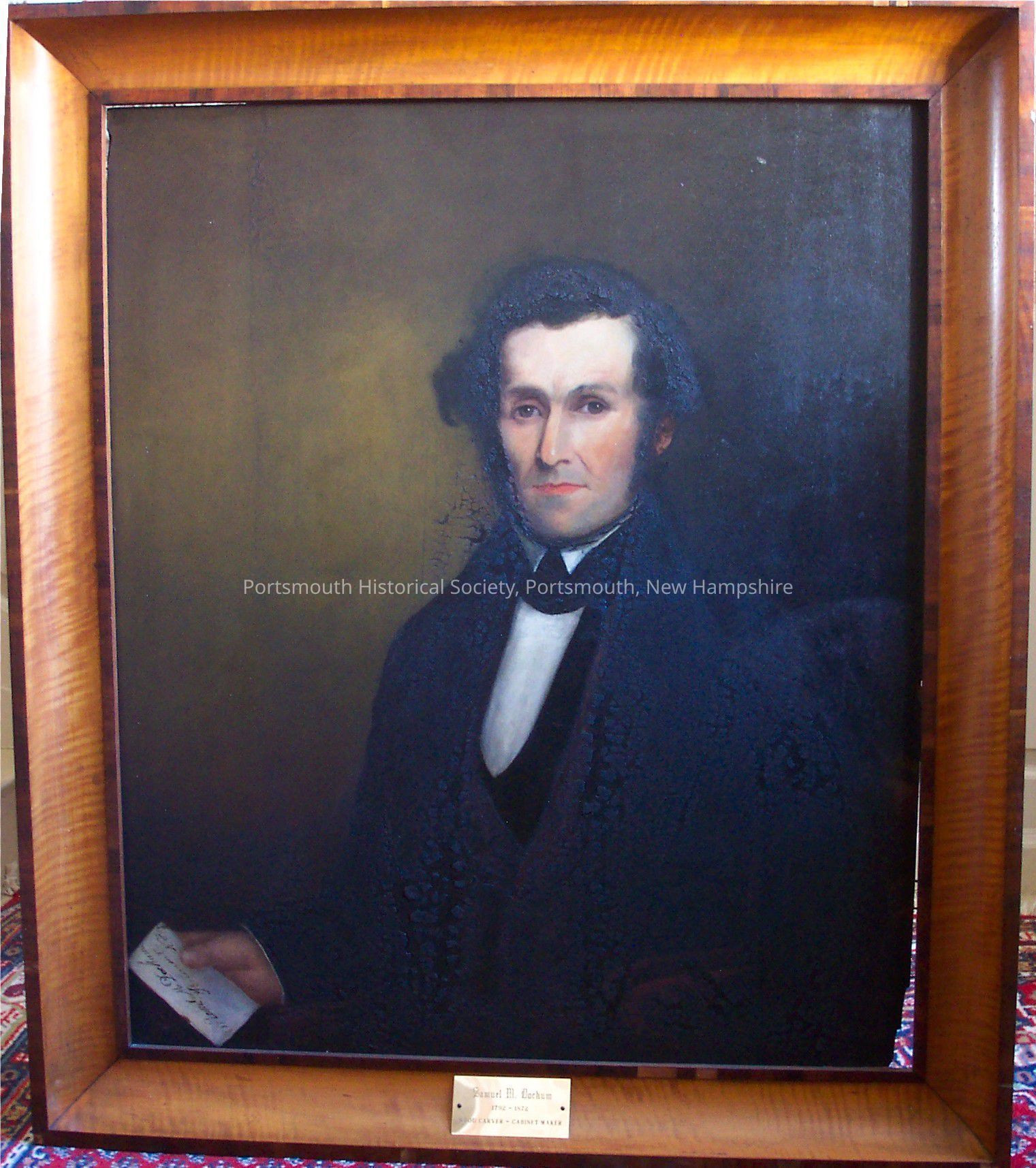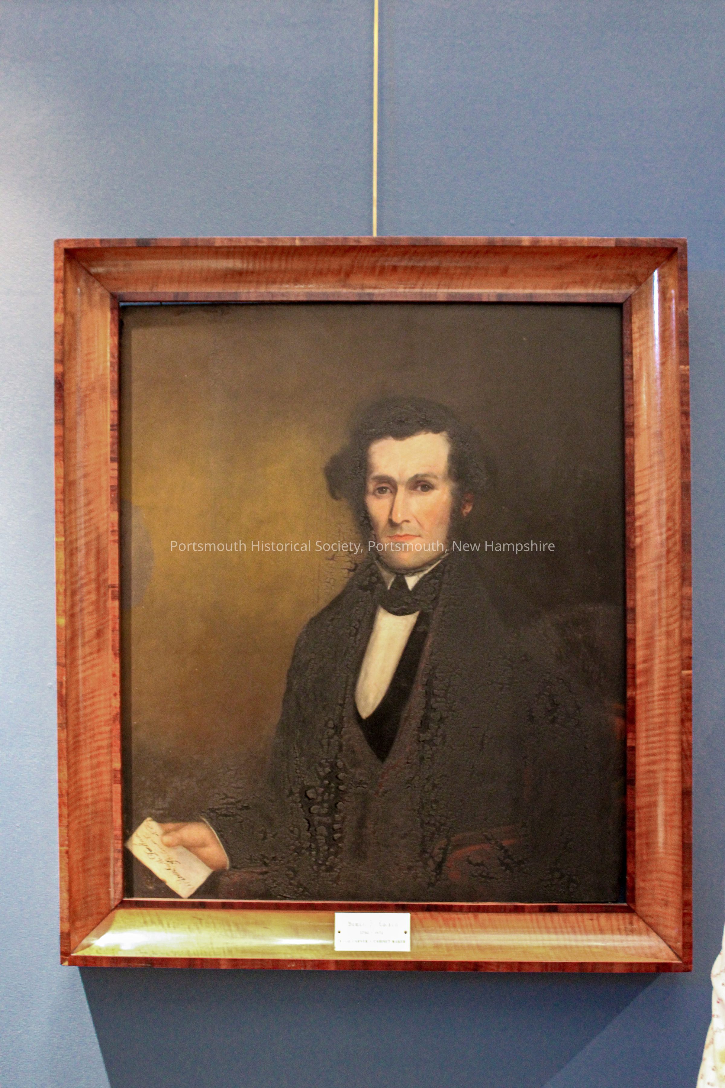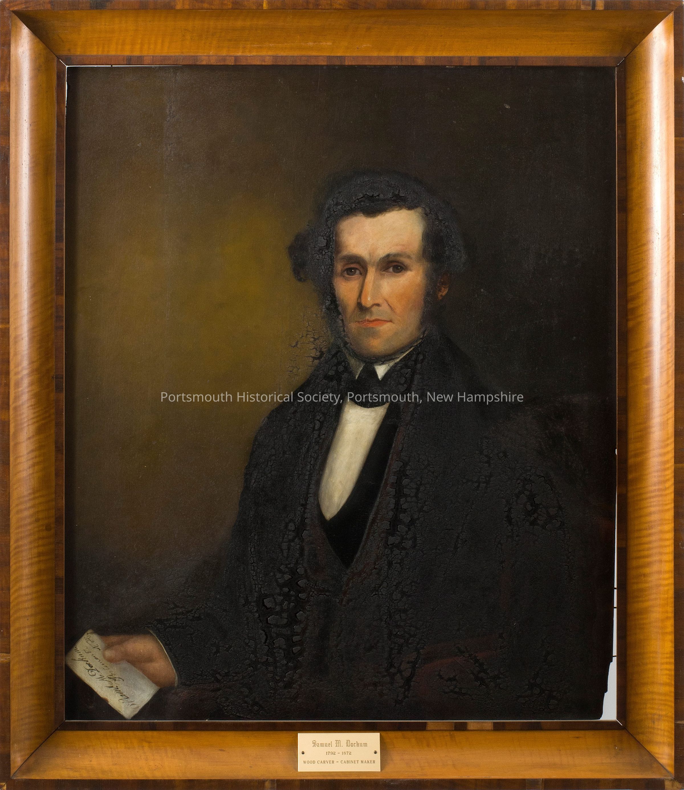 Framed oil painting of Samuel M. Dockum seated in a red upholstered arm chair, wearing a black jacket and waistcoat with a white shirt. He is holding a document. The portrait depicts one of Portsmouth’s most prolific cabinetmakers. Brass plate reading Samuel M. Dockum 1792-1872 woodcarver cabinetmaker. A companion portrait...Acquisition