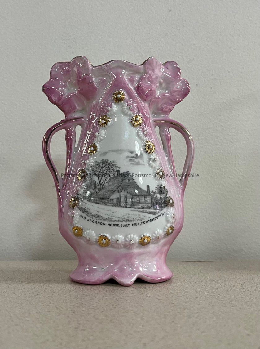 Small vase in pink and white with gold edging and accents, and house image in gray against white background, with small loop handles and wavy-edged top.Acquisition
