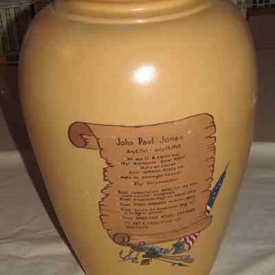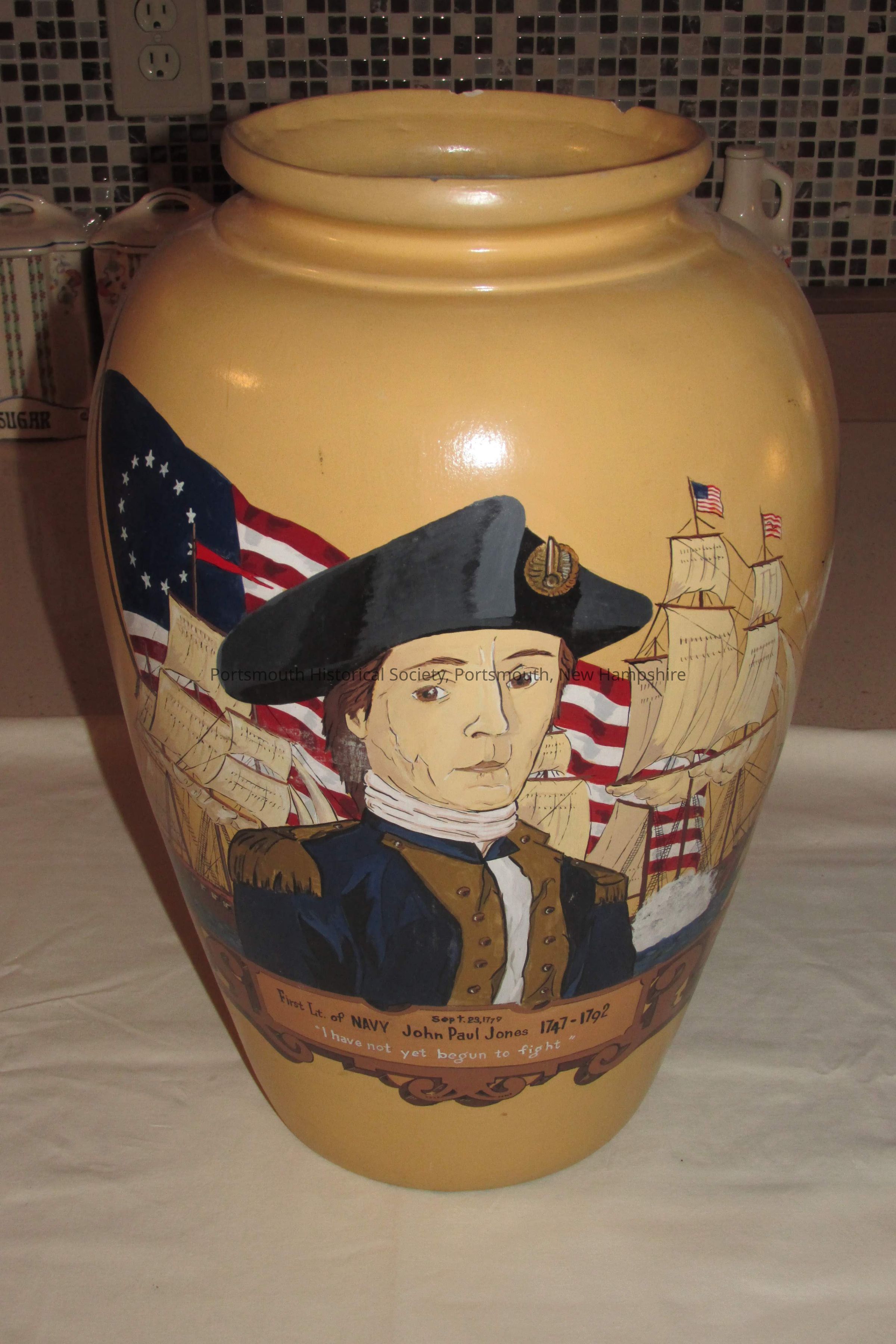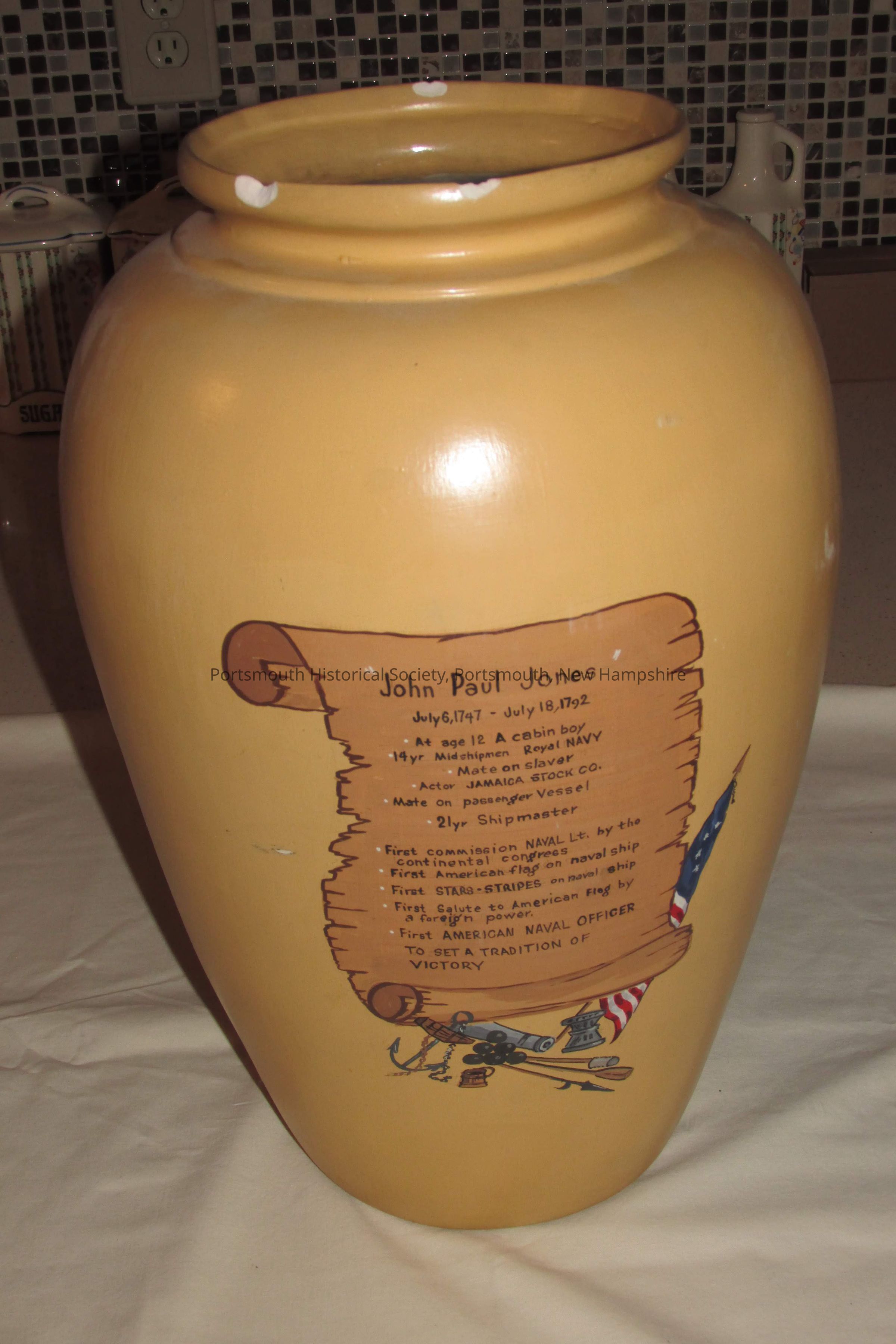 Large yellow ceramic vase or jar with painted polychrome image of John Paul Jones on the front with text below, with and biographical text on back. "76" incised on bottom.