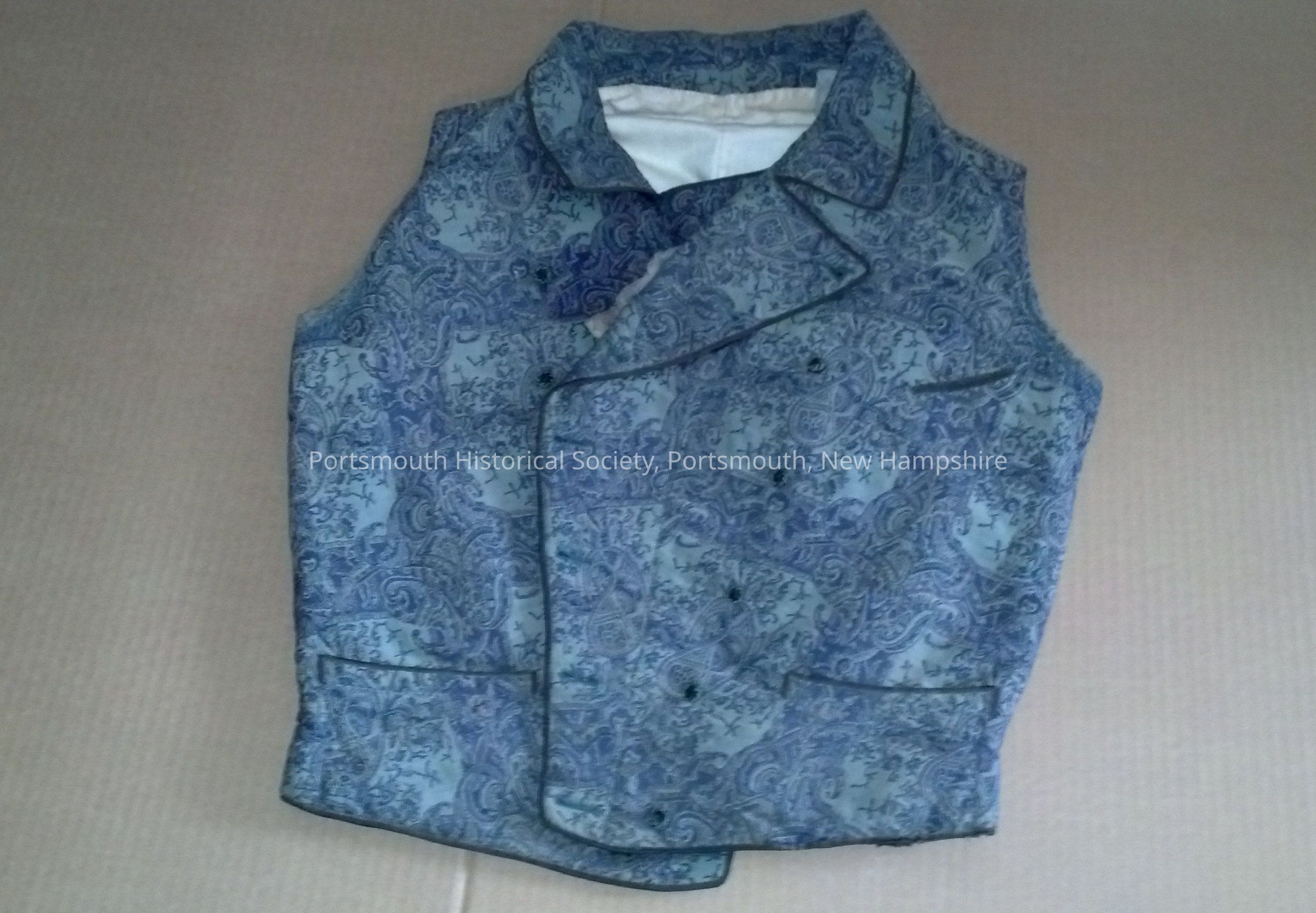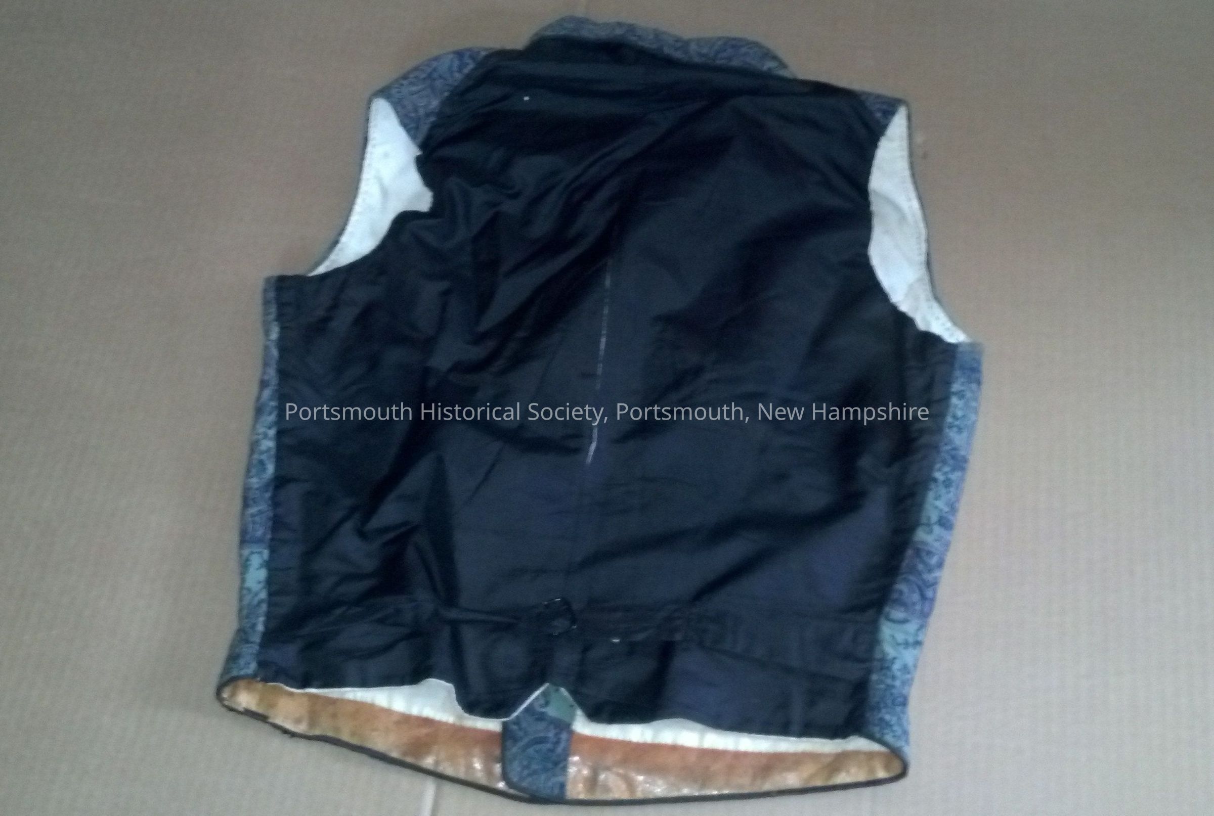 Green vest with blue, green, and peach paisley design. Vest has ten buttons, two pockets near waist, one pocket on chest. Back of the vest is black. Cream colored lining with some leather on bottom hem in two places. Some netting sewed into interior of vest under the left collar.