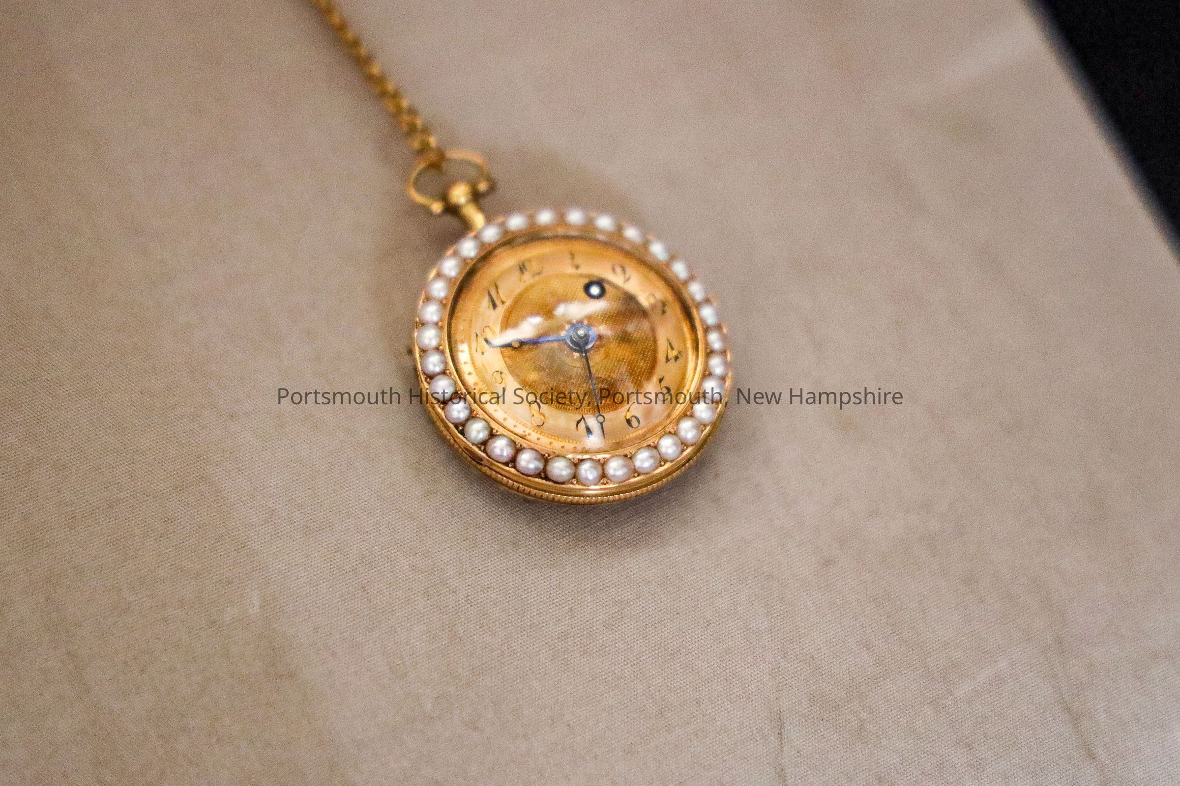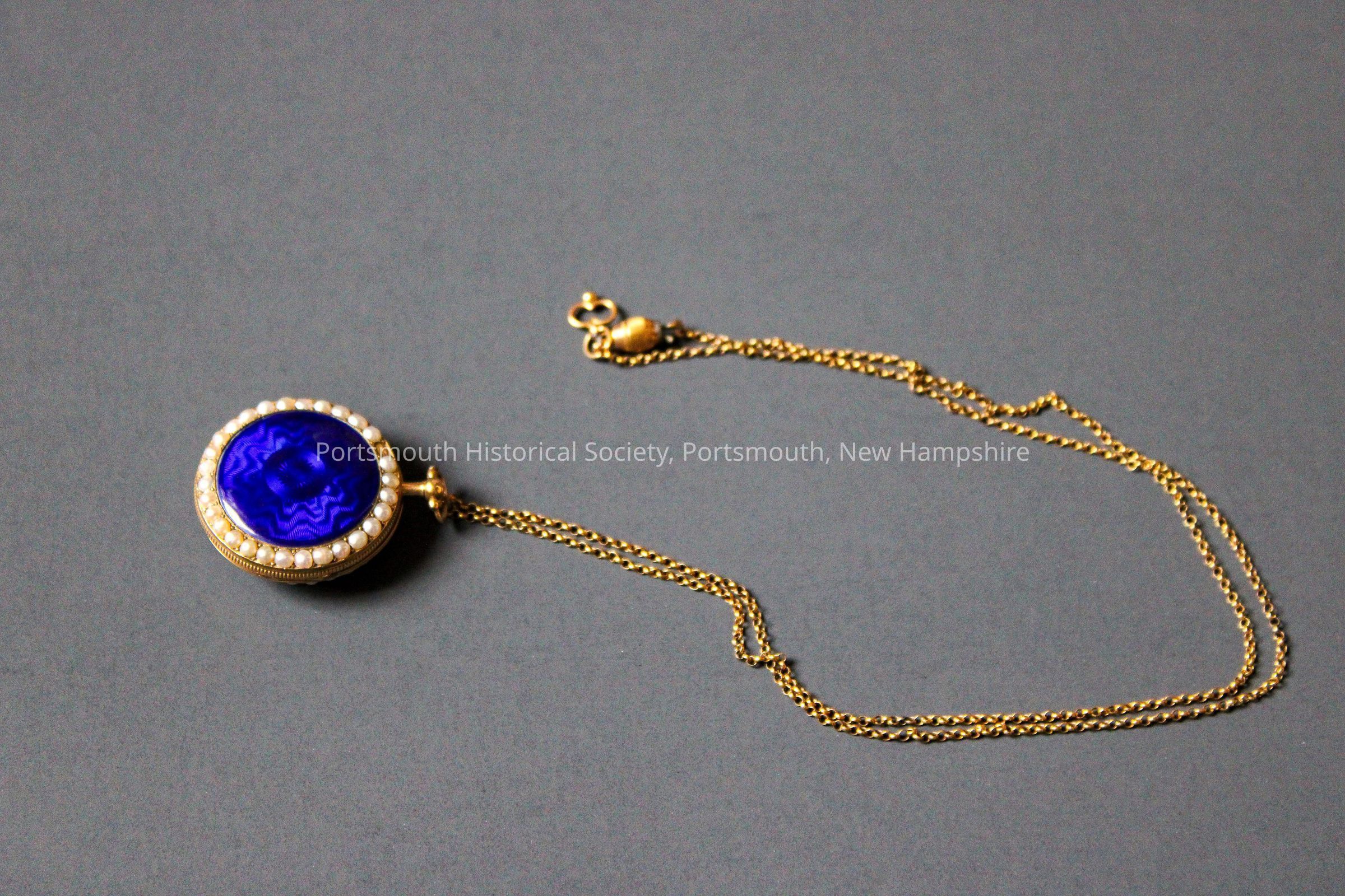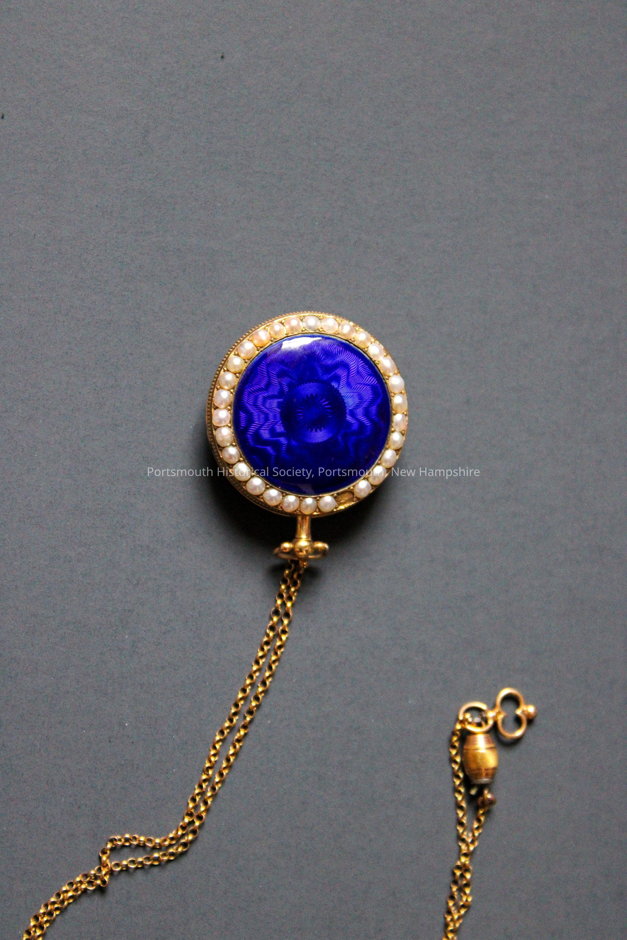 Blue enamel watch on gold chain, encircled with pearls. Small key attached to chain. In reddish/brown leather case.Acquisition