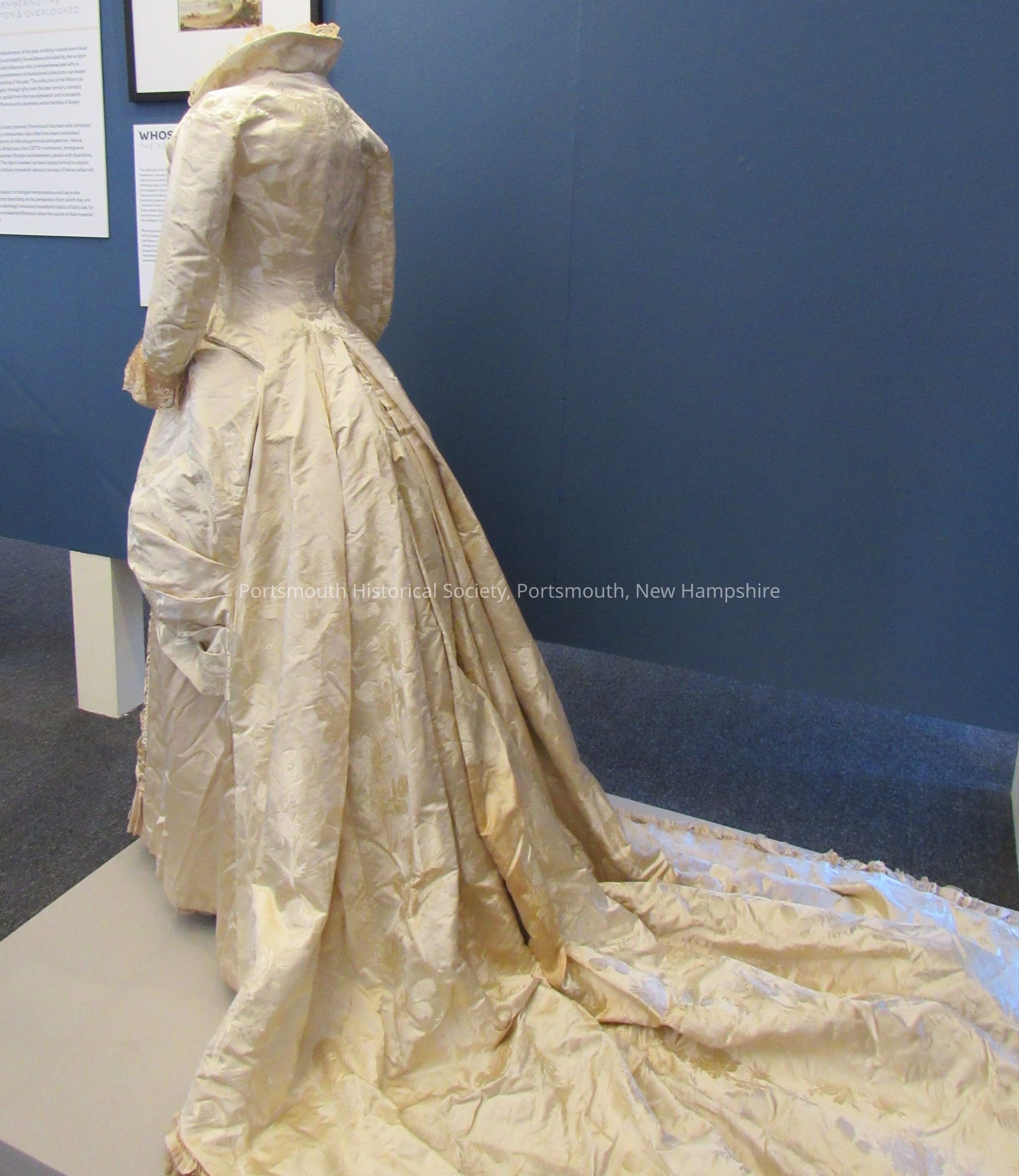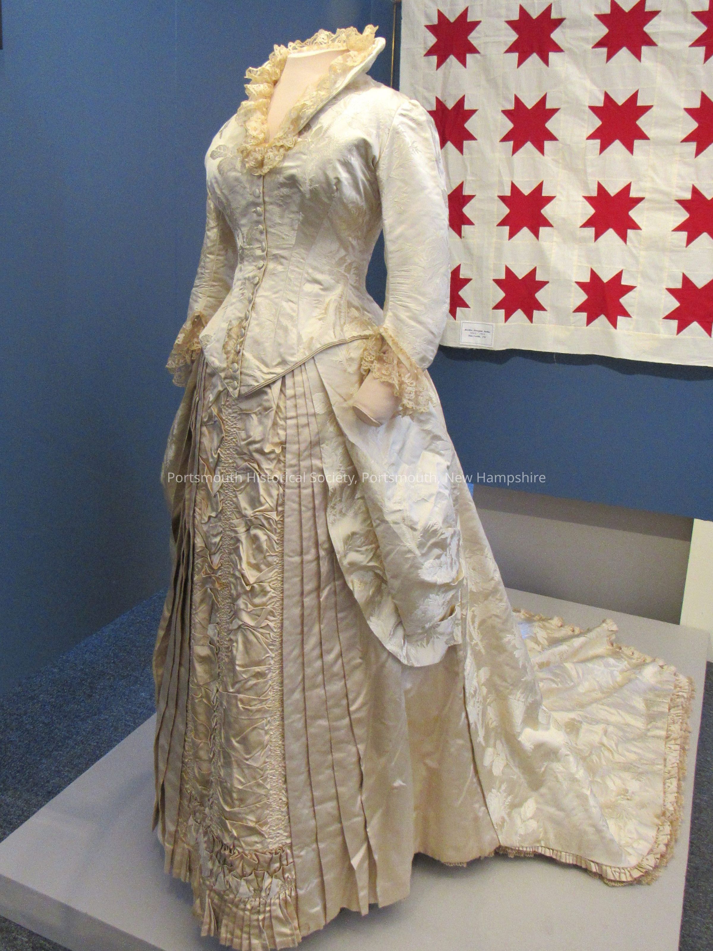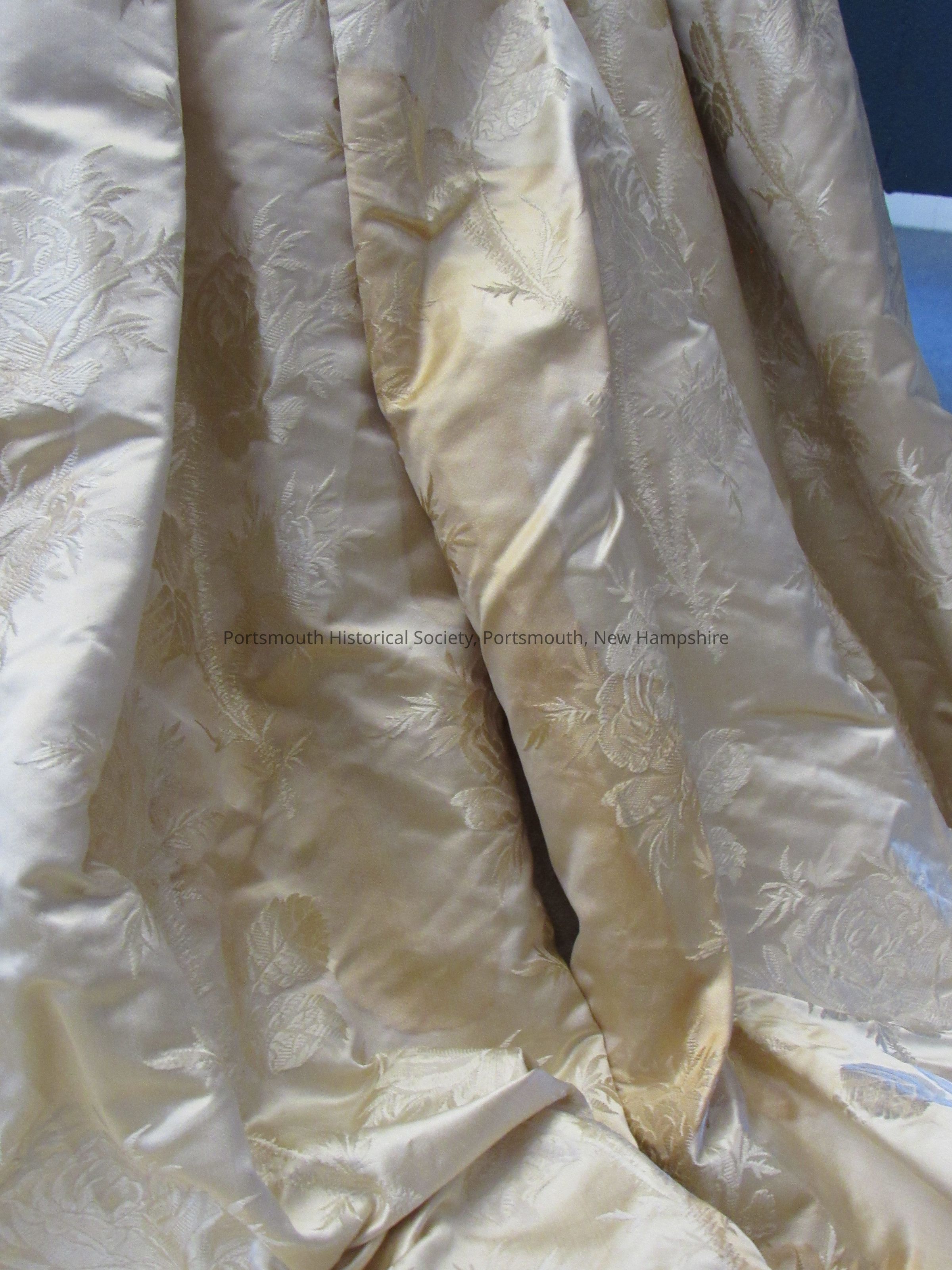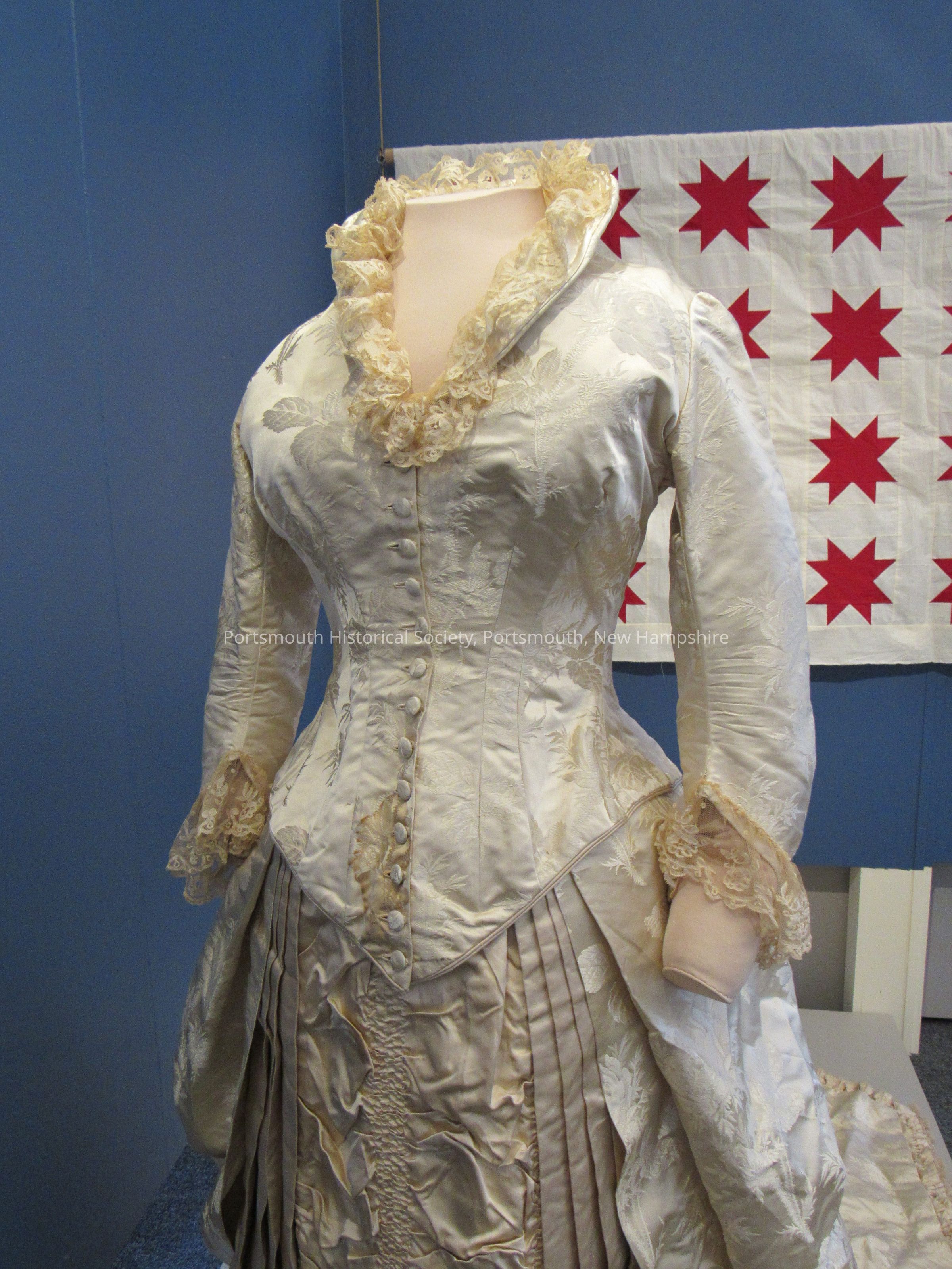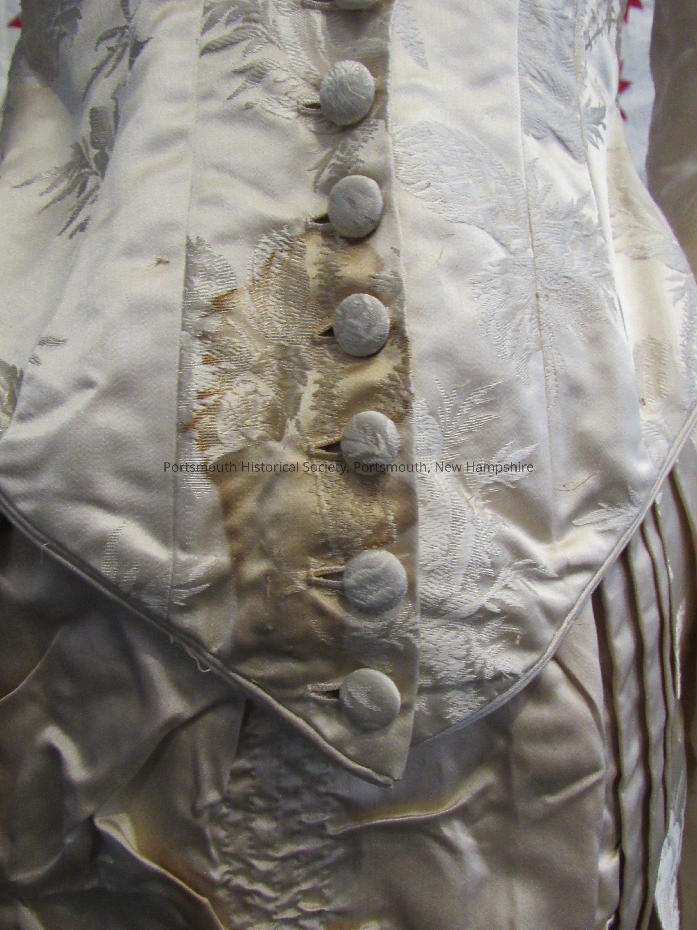 Wedding dress of Mrs. James Rundlet May. Dress is ivory silk with floral pattern in weave of fabric. There is a gathered ruffled panel on the front of the skirt with pleated sides and gathered bustle. There are silk covered buttons on the front and a lace collar. Matches lace veil, 132. Her wedding occurred in the John Paul Jones house.Acquisition